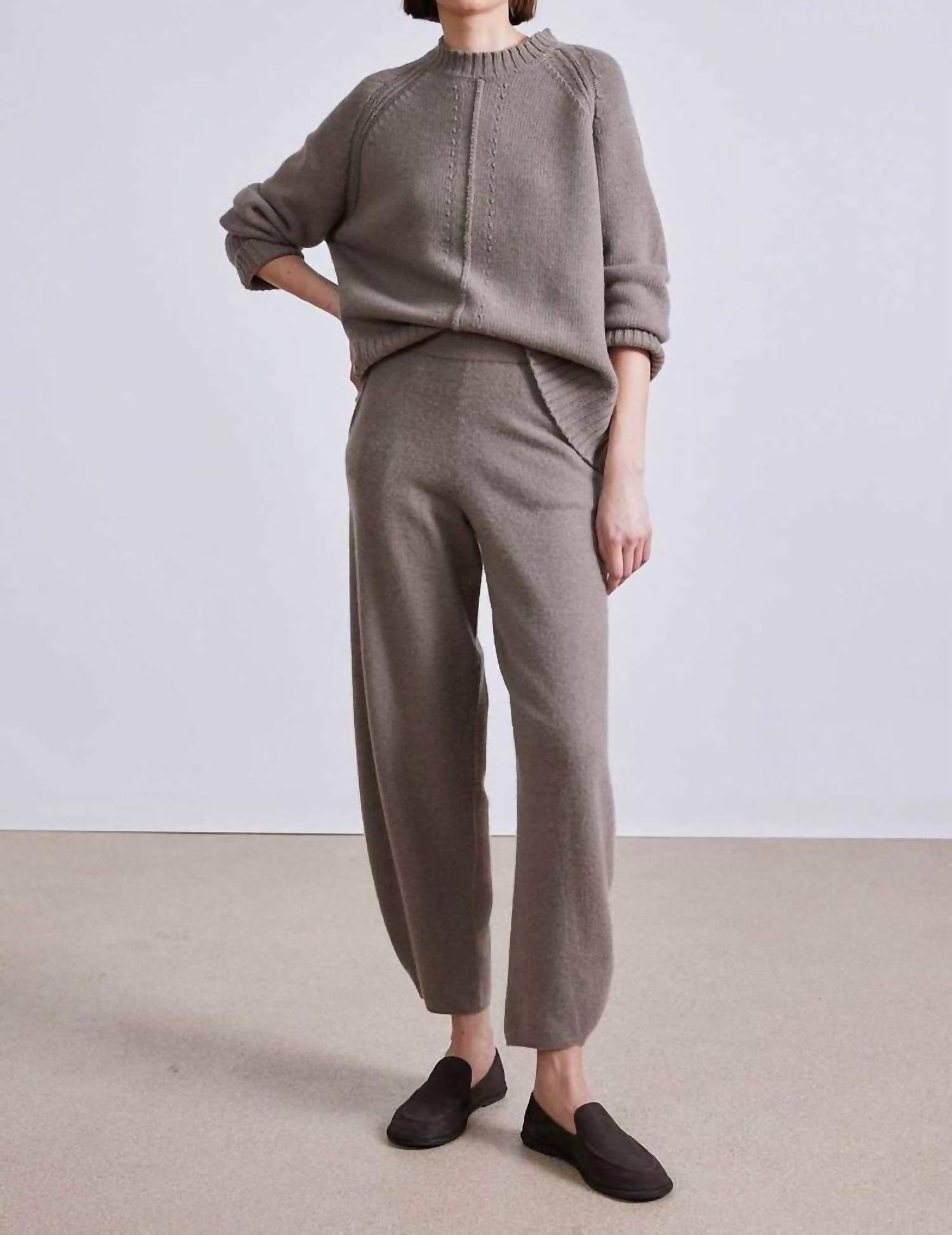 Enhance your wardrobe with this trendy cropped number, designed to blend style and practicality. The comfortable fit allows for easy all-day wear. The perfect length to pair with your favorite mules. Elevate your travel wardrobe with the Bari Knit Pant by APIECE APART, crafted from a luxurious blend of 90% Ultrafine Merino and 10% Cashmere in a sophisticated camel hue. These high-rise pants feature a comfortable fit with a tapered leg and a convenient pull-on closure. Ideal for a monochrome spring ensemble, their solid pattern makes them a versatile choice for Thanksgiving gatherings or any occasion. Care for them by dry cleaning to maintain their refined look, ensuring you're always ready for stylish travels.