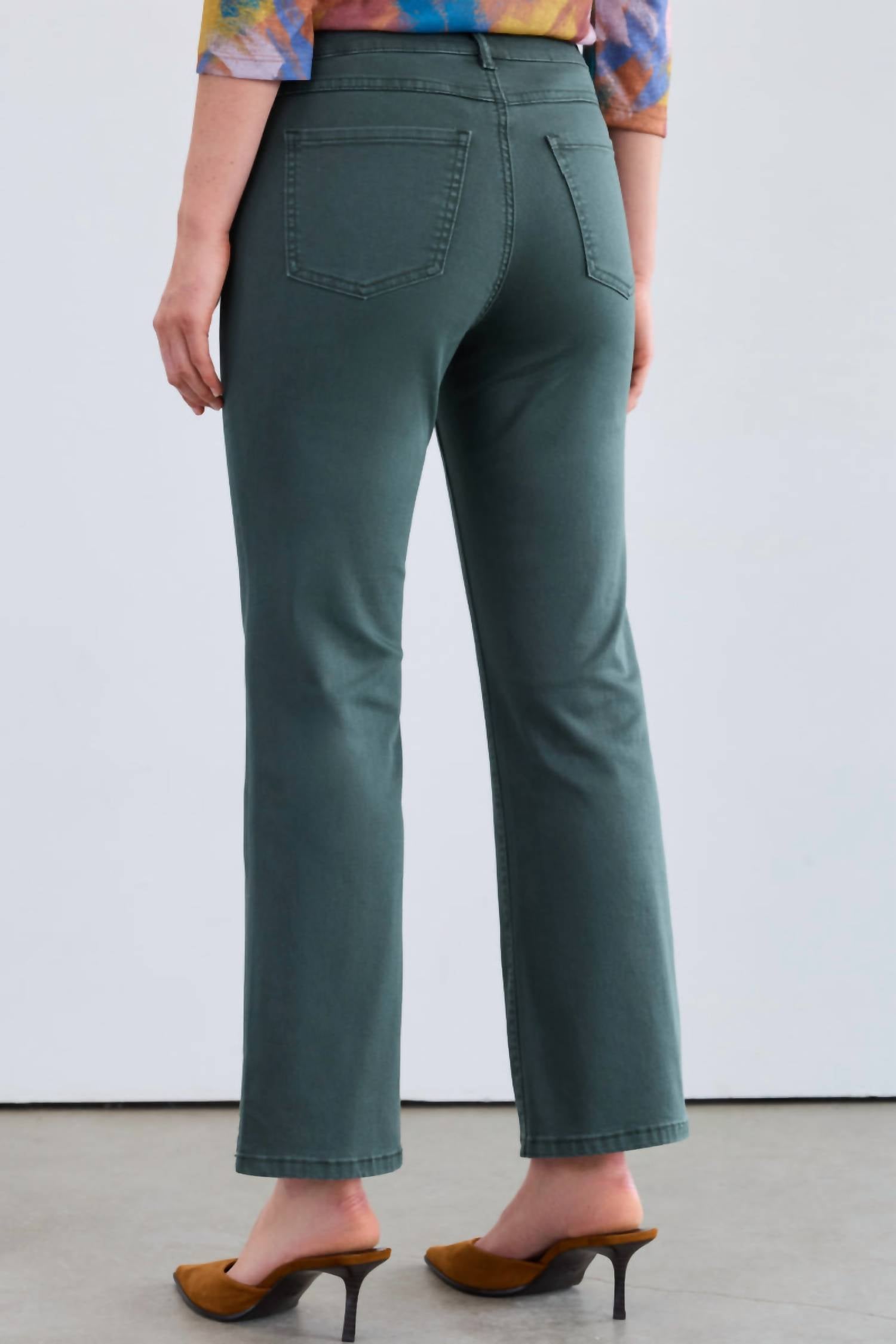 Upgrade your wardrobe with these cropped pants, designed to merge sophistication and wearability. The tailored fit ensures ultimate comfort during long days or nights out. Introducing the Olivia Ankle Bootcut Denim Jeans by FDJ in a lush Spruce hue, perfect for adding a sophisticated touch to your spring ensemble. These jeans feature a flattering mid-rise with a 9" rise and a 28" inseam, crafted from a premium blend of 89% Cotton, 10% Polyester, and 1% Elastane for comfort and flexibility. The polished bootcut leg and solid pattern offer a relaxed fit, enhanced by a button closure for a secure fit. Designed for easy care, they can be machine washed cold, inside out, and hung to dry, with ironing on the reverse at low temperature.