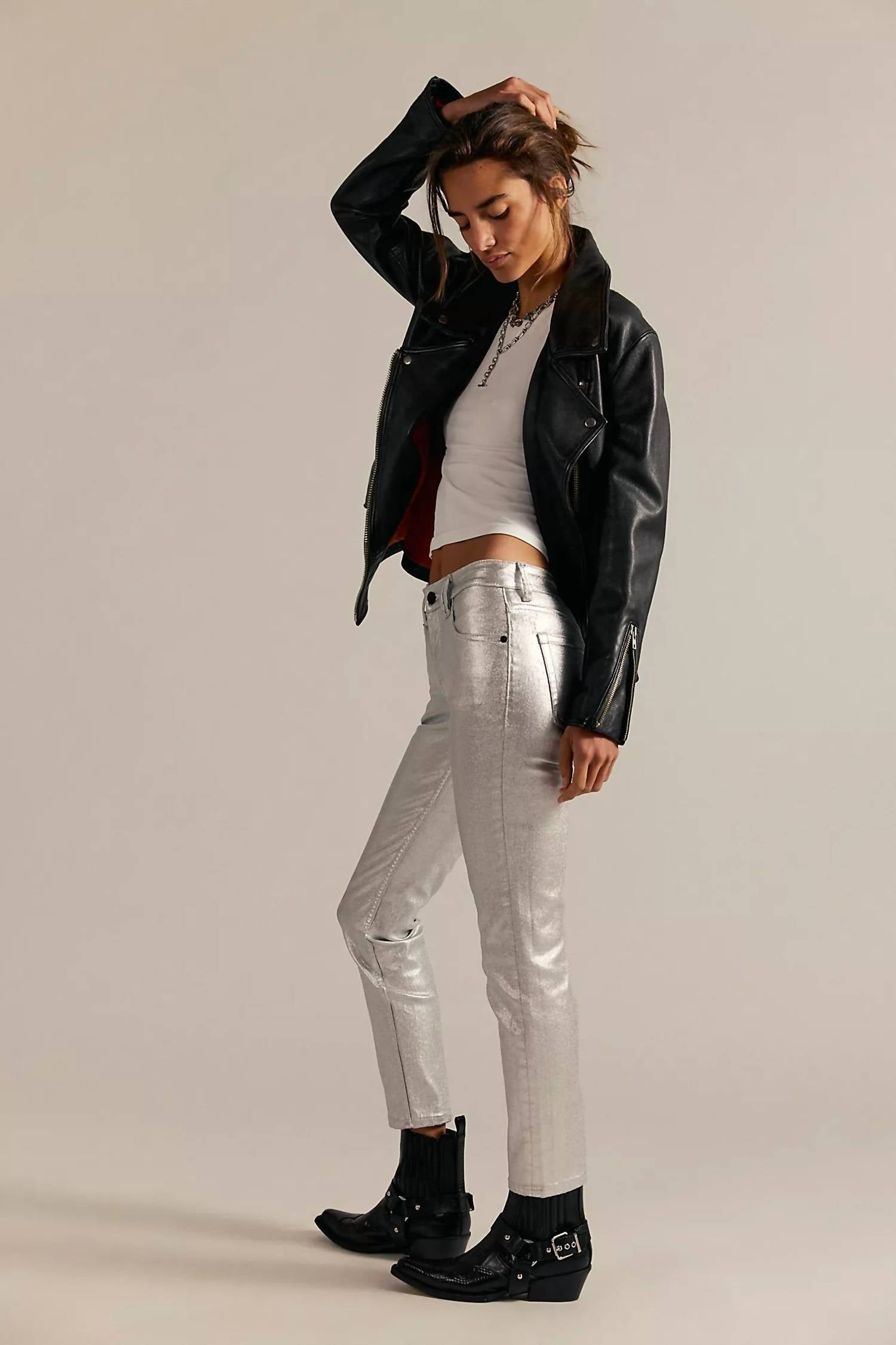 Stay on-trend and showcase your impeccable taste with these adaptable and stylish cropped pants. The perfect length to wear with your favorite mules. You'll love the fit! Introducing the Oracle Metallic Pant by Free People, a show-stopping piece in stunning silver. These pants are crafted with a metallic denim fabrication, providing a unique twist to a classic low-rise, slim straight fit. Featuring a convenient zip fly and button closure, alongside a functional five-pocket design, they're perfect for holiday parties and maximalist fashion. For best care, opt for machine washing and line drying. Please note, this style runs small; consider sizing up for the best fit.