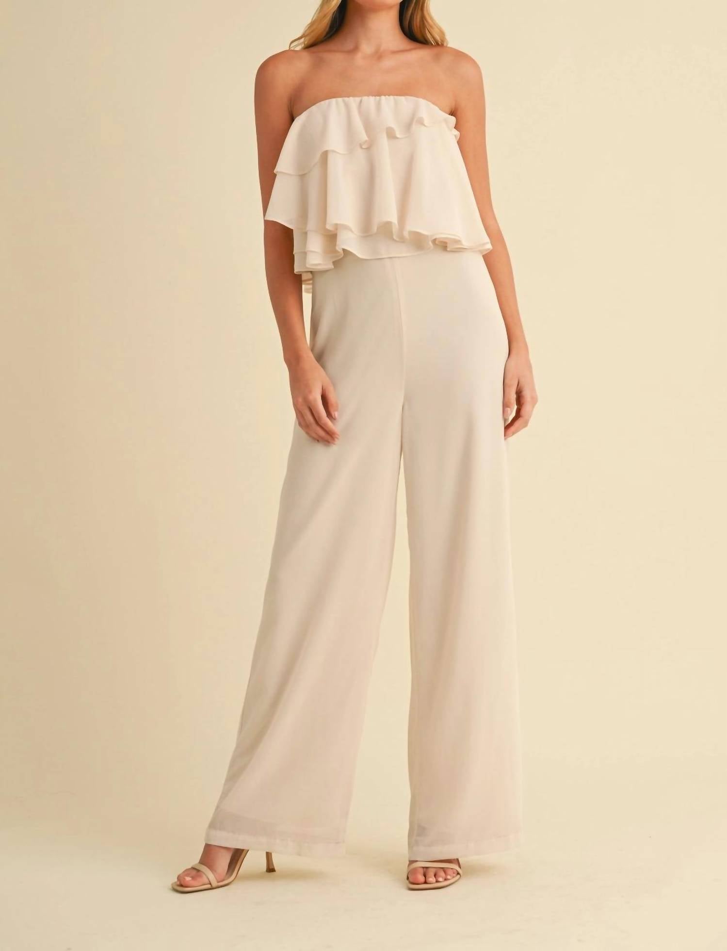Stay on-trend and showcase your impeccable taste with these adaptable and stylish cropped pants. The perfect length to wear with your favorite mules. You'll love the fit! Introducing the Beige Chiffon Tube Jumpsuit by Klesis, perfect for your summer vacation wardrobe. This women's jumpsuit showcases a ruffled tube top and wide, relaxed-fit straight leg pants designed for a flattering high-rise waist. Crafted from solid chiffon, it offers a chic monochrome look with a convenient pull-on closure. To maintain its elegance, dry clean only.