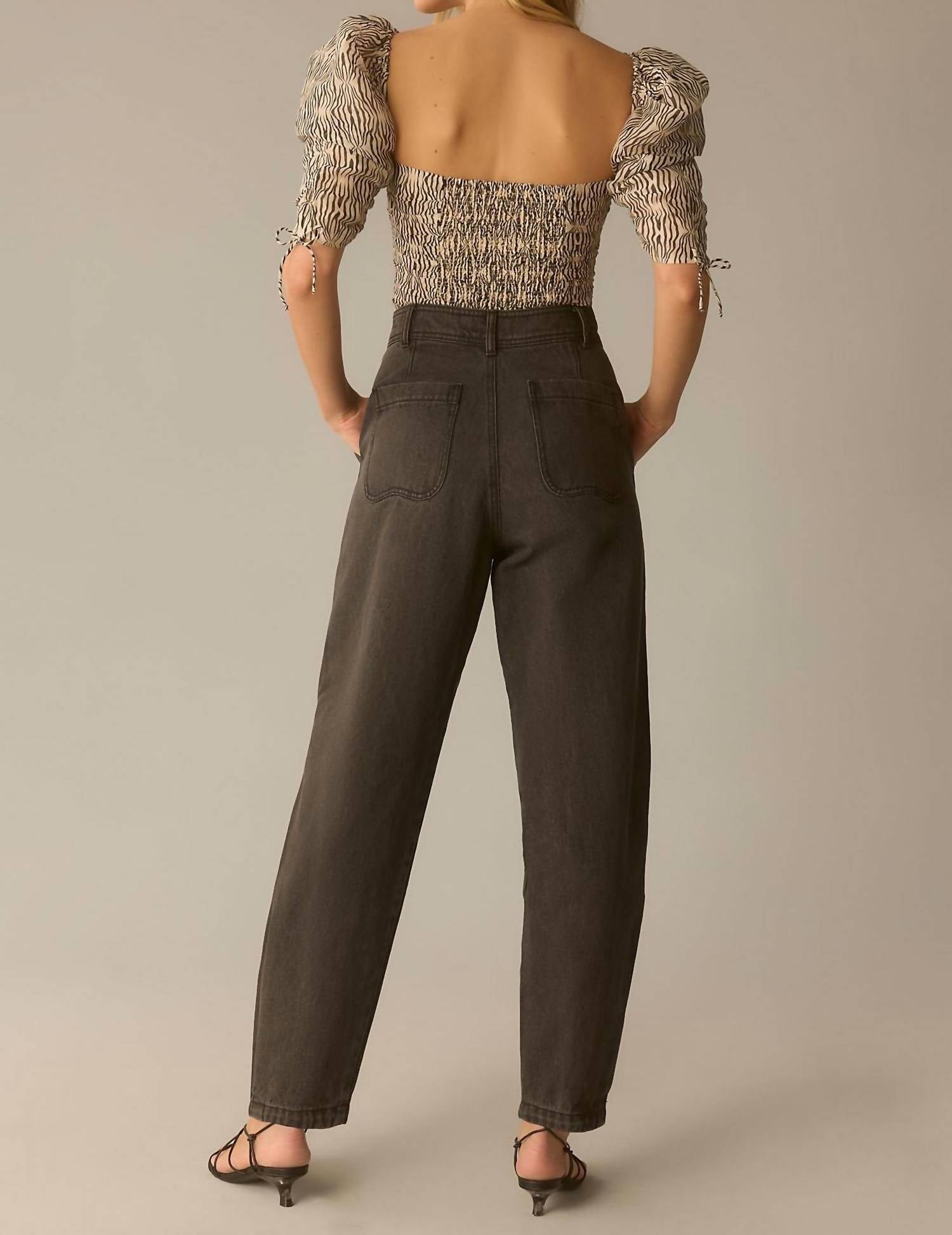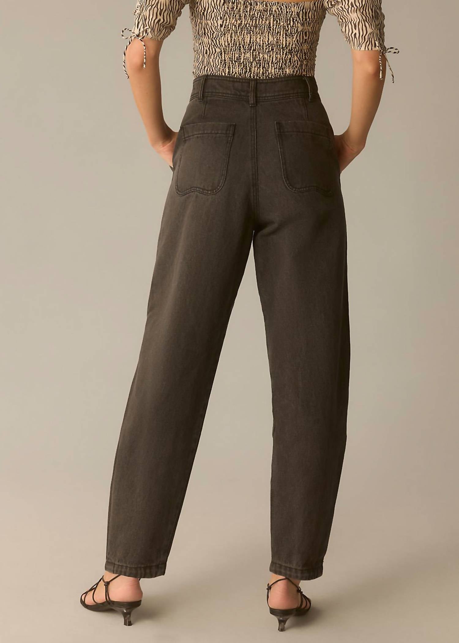Stay on-trend and showcase your impeccable taste with these adaptable and stylish cropped pants. The perfect length to wear with your favorite mules. You'll love the fit! Introducing the Emmeline Cotton Jeans by MAGALI PASCAL, designed for the fashion-forward woman seeking elegance and comfort. These off black jeans boast a high-rise waist and a classic fit with a tapered leg silhouette accentuated by front pleats. Crafted from 100% cotton, they feature a convenient button and zip closure, as well as a chic 4-pocket style with buttons on the hem for a textured feel. Care is easy with machine wash and line dry instructions, ensuring they are a durable addition to your streetwear collection.