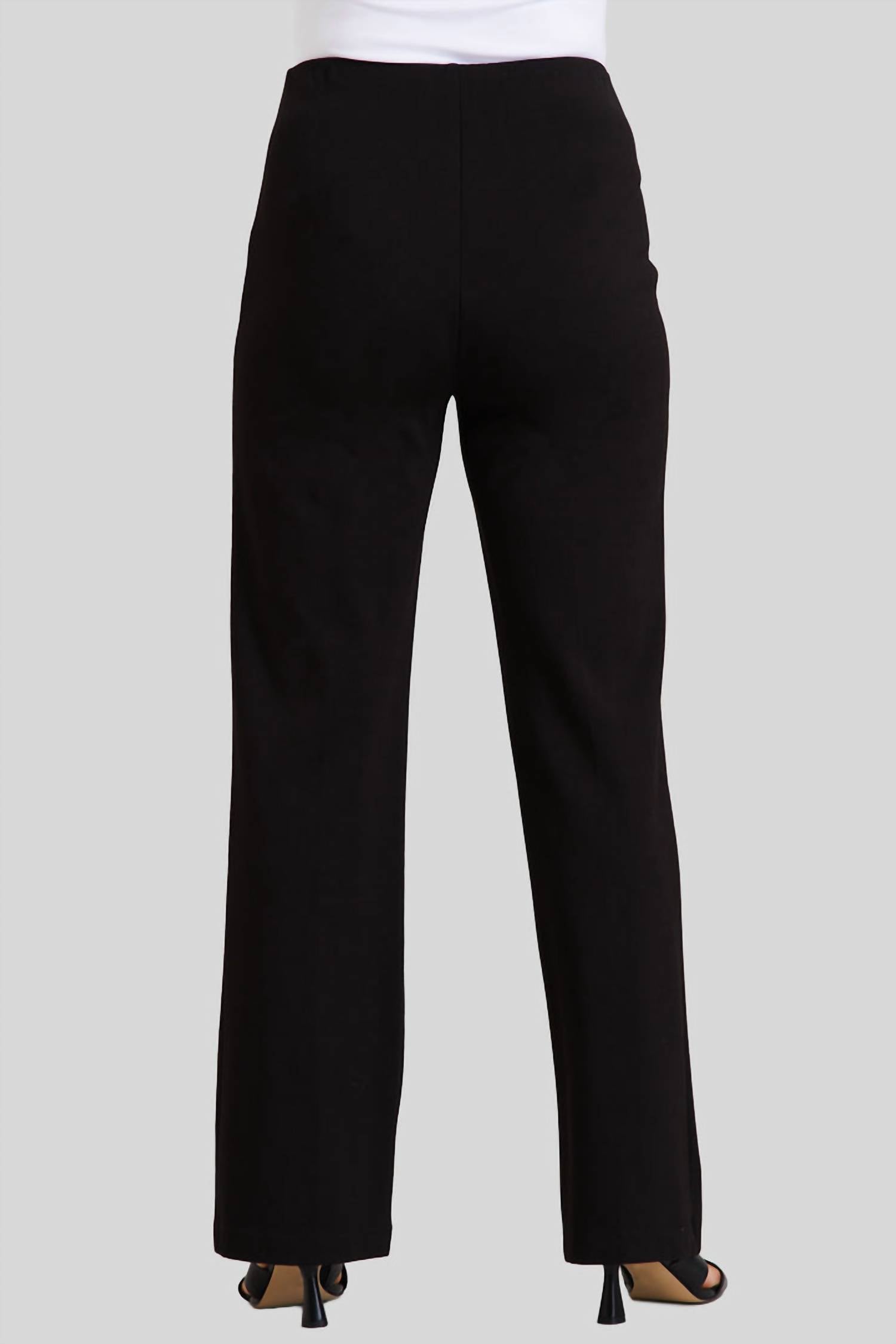 Stay on-trend and showcase your impeccable taste with these adaptable and stylish cropped pants. The perfect length to wear with your favorite mules. You'll love the fit! Introducing the Ella Paramount Knit Pants by PEACE of CLOTH, an elegant option crafted for contemporary style in versatile black. These pants feature a mid-rise fit and pull-on style for easy wear, complemented by a cropped length and flared hem with a 27" inseam ideal for showcasing your footwear. Made in a luxurious blend of 62% Viscose, 33% Nylon, and 5% Spandex, these pants offer a relaxed, stylish fit with functional back pockets. Care instructions include machine washing and line drying, making them both practical and fashionable for your fall wardrobe.