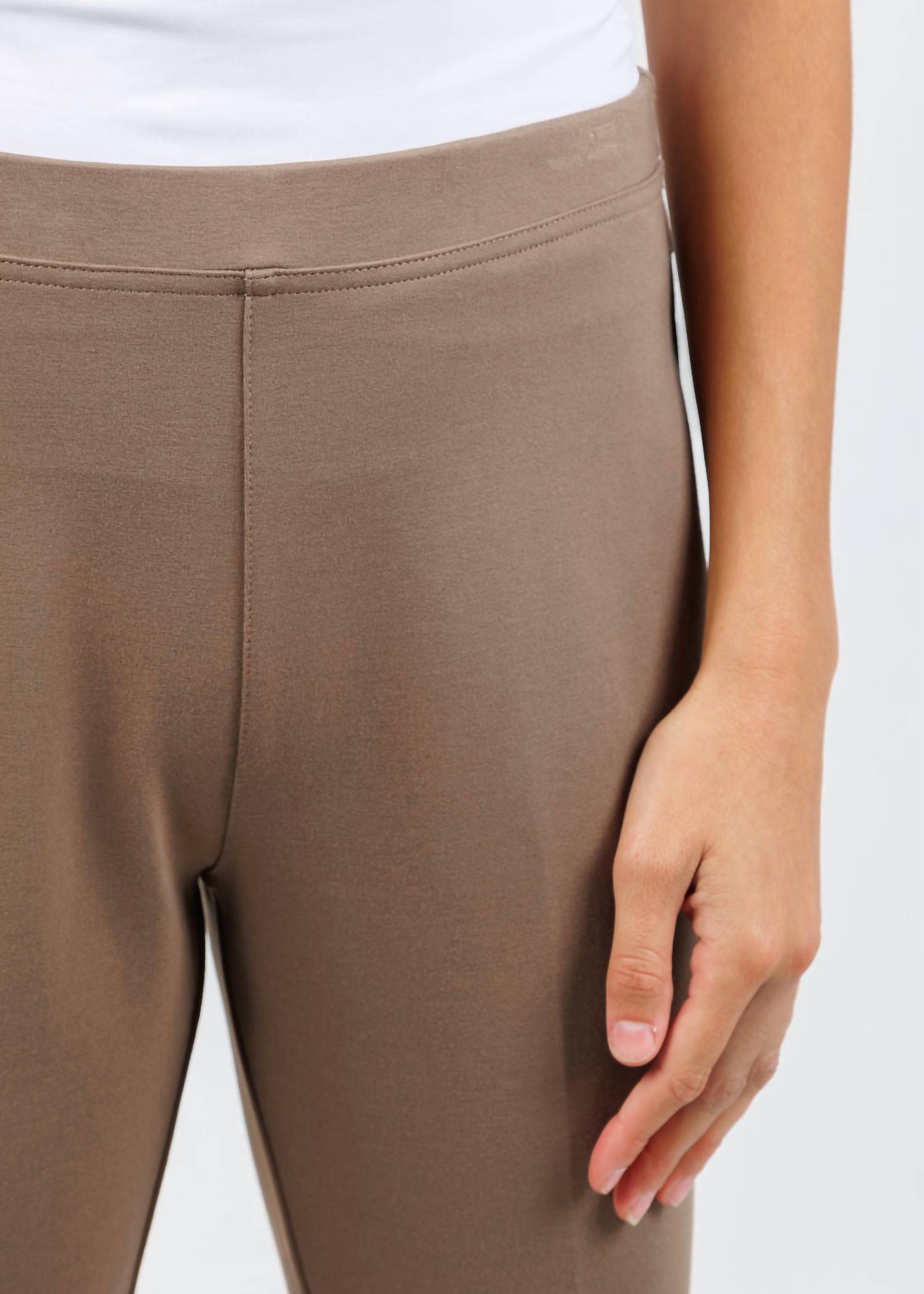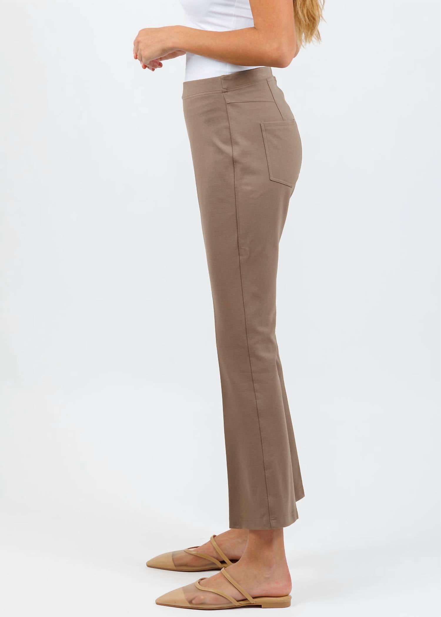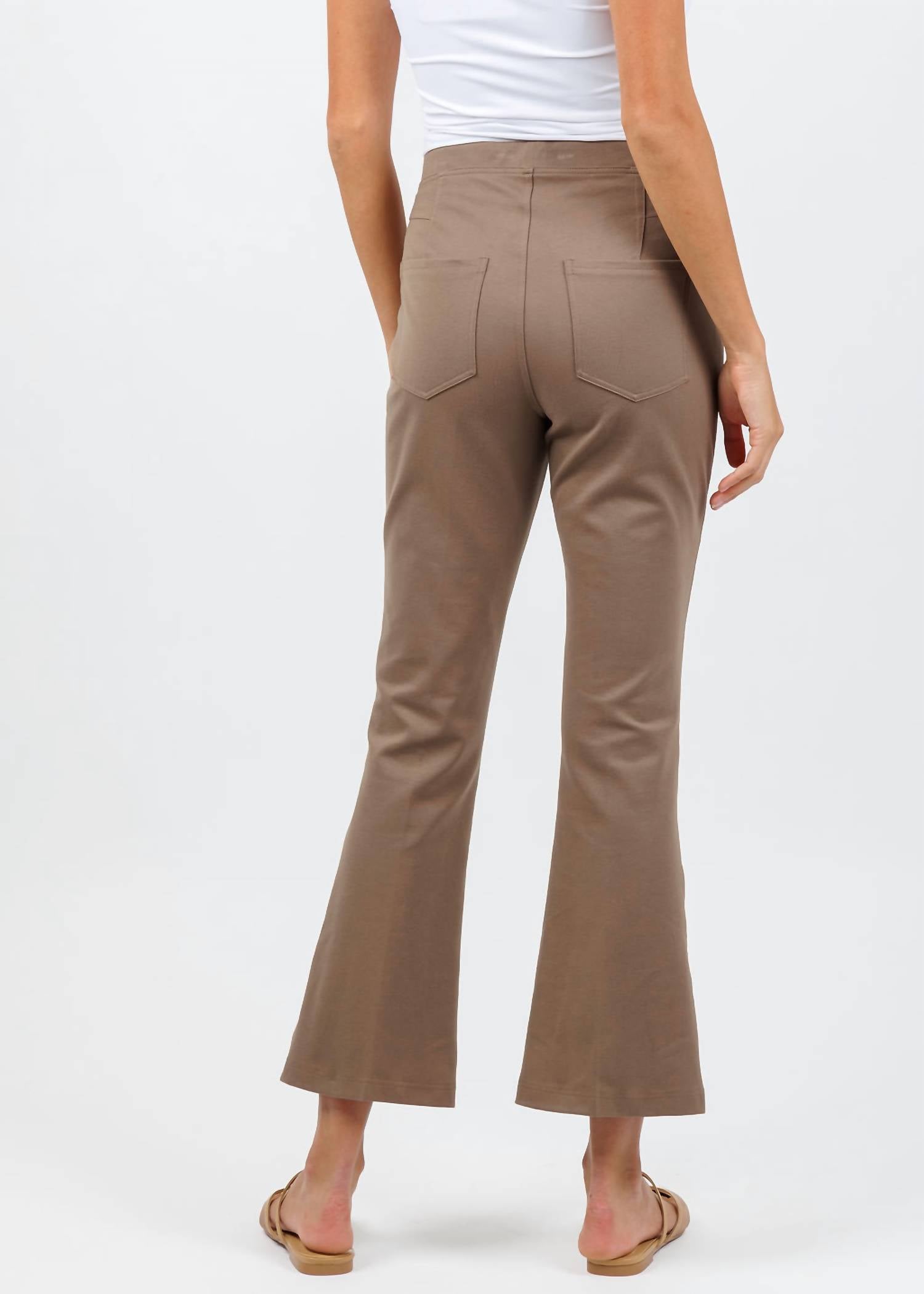 Upgrade your wardrobe with these cropped pants, designed to merge sophistication and wearability. The tailored fit ensures ultimate comfort during long days or nights out. Elevate your wardrobe with the Peace of Cloth Women's Ella Paramount Knit Pants in Mocha, featuring a modern cropped length with a flared hem. These pants offer a luxurious wear with their 62% Viscose, 33% Nylon, 5% Spandex composition. Designed with functionality, they have a flattering mid-rise fit and come equipped with functional back pockets. The pull-on style ensures ease of wear, and the inseam measures 27", perfect for spotlighting your favorite shoes. Model is wearing size XS (Madeline: 5'10" tall, 33" bust, 23" waist, 33.5" hips).
