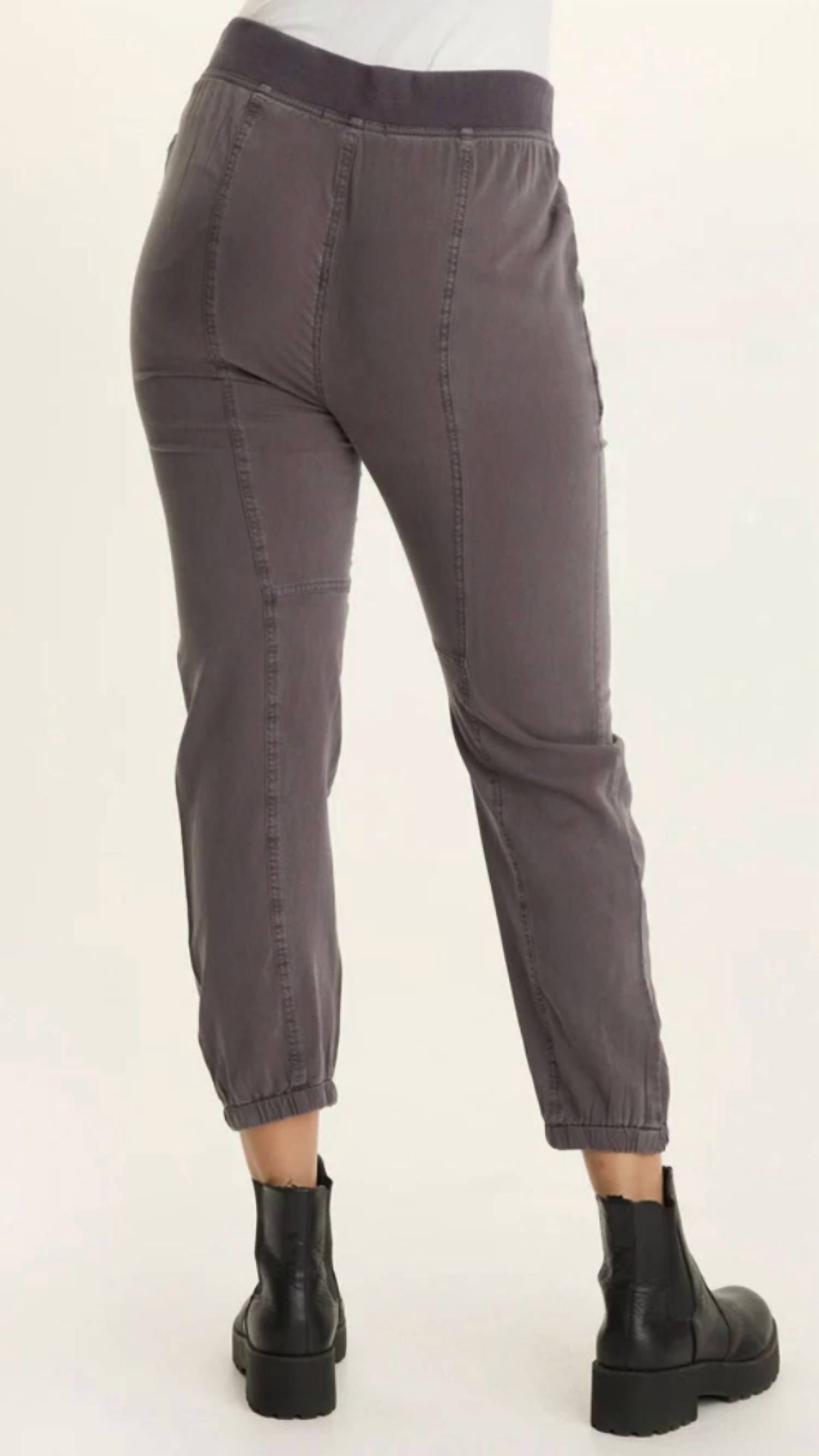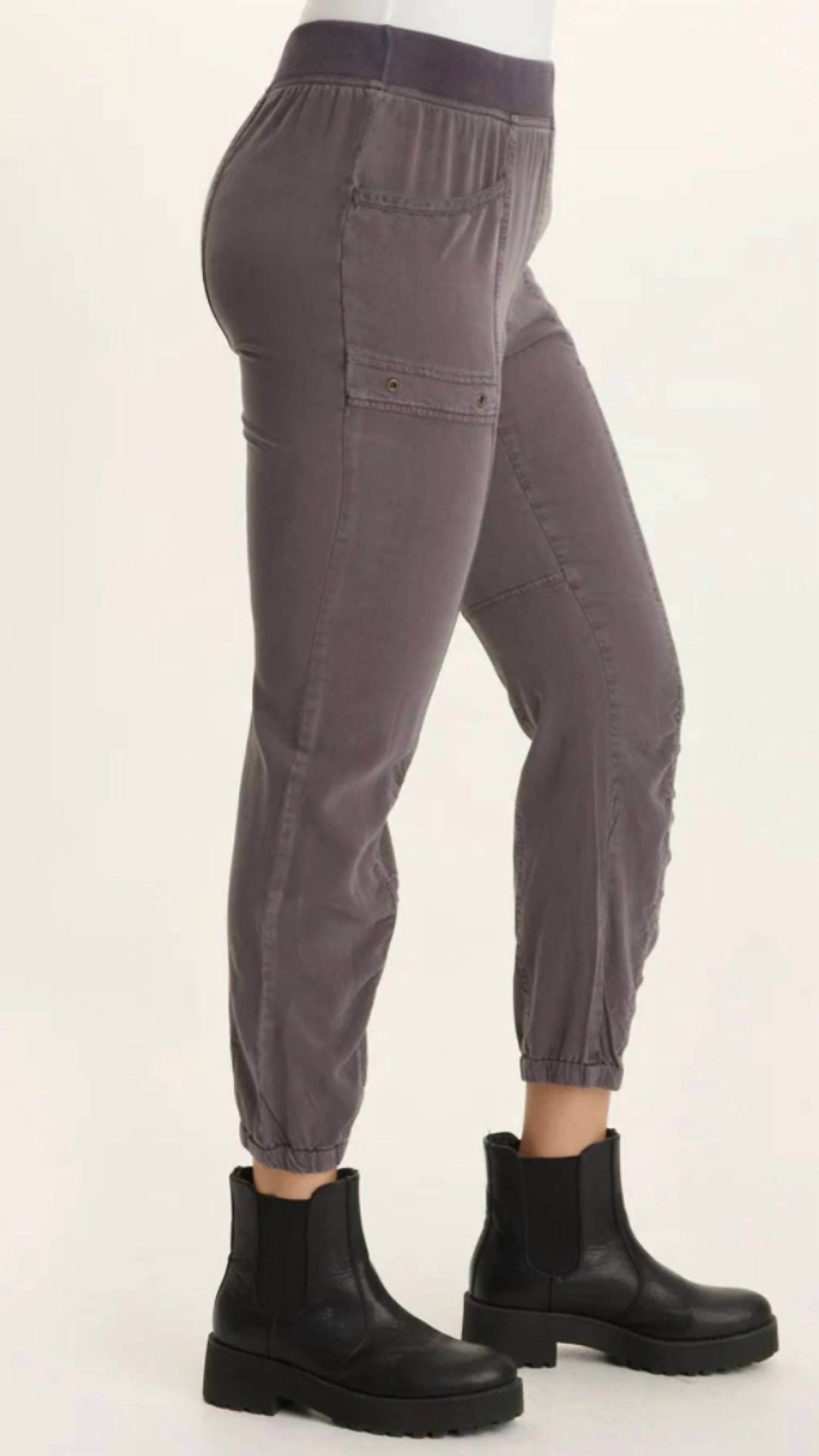 Stay on-trend and showcase your impeccable taste with these adaptable and stylish cropped pants. The perfect length to wear with your favorite mules. You'll love the fit! Elevate your casual wardrobe with the Squire Twill Banded Hem Casual Pant by Wearables in a timeless charcoal shade. These pants are crafted from a blend of 70% Rayon and 30% Tencel, featuring a 2.25" elastic in a jersey waistband for ultimate comfort. With a 28" inseam and a high-rise fit, these pants are designed with a pull-on closure for ease. Enjoy machine-washable convenience with this minimalist tapered leg style, perfect for spring holiday parties.