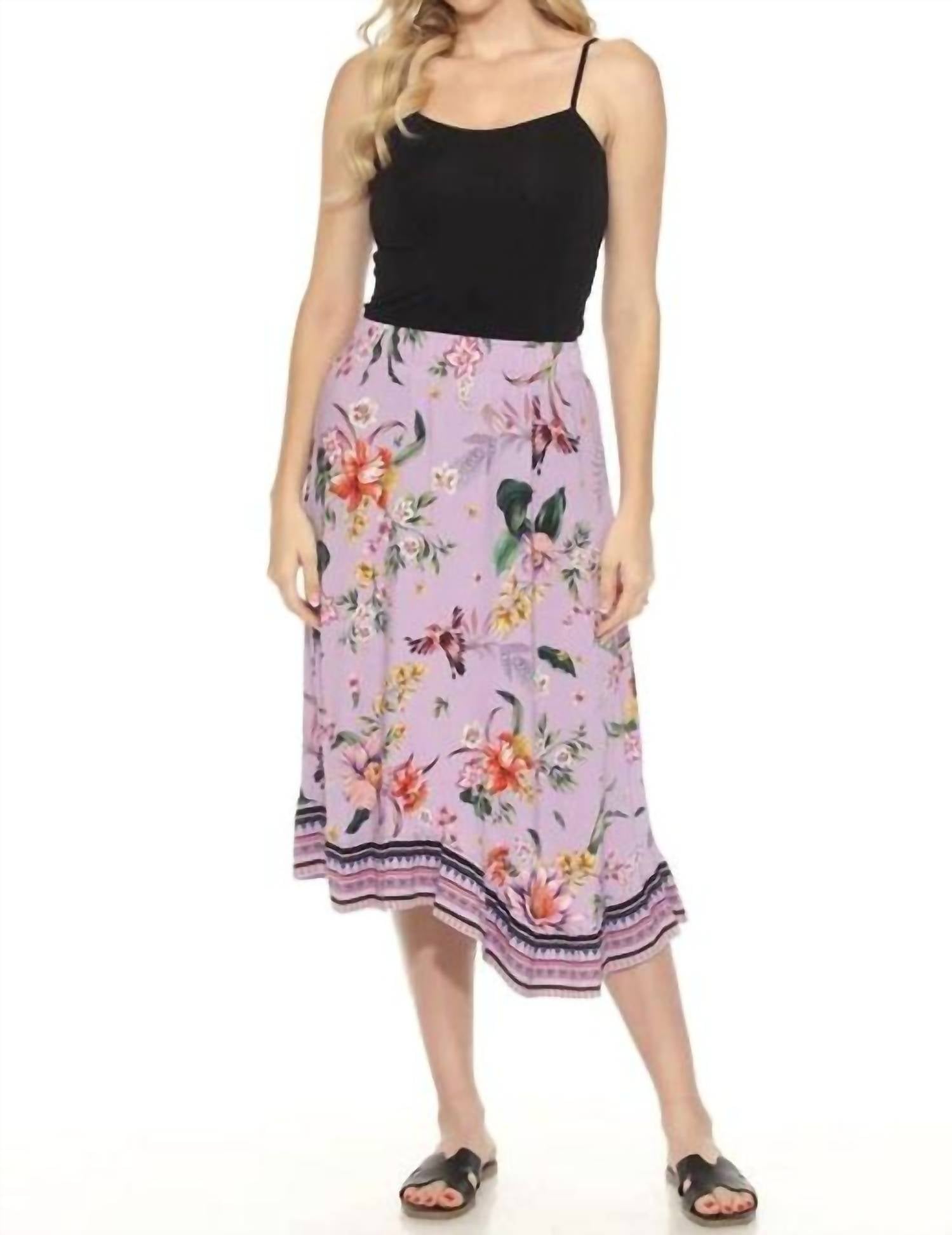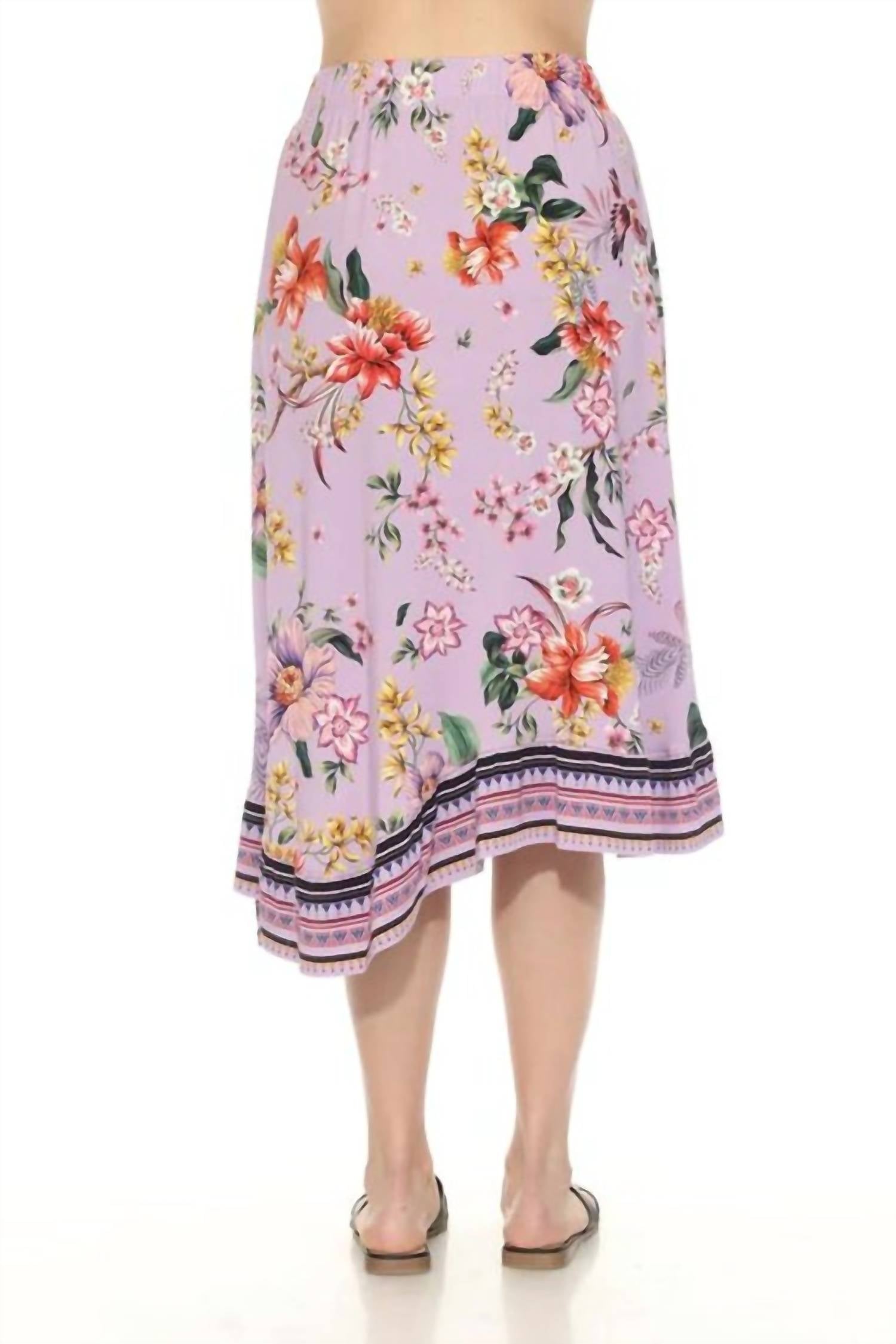 Feminine and stylish, this assymmetical skirt checks all of the boxes. Crafted from a soft, stretchy fabric, this women’s skirt is designed for ease, movement, and all-day wear. The relaxed pull-on style features a wide elastic waistband that offers a secure yet flexible fit, while the asymmetric hem creates a graceful, flowy silhouette that moves beautifully with every step. The vibrant floral pattern adds a playful, boho-chic touch that pairs effortlessly with tees, tanks, or blouses. Pair it with the Willah Janie Favorite Crew Neck to complete the look. Machine Wash.