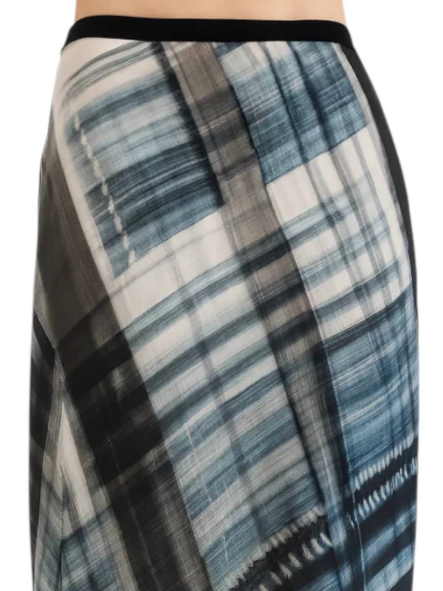 Feminine and stylish, this assymmetical skirt checks all of the boxes. Make a statement with the Go Long For It Midi Skirt by Go by Go Silk, a standout piece in Hashtag Plaid. This asymmetrical midi skirt is crafted from 100% Silk and features a striking blue, black, and ivory plaid pattern. With a side slit for added movement, it offers a flattering silhouette perfect for transitioning from day to night. Closure: Pull-on style. Care: Hand wash cold. Imported.