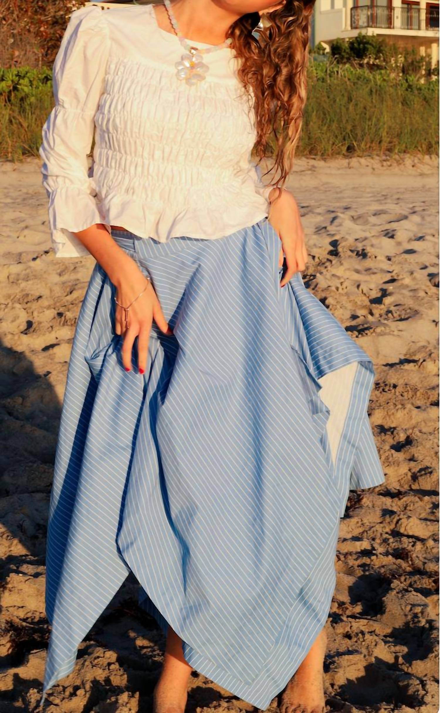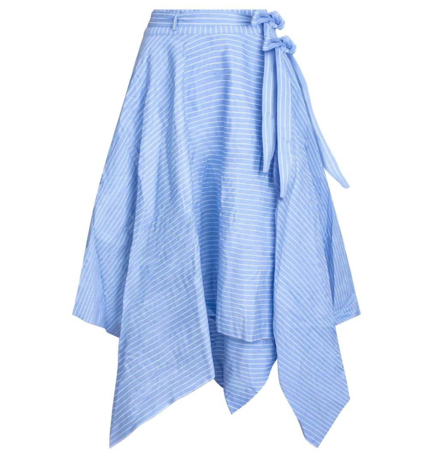This asymmetrical skirt will take you from desk to dinner. Embrace the Boho Chic trend with the Ollie Asymmetrical Skirt by Esteem Couture, crafted in a delightful blue pinstripe pattern. This women's skirt boasts an asymmetrical handkerchief-style hem and is beautifully adorned with playful draped details. Featuring a double bow tie closure, it offers a whimsical touch suitable for a spring dinner party or Hanukkah occasion. Please note that specific care instructions are not provided.