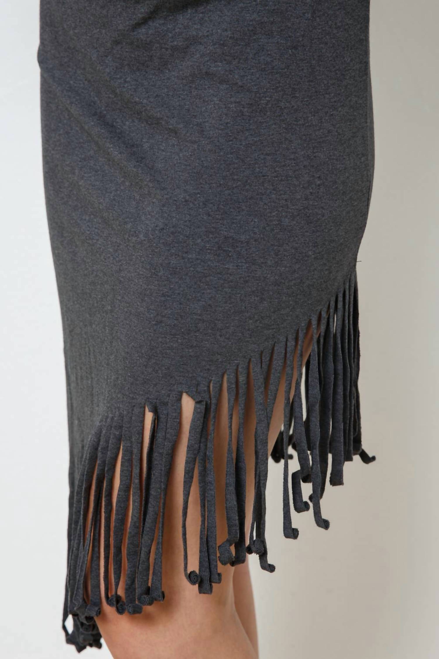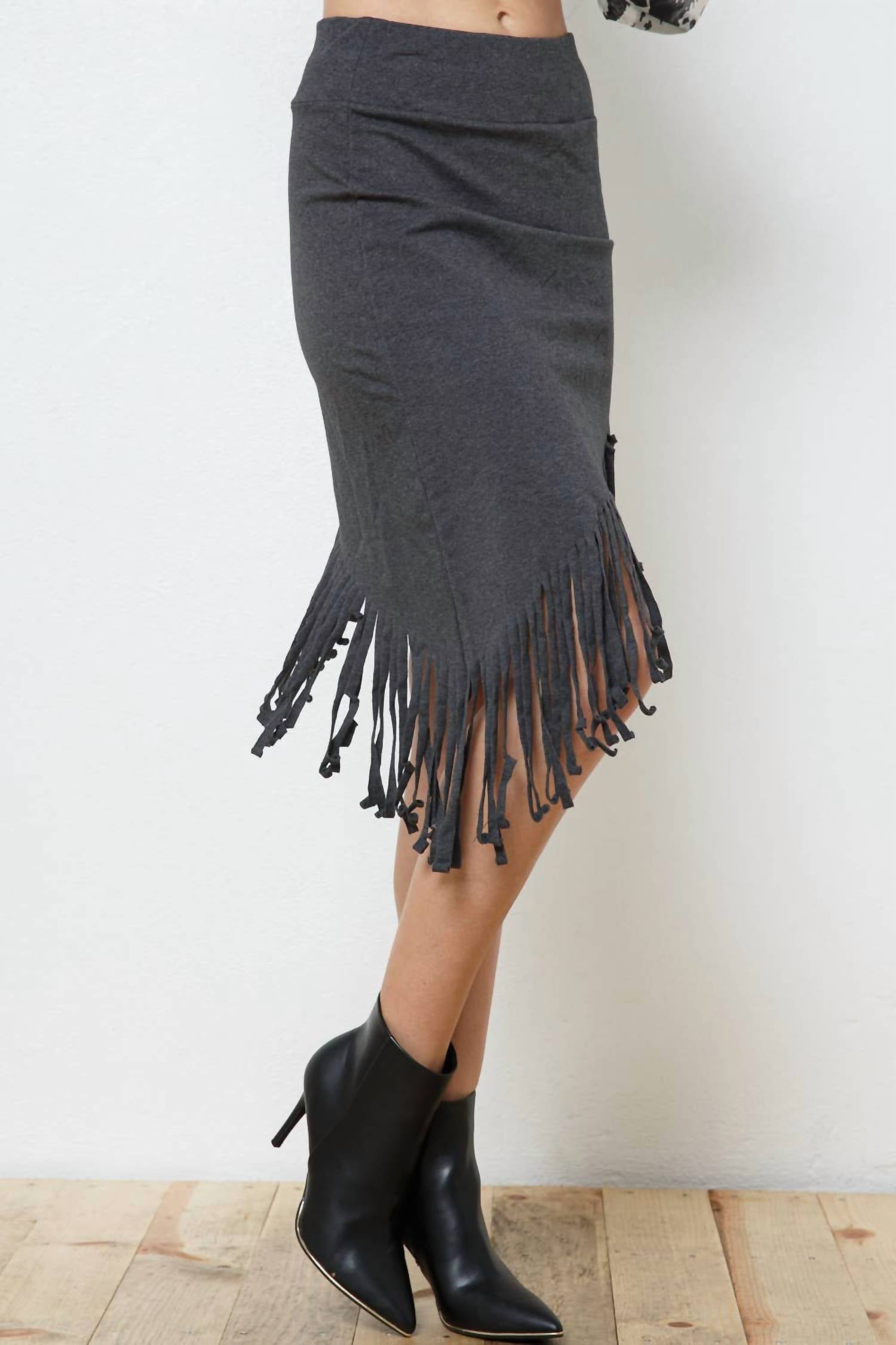 This asymmetrical skirt shows just the right amount of leg. Enhance your wardrobe with the Asymmetrical Fringe French Terry Skirt from Blue B, designed for a chic and contemporary look. This skirt is crafted from a 95% cotton and 5% spandex blend, providing both comfort and a flattering fit. Its solid black color and unique asymmetrical design make it ideal for summer dinner parties, while the playful fringe details add a stylish twist. Made without pockets, this women's skirt is all about sleek and expressive fashion.