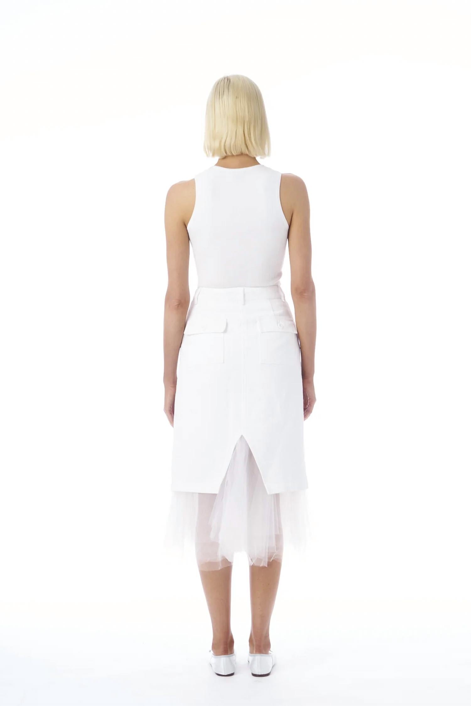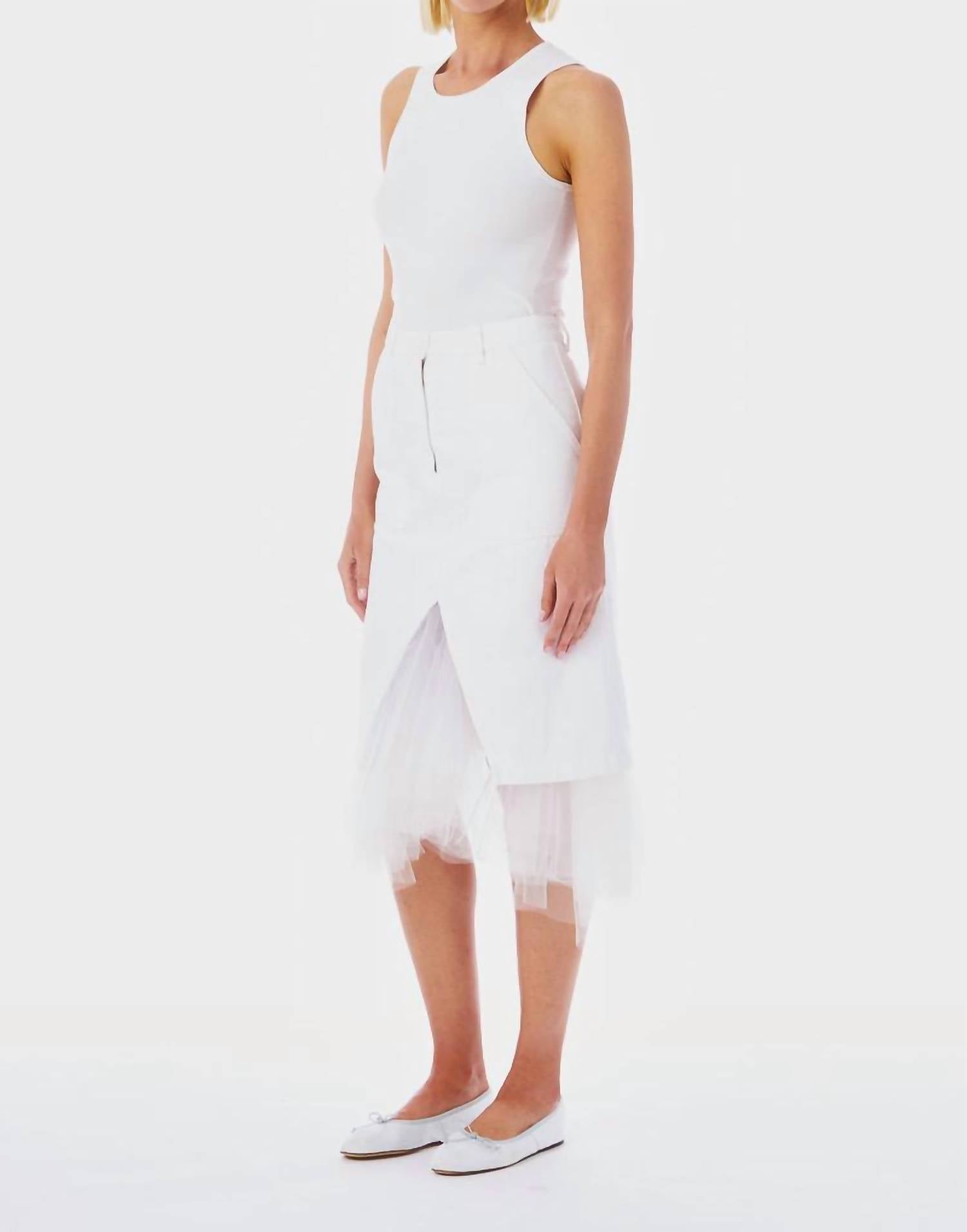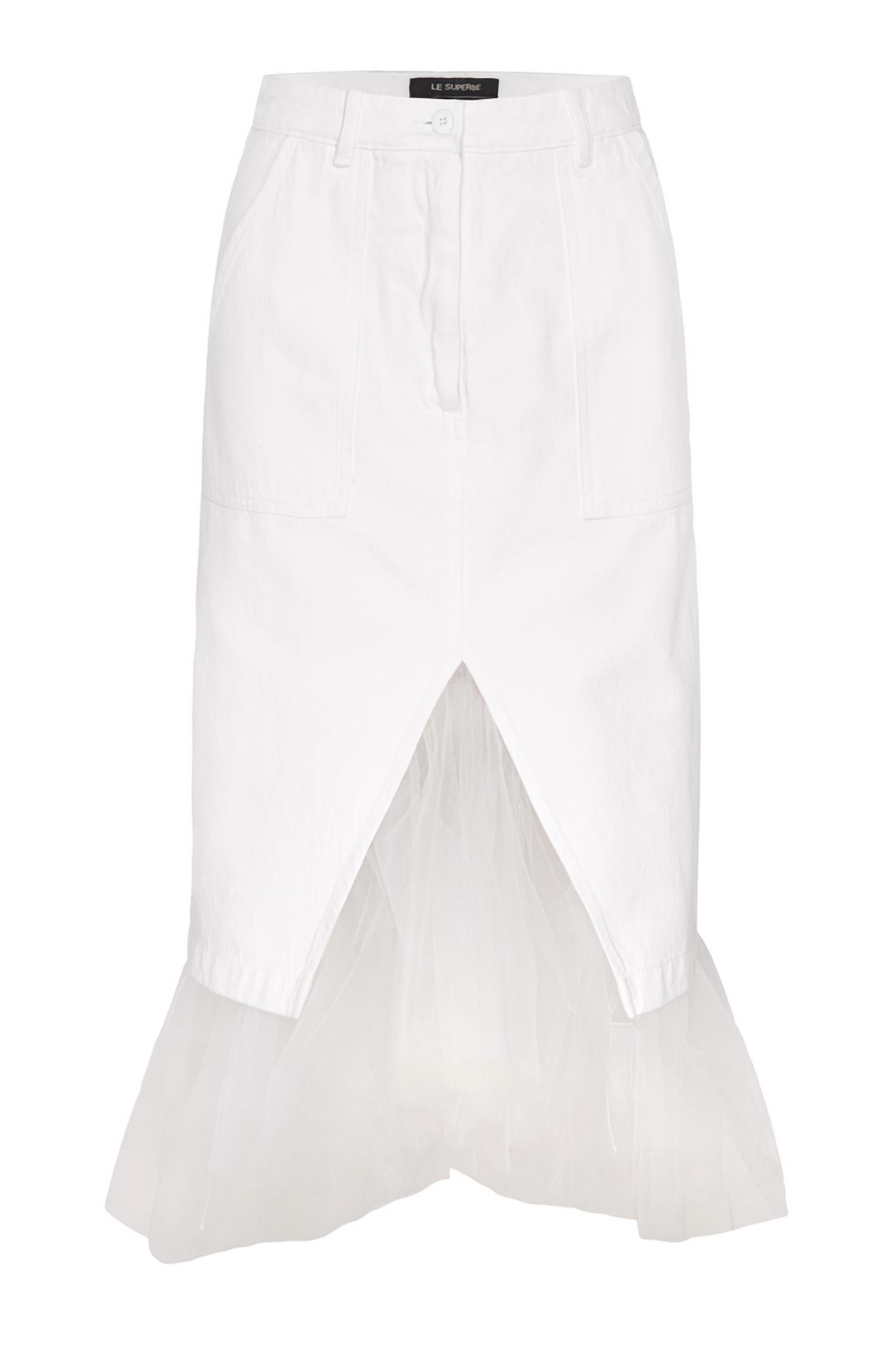 Feminine and stylish, this assymmetical skirt checks all of the boxes. Introducing the Mr. & Mrs. Benjamin Skirt by LE SUPERBE, an asymmetrical masterpiece in striking dual white. Crafted from 100% cotton army twill, this A-line silhouette features layers of tulle peeking through from the hem and a subtly sexy slit-front. Practical patch pockets add functionality to this textured design, perfect for summer dinner parties or Thanksgiving gatherings. Pair it with your favorite tee or a light cardigan for a chic and conversation-starting ensemble.
