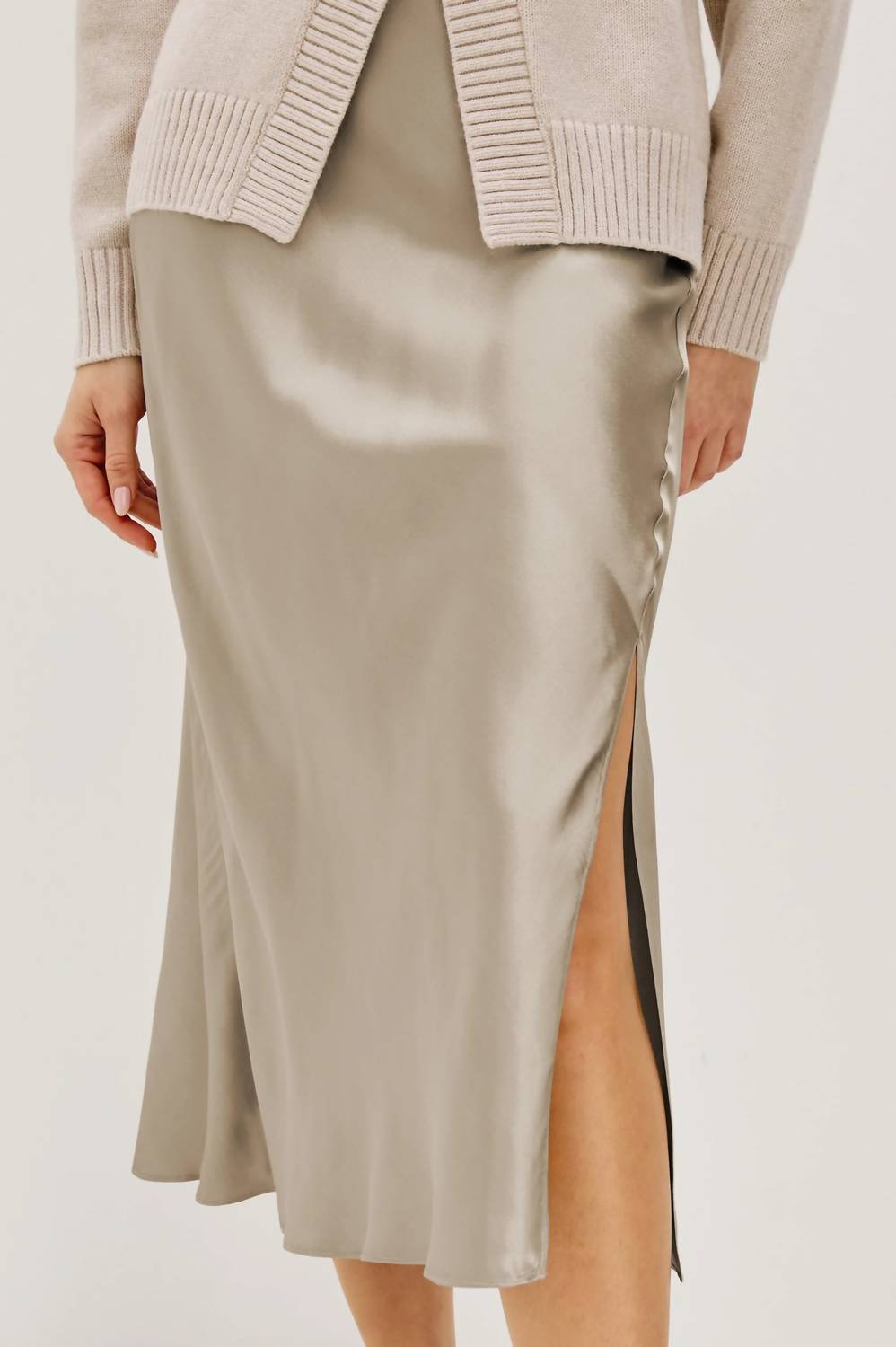 Feminine and stylish, this assymmetical skirt checks all of the boxes. Introducing the Maya Midi Skirt by Rails, your newest wardrobe essential for minimalist elegance. This slip-style skirt, in a sophisticated mink hue, is crafted from 55% Rayon and 45% Viscose, ensuring it drapes beautifully with a smooth satin back crepe. Featuring a front-facing slit for added movement, this skirt is designed with a pull-on closure for ease of wear. Care: Machine wash. Skirt Length: 31 3/4" (measured from size S). Imported.