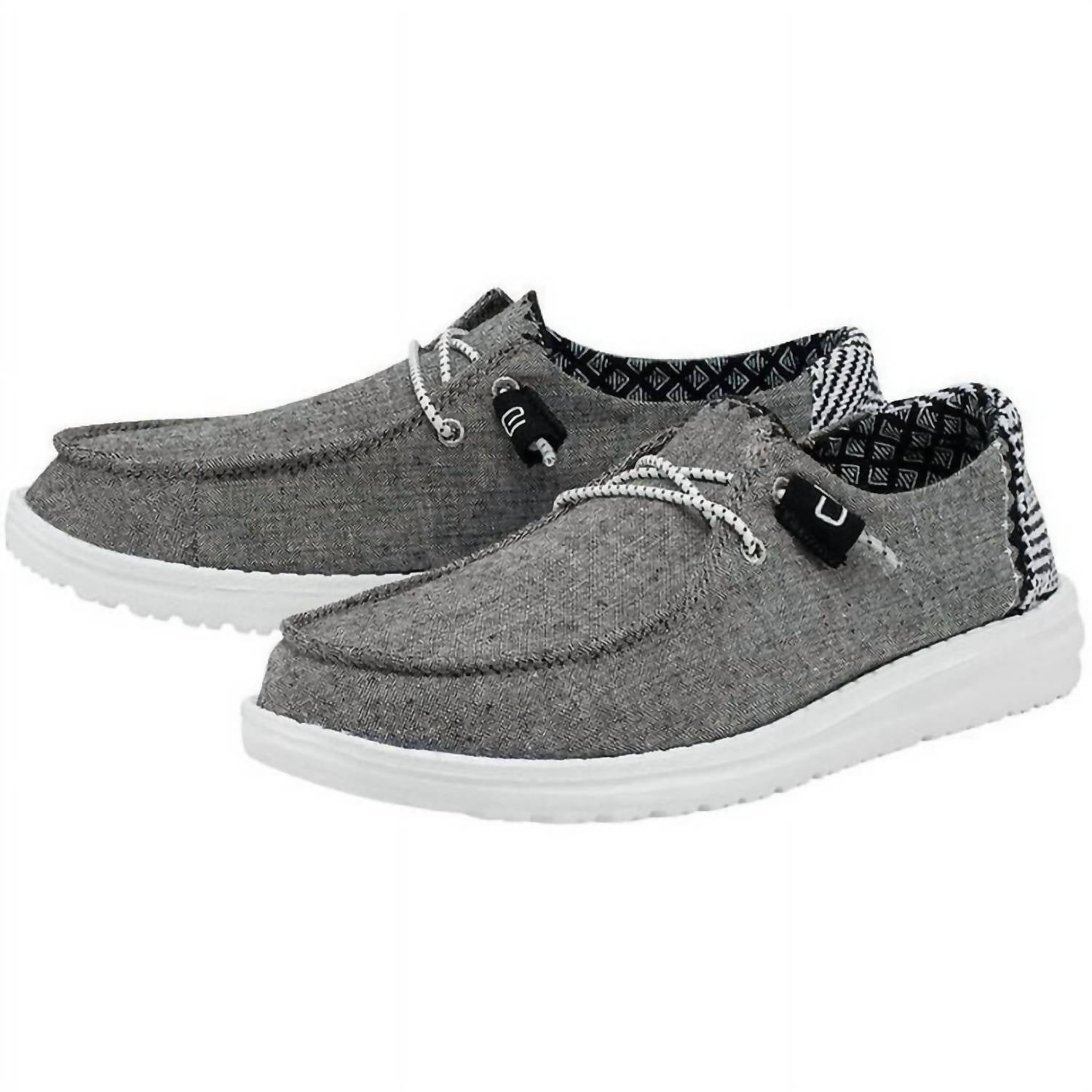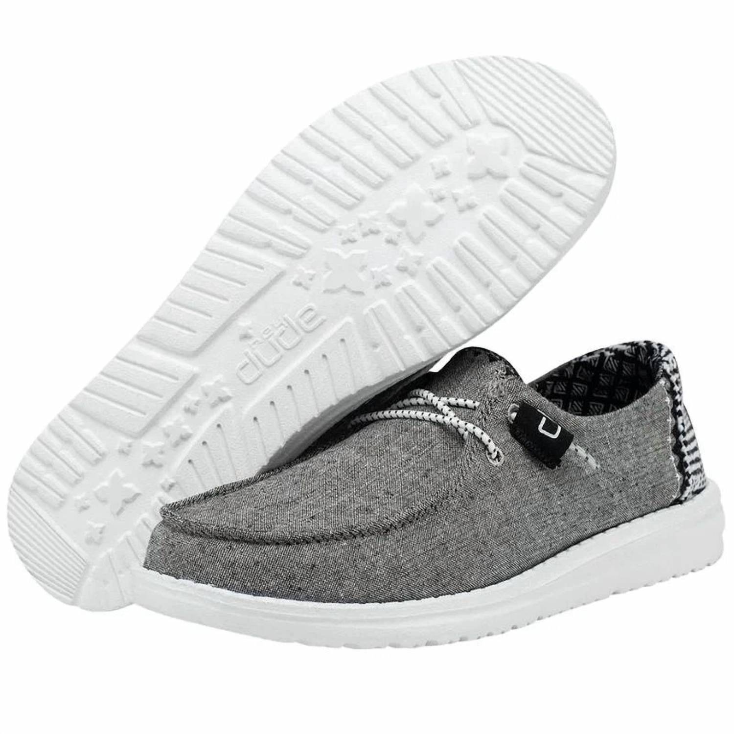 When fashion meets function. Step into comfort and style with the Women's Wendy Chambray shoes by HEY DUDE, perfect for your spring travel needs. Crafted with a textile woven upper featuring contrasting stitching, these Onyx athletic shoes combine function and fashion effortlessly. The Easy-On System includes no-tie elastic laces and a breathable cotton lining, complemented by a leather-lined removable insole and ultralight outsole, ensuring every step feels as light as air. Featuring a flat heel under 1 inch and a round toe, these shoes are easy to wash and air dry, making them the ideal choice for minimalist flair on the go.