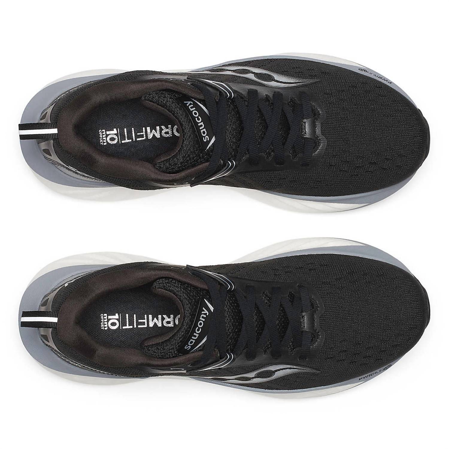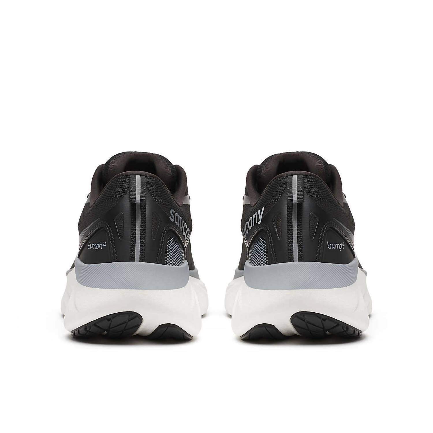 Workout in style with these adorable athletic sneakers. Introducing the Women's Triumph 22 Shoes by SAUCONY, designed to bring unparalleled joy to your fitness routine. With a flat heel style and round toe shape, these athletic shoes in classic black and white are perfect for women seeking comfort and style. Featuring the PWRRUN PB foam, they offer superior cushioning and energy return, making every step feel like a cushy experience. These shoes, at a flat heel height of under 1 inch, are ideal for workouts and athleisure, especially during summer celebrations like the 4th of July.