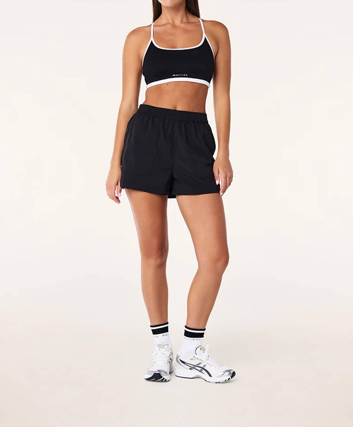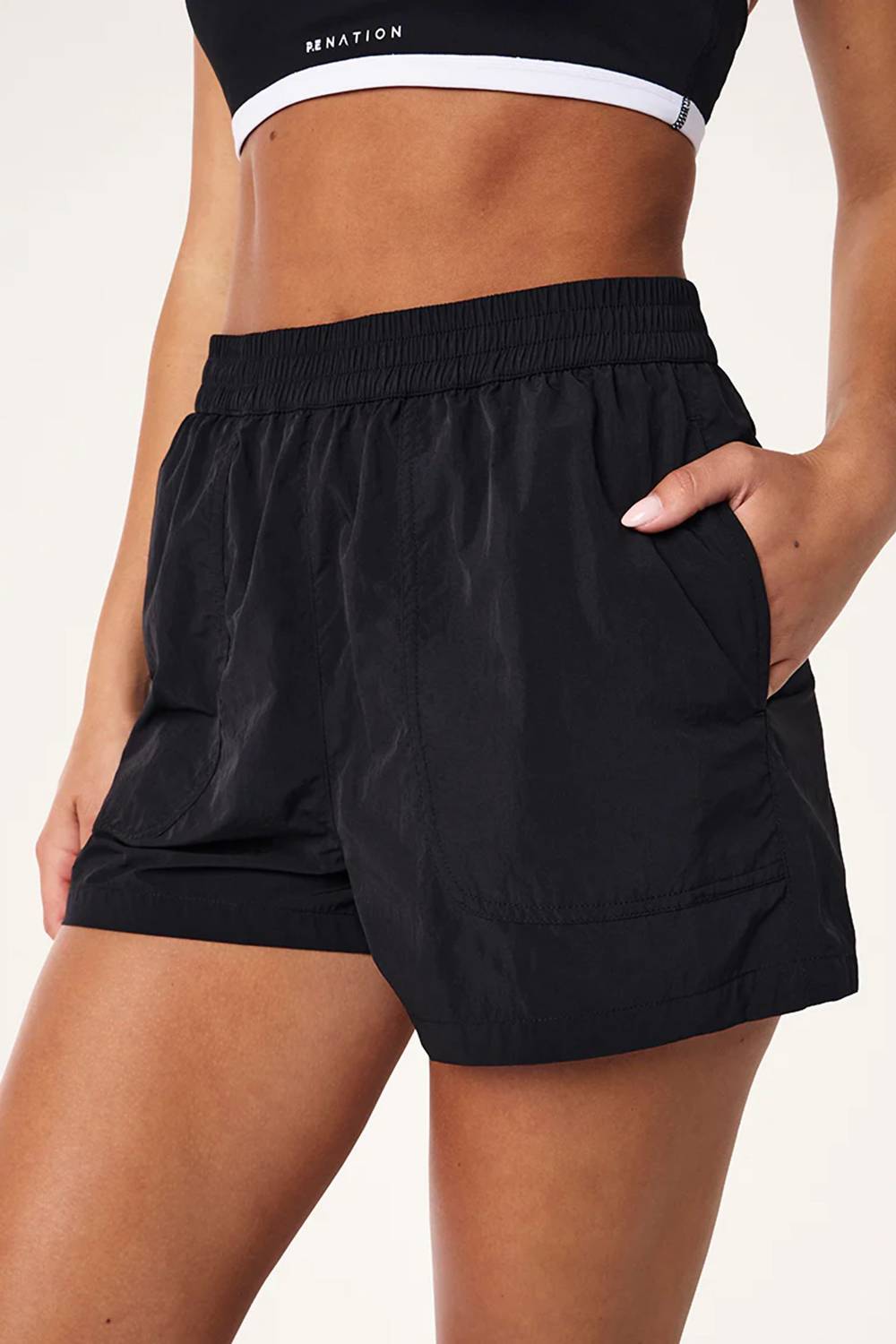 light weight and beyond comfortable, these athletic shorts are perfect for those warm weather days. Elevate your athleisure game with the Pitlane Athletic Short by P.E. NATION, crafted in a solid black tone. These relaxed fit cargo shorts feature an encased elastic waistband for a comfortable pull-on closure and include functional back pockets with press studs. Made from 100% recycled nylon, these lightweight shorts are designed for all-day wear and a versatile off-duty look. Care instructions include a maximum washing temperature of 30°C, cold gentle machine wash inside-out, and line dry in the shade—ensuring their longevity and maintaining their sleek aesthetic.