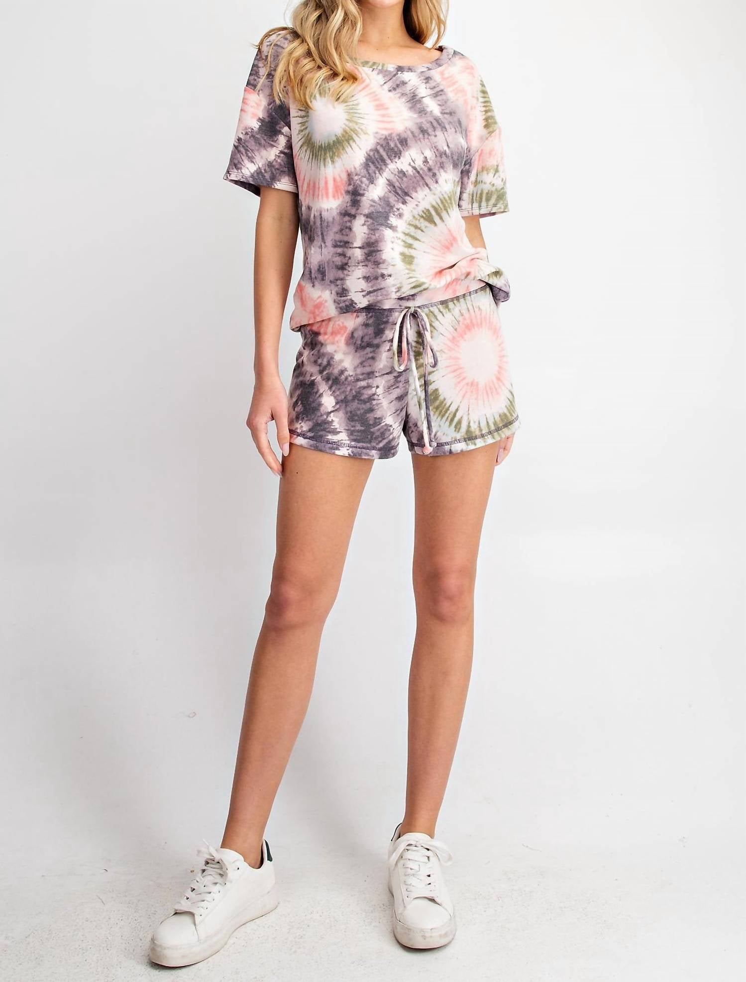 Stylish and comfortable, these athletic shorts will never go out of style. Embrace relaxation with the Don't Worry Be Happy Shorts by 143 STORY, a casual piece crafted for ultimate comfort and style. Made in the USA, these shorts feature a colorful tie-dye print in coral, mint, and grey, perfect for a trendy look. The super soft French terry knit fabric provides excellent comfort, while the elastic waistband with decorative tie enhances the fit. Composition: 63% Polyester, 33% Rayon, 4% Spandex; Care: Hand wash cold. Inseam measures approximately 2.75 inches.