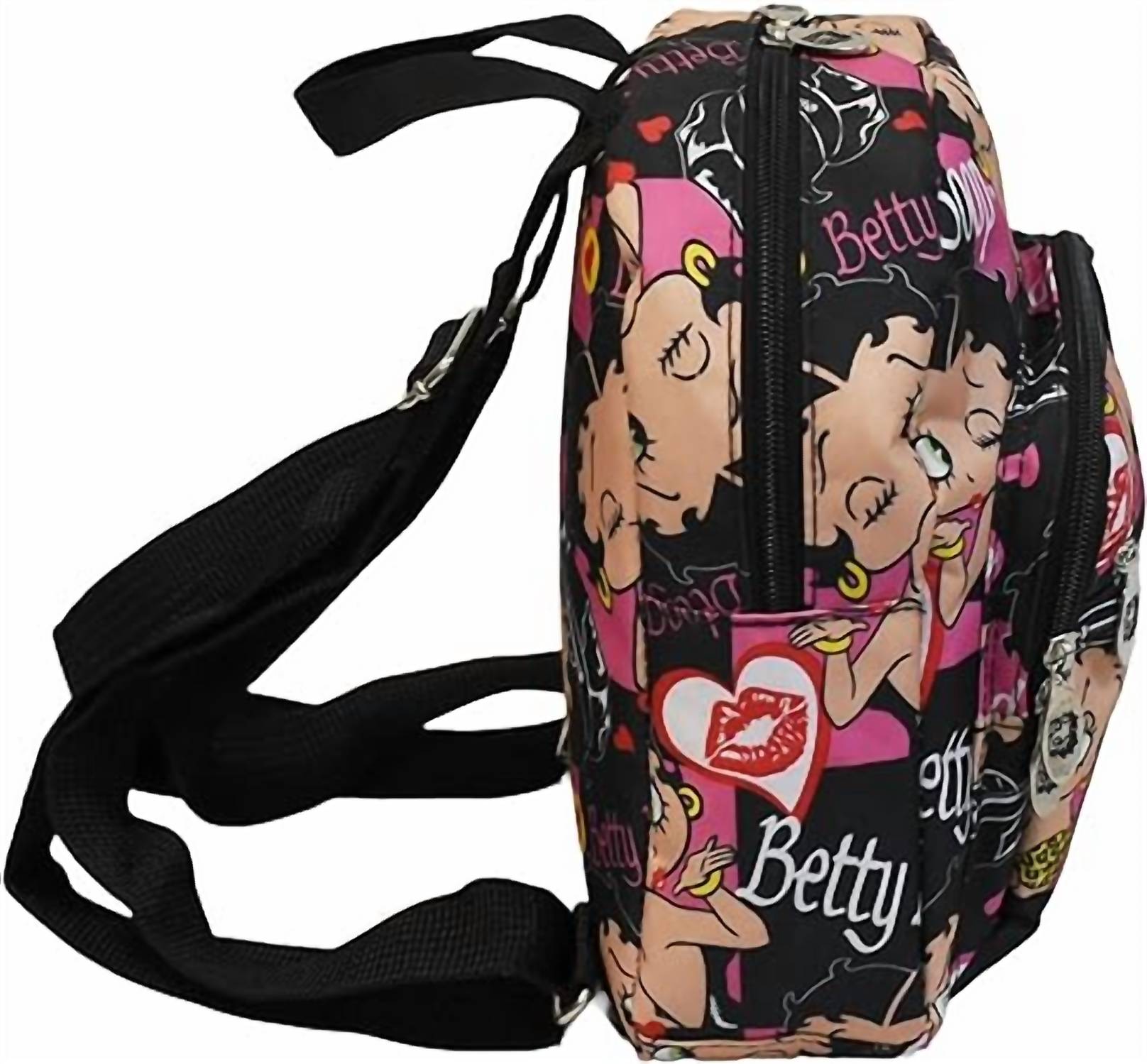Betty Boop theme. Durable high-density polyester canvas material. Multiple pockets with water bottle holders. Adjustable back shoulder strap. Spine protective back padding. Lightweight. 10" x 8" x 3" Mini Backpack