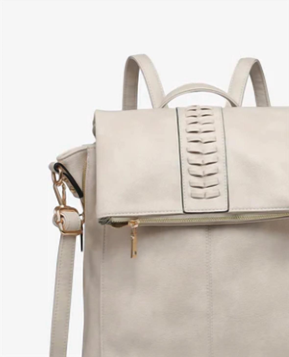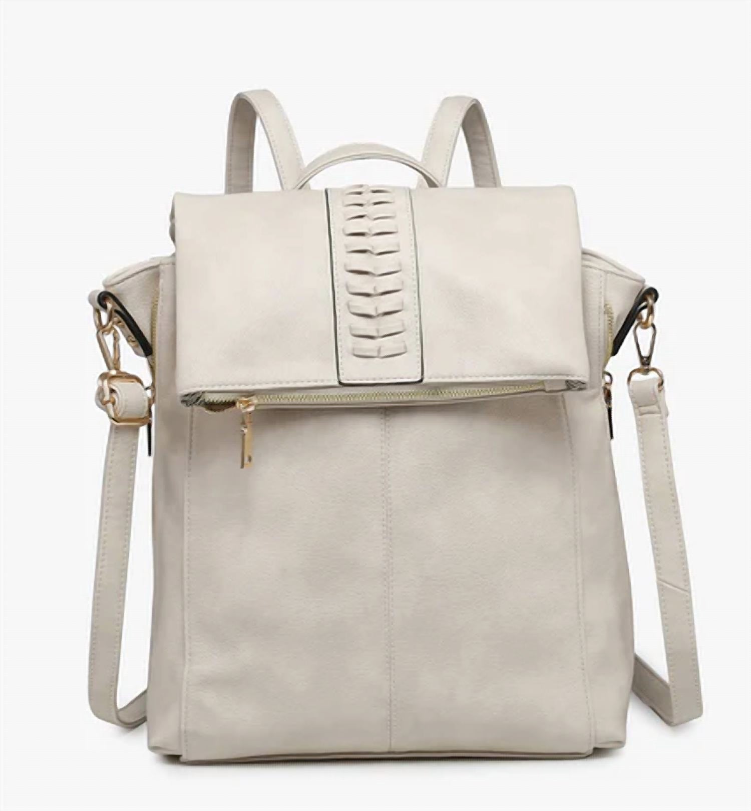 The perfect size backpack that fits everything you need! Elevate your accessories collection with the Women's Vivian Vegan Distressed Backpack by Jen & Co. This chic bag, crafted from faux leather in a stylish bone shade, is detailed with gold-tone hardware and features a flapover snap closure for added sophistication. Designed for practicality, it includes two side zippers, inner slip and zip pockets, and an adjustable/removable shoulder strap with whipstitch detailing. With dimensions of 13" L x 15" H x 4.5" D, this convertible bag is perfect for staying organized while making a statement.