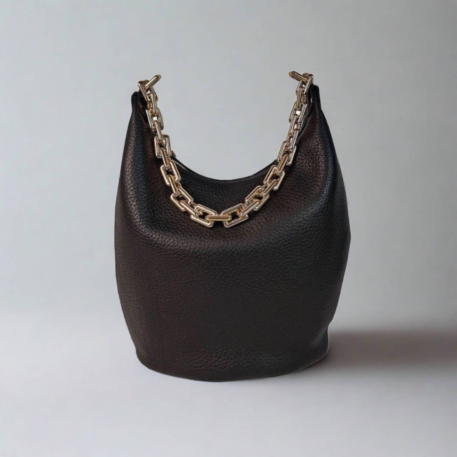 Introducing the Atmosfera Zip Top Handbag by Bergè, a spacious shoulder bag meticulously crafted in Italy. Made from locally sourced pebbled leather, it features an elegant gold PVC square chain strap for easy carry. The design includes a practical flat bottom, large zip top closure, an inside zipper pocket, and two interior slip pockets for organization. Dimensions: 13" length, 10" height, and 6" depth, with an 18" chain strap.