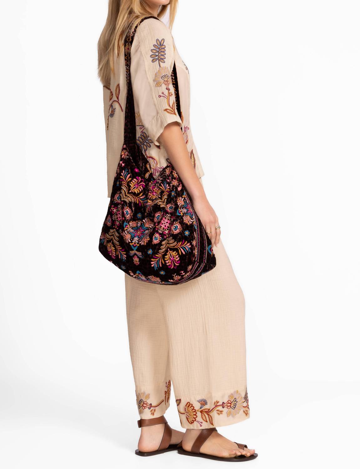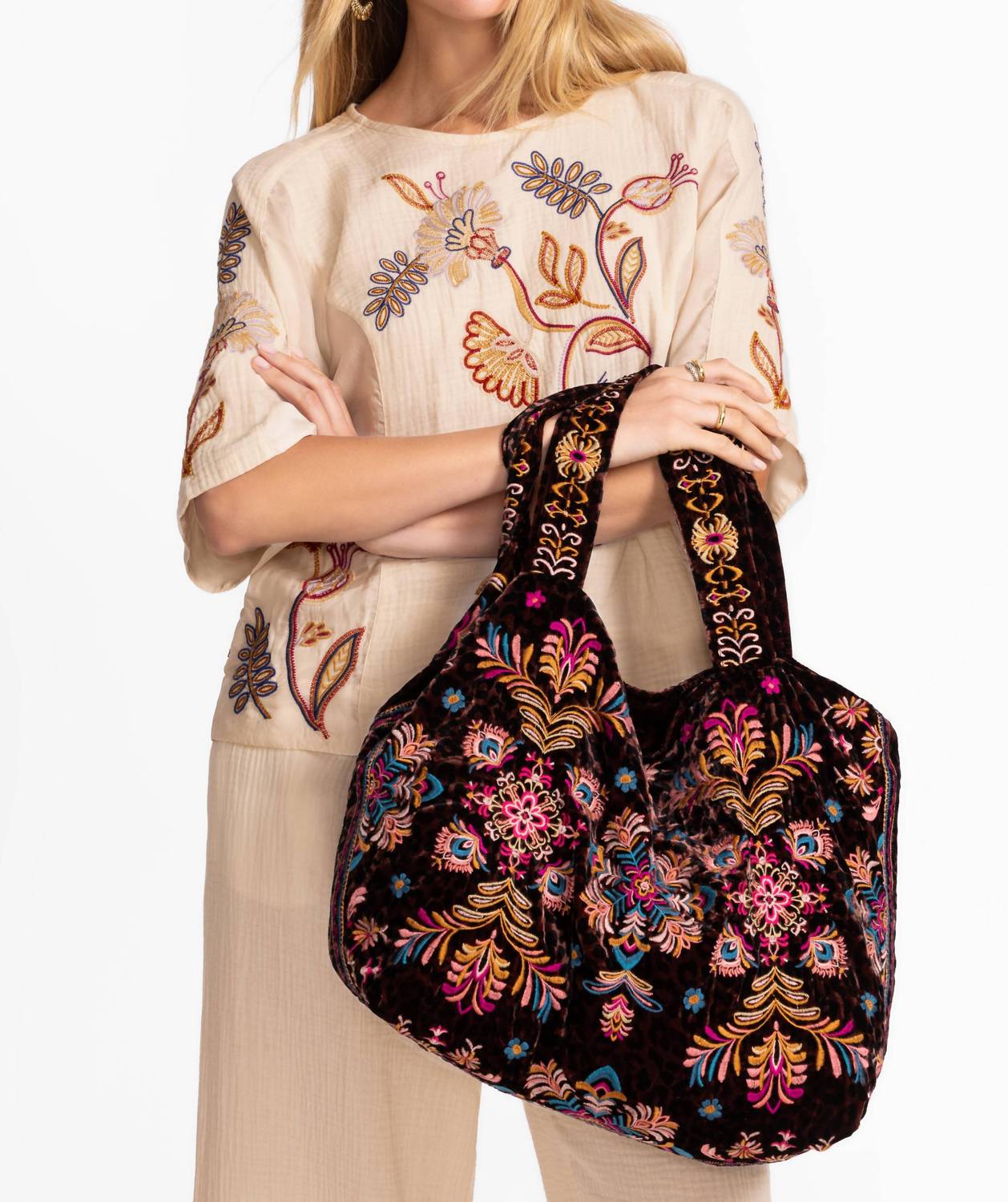 The carry-all tote bag of the season. Get in vacation mode with this perfectly sized tote bag that is the perfect accessory for beach days, pool parties, or sunset dinners. Introducing the Brandi Velvet Tote Bag by Johnny Was, a captivating accessory in Misty Leopard to elevate your style. Crafted from a blend of 75% Viscose and 25% Nylon, this tote exudes a bold, textured look with its intricate embroidered accents. Measuring 22" L x 7" W x 13.5" H, it features versatile handles and a shoulder strap, secured with a magnetic snap closure. For optimal care, please dry clean only.