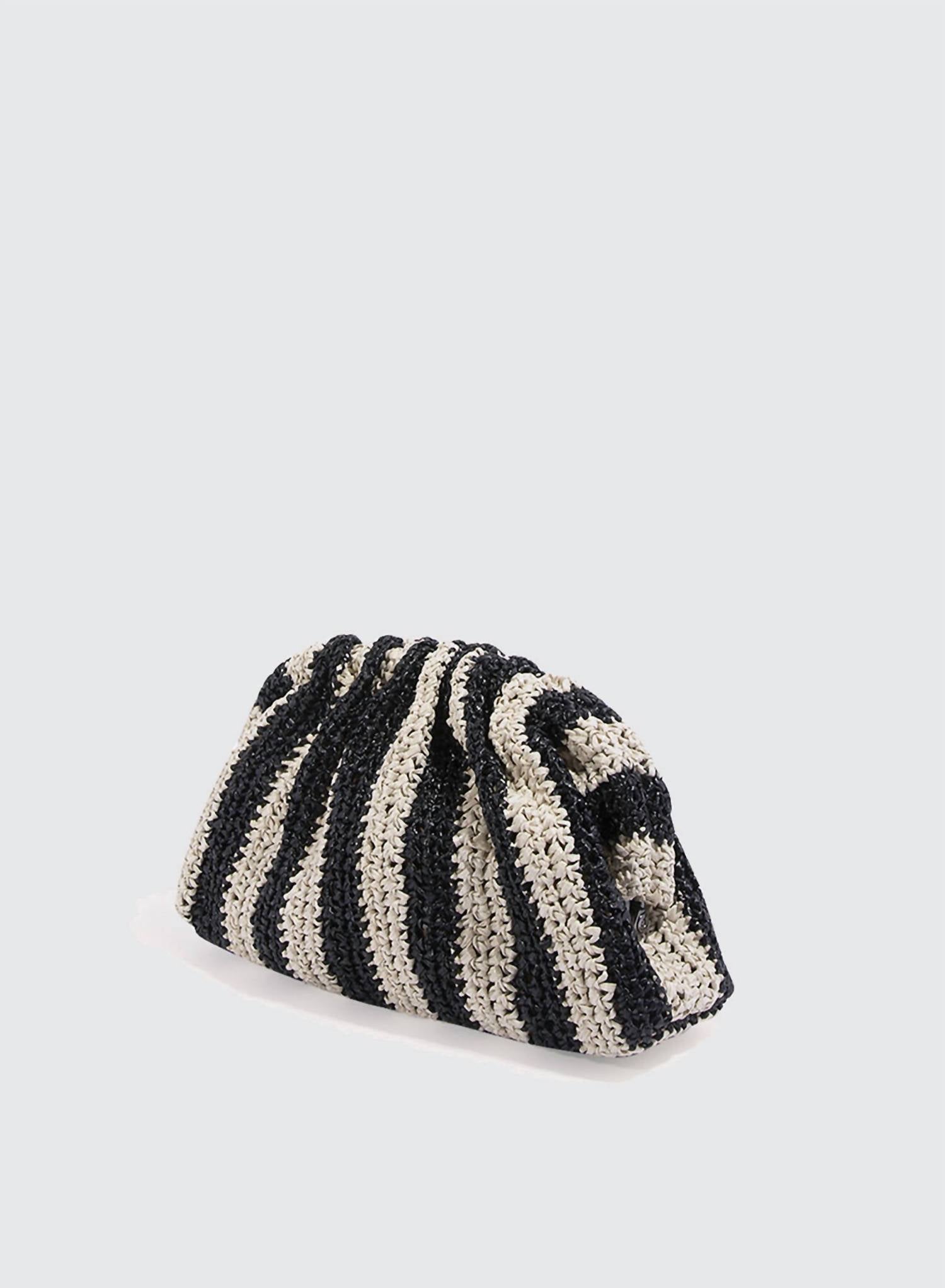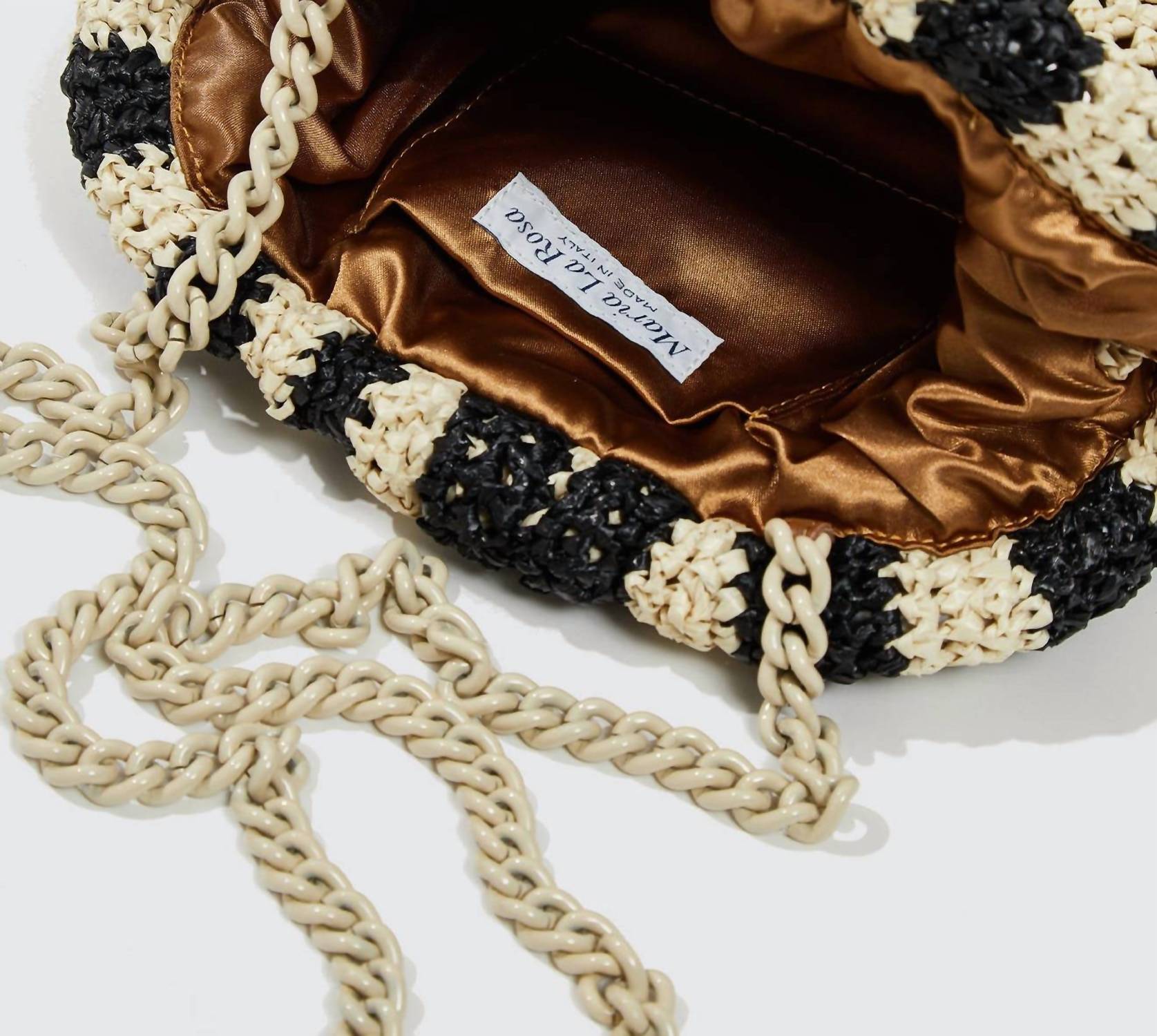 The perfect clutch for an evening out on the town. Introducing the Women's Game Crochet Clutch by Maria La Rosa, an iconic accessory in a chic black stripe pattern. Expertly handcrafted using the crochet technique, this medium-sized clutch exudes metropolitan elegance while offering ample capacity and functionality. Material: 100% Viscose Raffia, with a luxurious viscose satin lining and a patch pocket. Produced entirely in Italy, it comes with a tone-on-tone 1-meter aluminum chain shoulder strap. Dimensions: Width 30 cm, Height 20 cm, Depth 5 cm.
