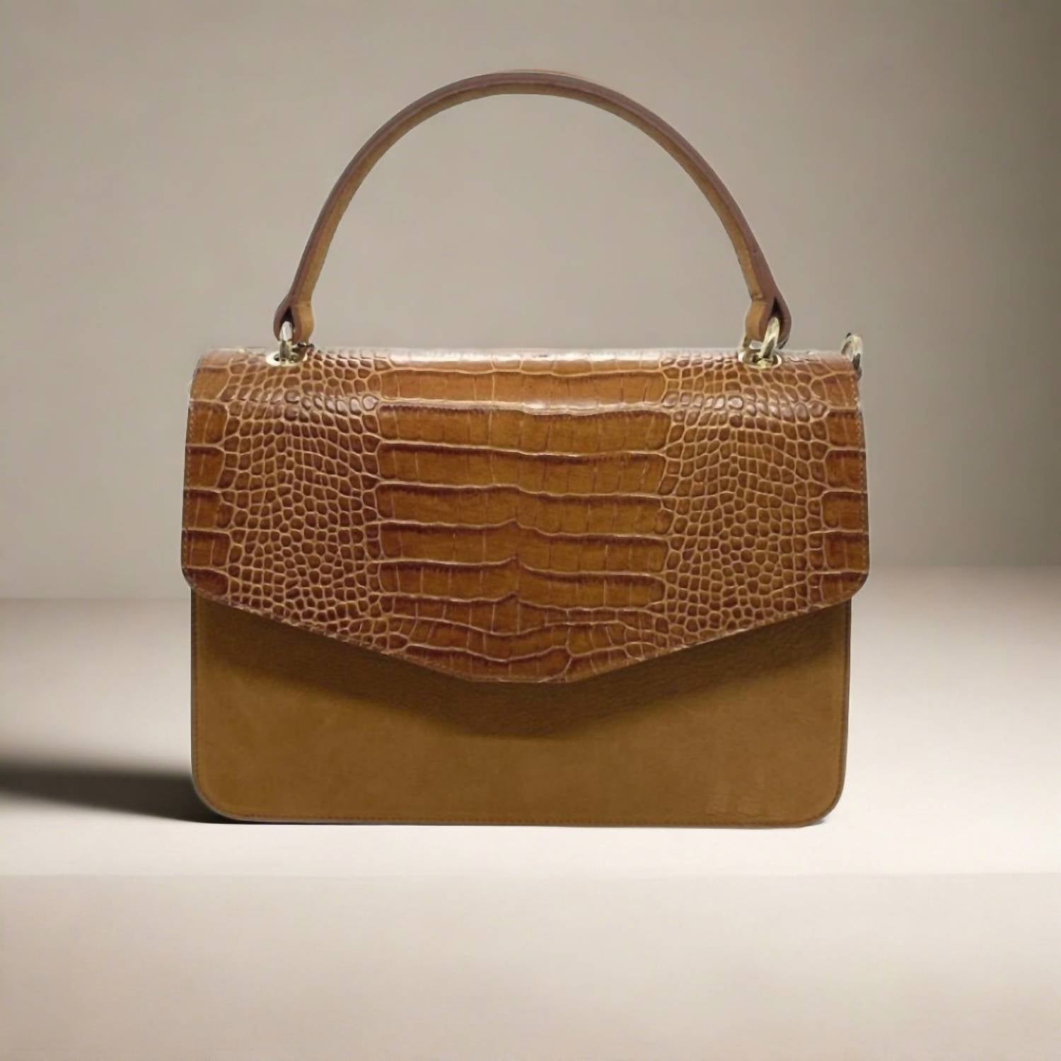 The cutest satchel bag that complements any outfit and carries just about everything you could possibly need. Discover the Exotic Flap Leather Bag by Bergè, masterfully crafted from luxurious croc-embossed tan Italian leather. This structured satchel features a sleek flap opening with a hidden snap closure, ensuring your essentials are securely stored. Equipped with a sturdy leather handle attached by silver O-rings, it offers comfortable carrying options. With dimensions of 12" length, 9.5" height, and 5" depth, this Italian-made bag boasts ample interior storage including one sewn-in zipper pocket and two additional sewn-in pockets.