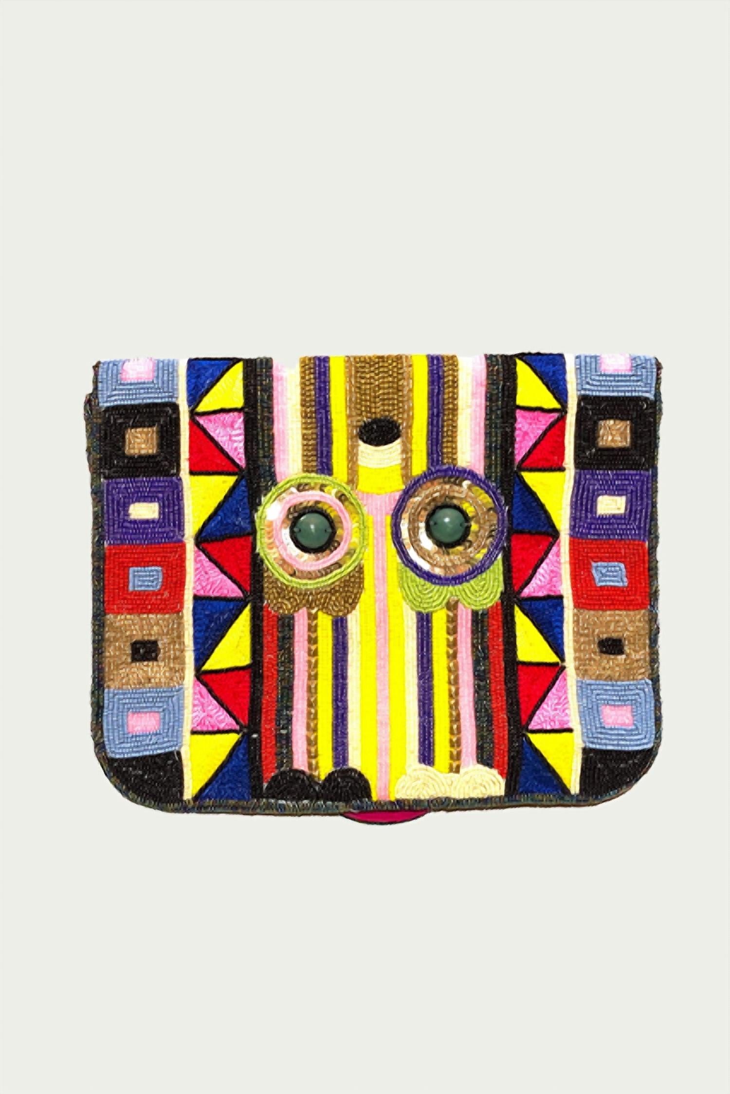 Fabrication: Dyed stones, gold beads and sequins, glass and plastic beads, thread embroideryDimensions: 9.5" x 7.5"; Chain - 40"