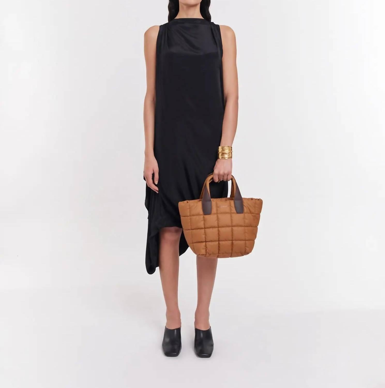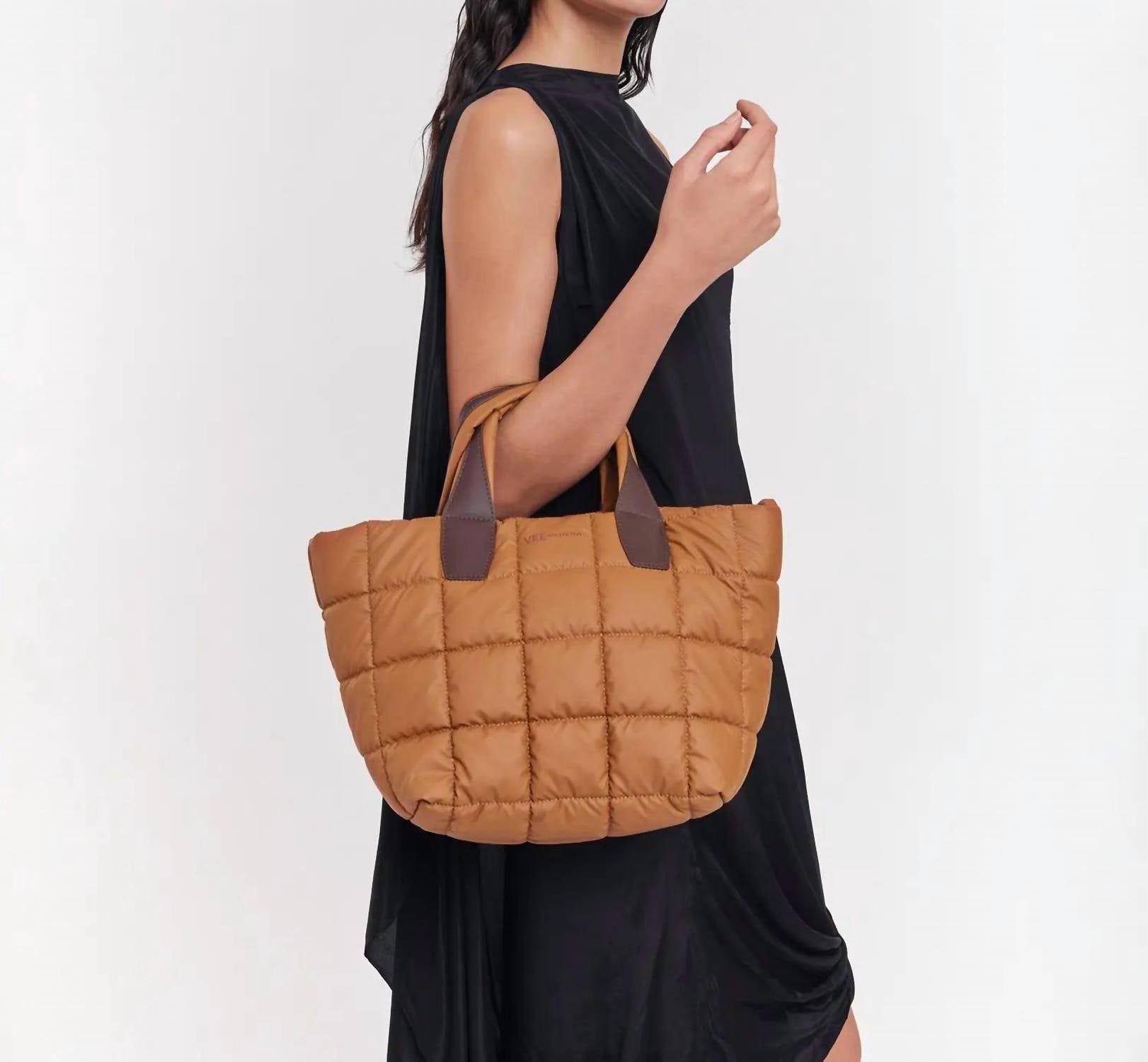 The carry-all tote bag of the season. Get in vacation mode with this perfectly sized tote bag that is the perfect accessory for beach days, pool parties, or sunset dinners. Meet the Women's Small Power Tote Bag by VEE Collective, a versatile companion for your multitasking lifestyle. Expertly made in Vietnam with a durable, water, and stain-resistant 100% recycled nylon shell, this tote in a chic Cognac color includes features like a 13'' laptop sleeve and multiple compartments for organization. With dimensions of L 15.7’’ x W 7’’ x H 10’’, it is both spacious and lightweight at just 1.1 lbs. The tote comes complete with an attachable shoulder strap and a separate nylon pouch for added convenience.