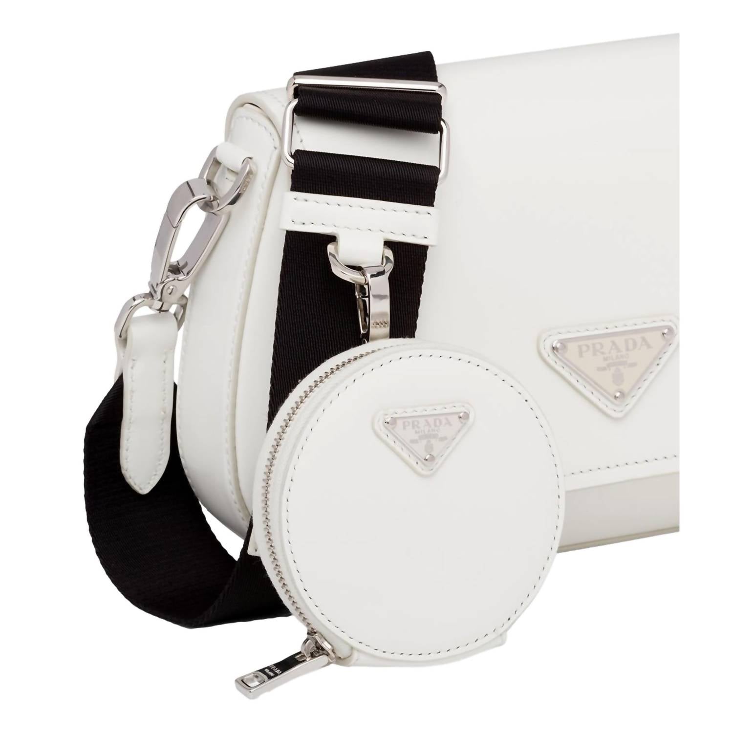 Don't be mistaken by its size, this little bag holds more than you'd expect! Add a touch of luxury to your accessories with the Prada Women's Triangle Plaque Smooth Leather Round Mini Pouch Keychain in white. Crafted from sleek, smooth leather, this chic piece features silver-tone hardware and the iconic Prada triangle logo plaque. It includes a convenient keychain attachment and a zipper closure to keep your small essentials secure, with measurements of 3.5" x 1" x 3.5" (LWH). Made in Italy, this stylish accessory comes complete with authenticity cards and a Prada box.