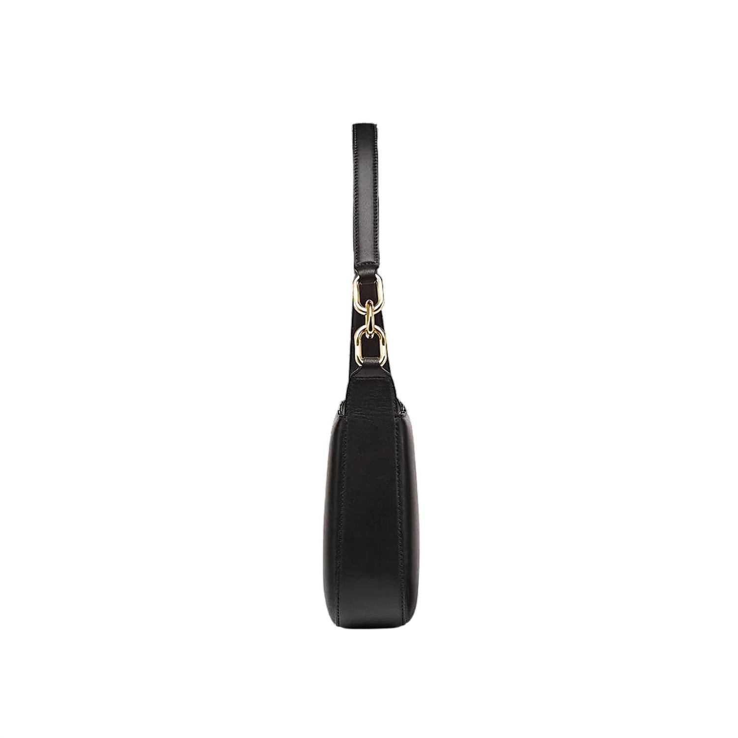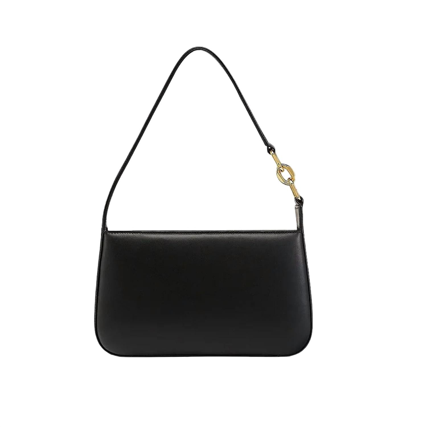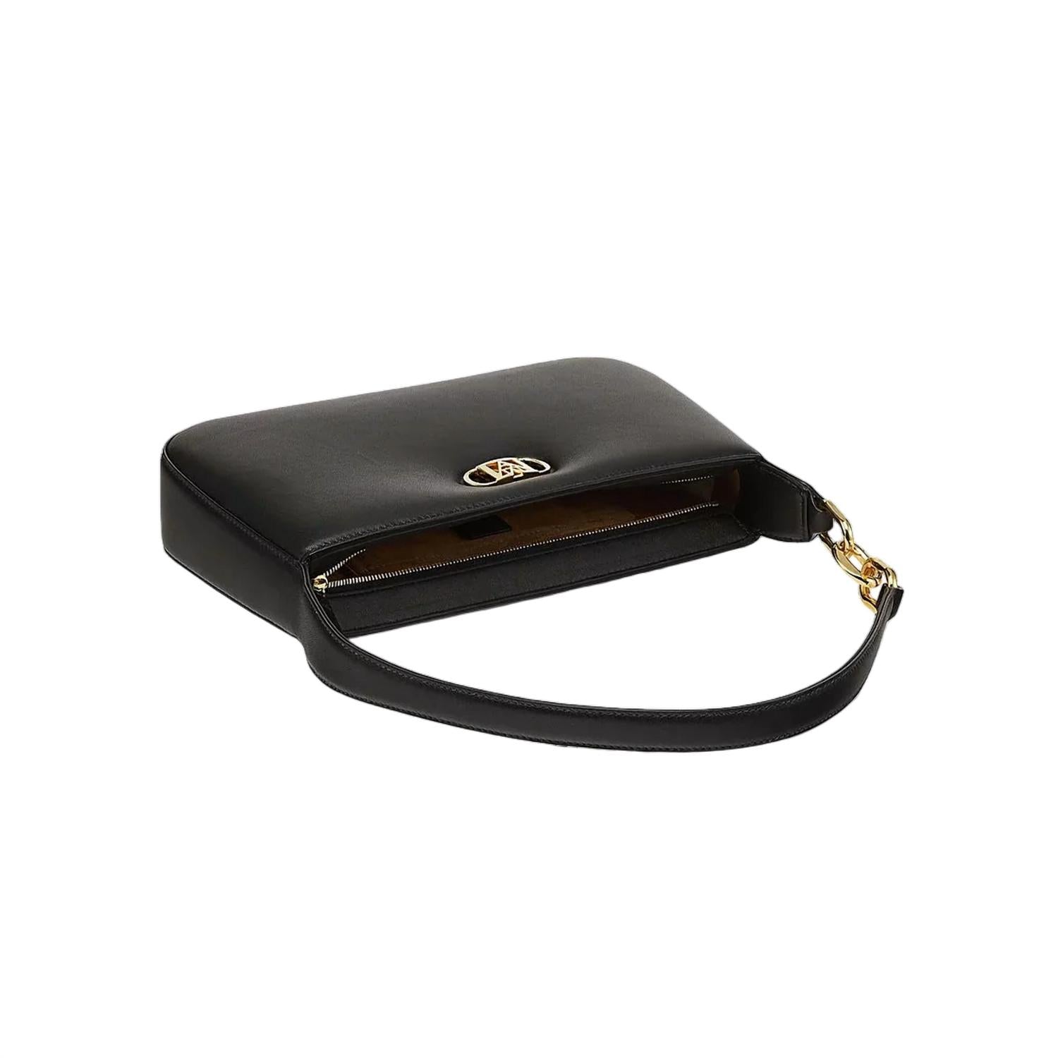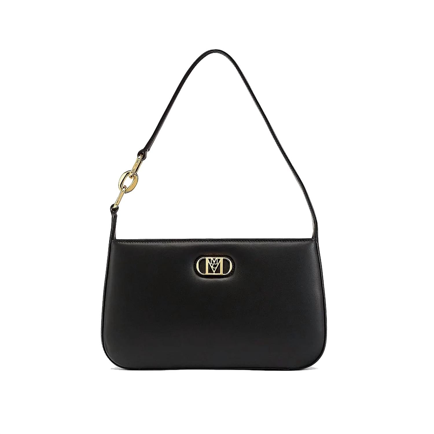 The Women's Mode Travia Shoulder Bag by MCM Worldwide is a sophisticated accessory crafted from black lamb nappa leather. With dimensions of approximately 6.9 x 11.6 x 2.3 inches and a strap drop of 9.5 inches, it offers ample space. This elegant bag features a zip closure and is adorned with a 24k gold-plated MCM logo, alongside a luxurious microfiber suede interior for a touch of luxury. Made in Italy, it showcases expert leather craftsmanship and includes an interior slip pocket and logo patch for added convenience.