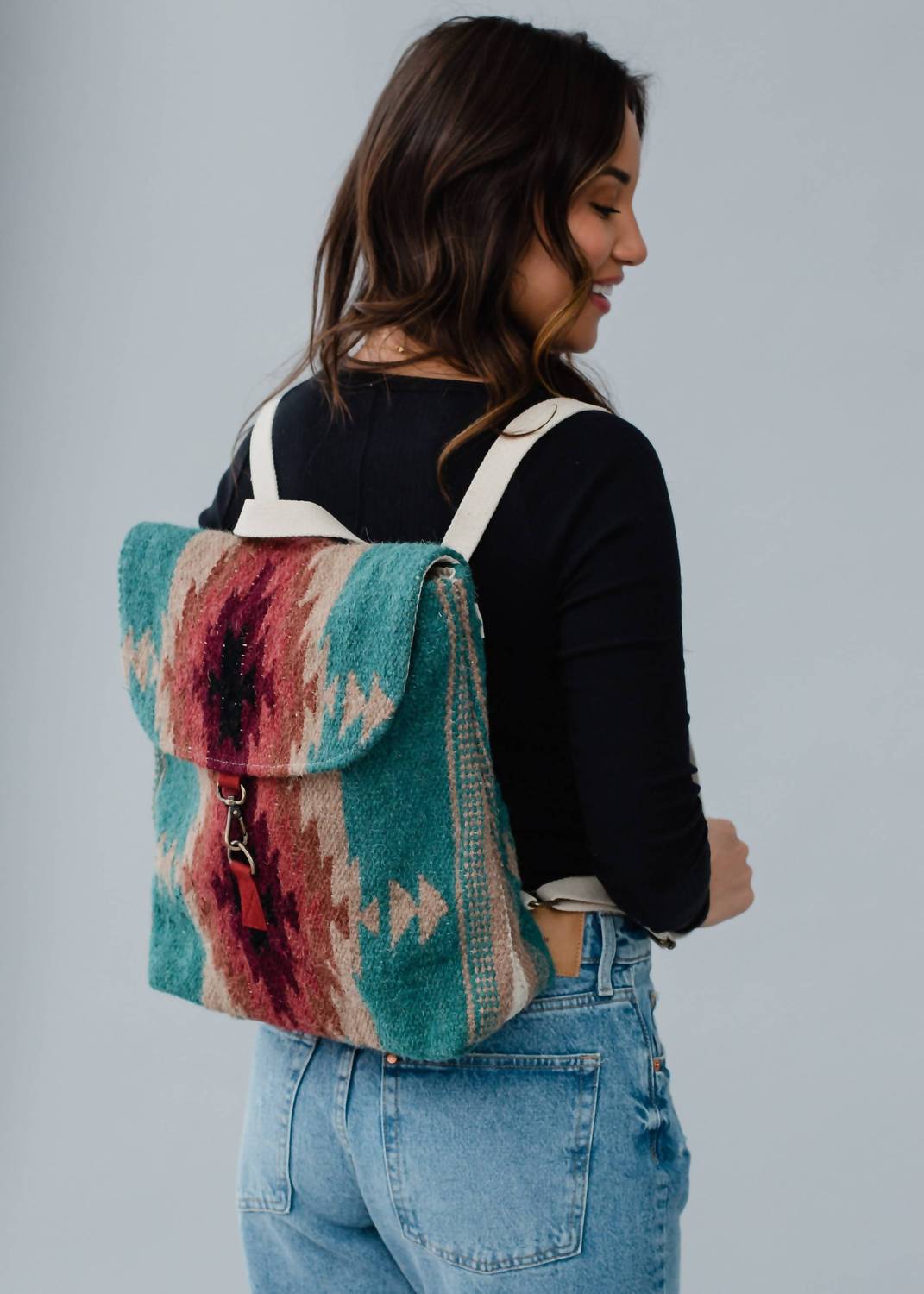 Not only functional, this backpack is stylish and fits everything you need in one place. It's a win-win! The Women's Western Southwestern Aztec Backpack by Panache Apparel combines style and functionality in a striking Teal, Burgundy, and Tan palette. Made from an 80% wool and 20% cotton blend, this backpack features a convenient clasp closure for secure storage. Measuring 14" in height, 11.5" in width, and 4.5" in depth, it offers ample space for your essentials, complemented by adjustable straps and a handle for versatile carrying options.