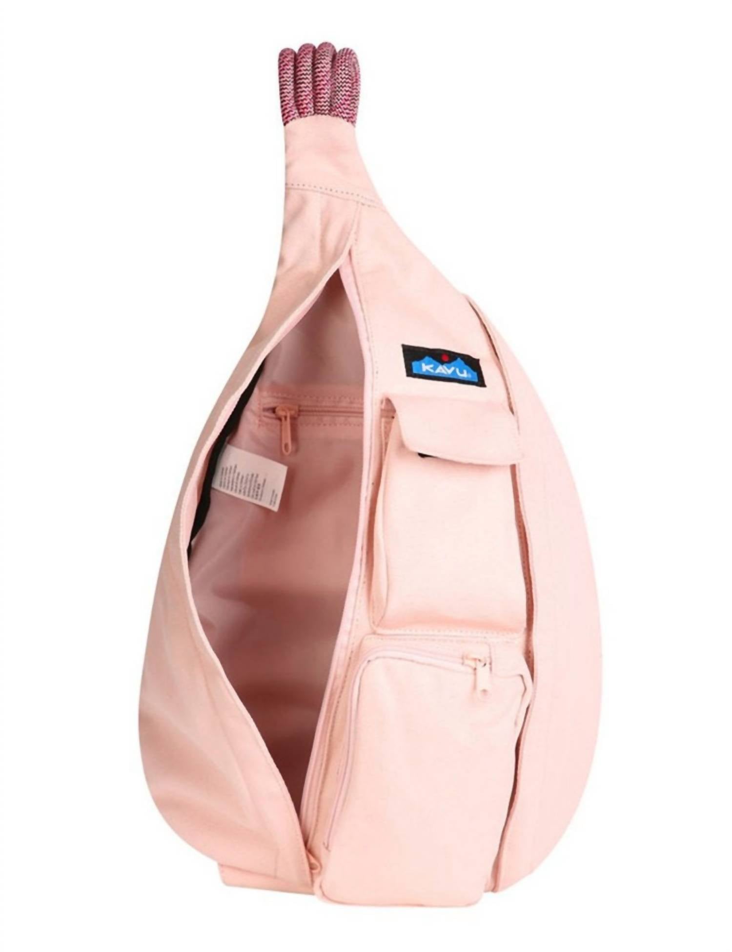 A backpack so versatile, you'll want to carry this with you everywhere. Meet the KAVU Rope Bag, the perfect companion for your adventures in stylish Rosewater. Crafted from 12oz 100% cotton canvas, this sling backpack offers adjustable rope shoulder straps with a side release buckle for comfort and easy use. It features two vertical zip compartments, two pockets for keys or cell phones, and a padded back adorned with KAVU embroidery for added comfort. With dimensions of 20" x 11" x 5" and a crossbody strap length adjustable from 22" to 44", this bag is both functional and fashionable, weighing in at just .8 lbs.