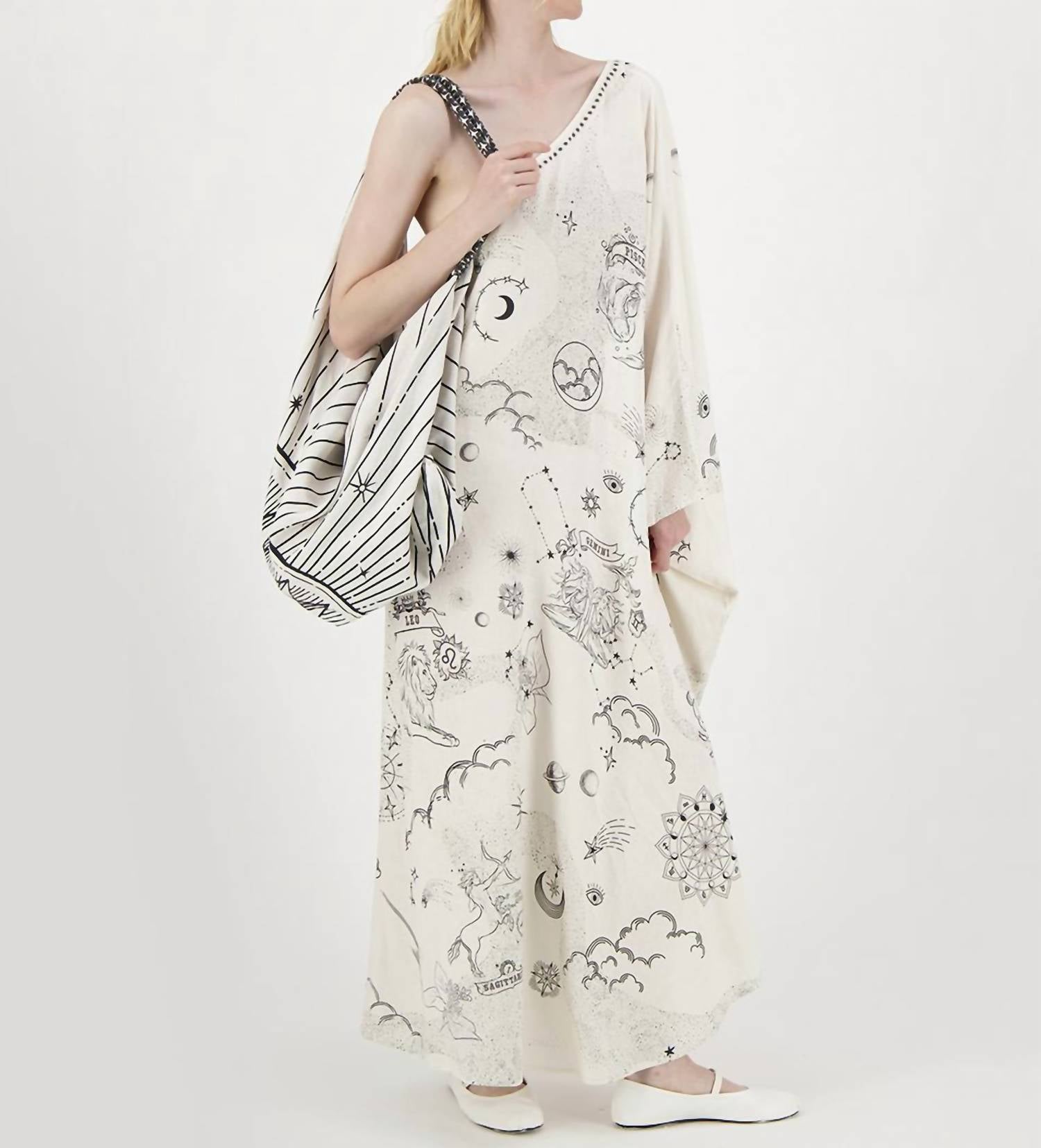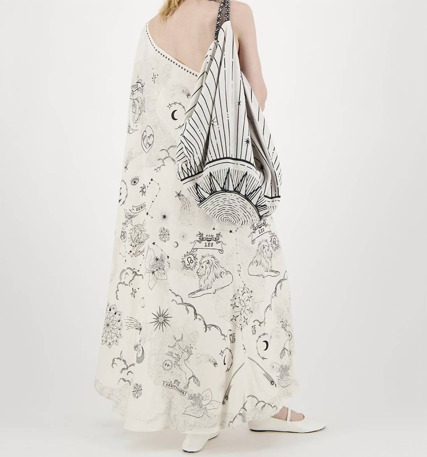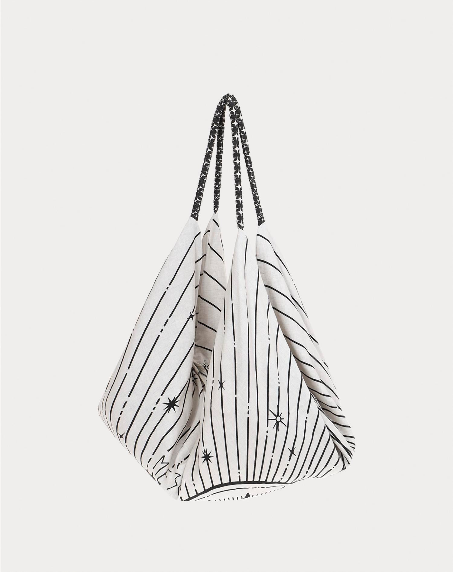 Introducing the Women's Mika Zodiac Bag by Me369, embodying energy and creativity in an off-white and black zodiac print. This slouchy shoulder bag features an open top design, perfect for your ME time, any day. The composition includes a luxurious blend of 55% linen and 45% viscose, offering a unique texture. Explore style redefined with every wear of this distinctive piece.