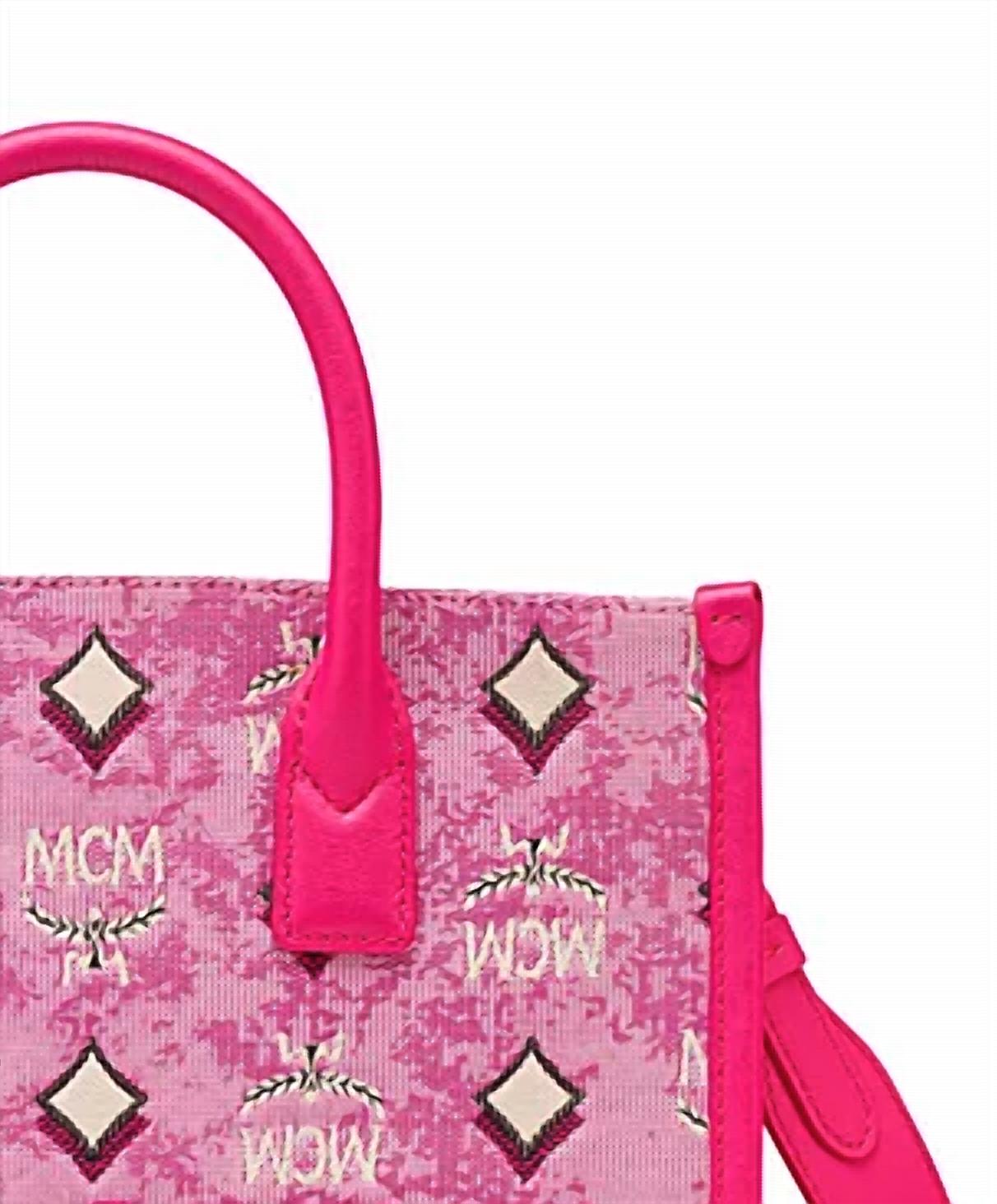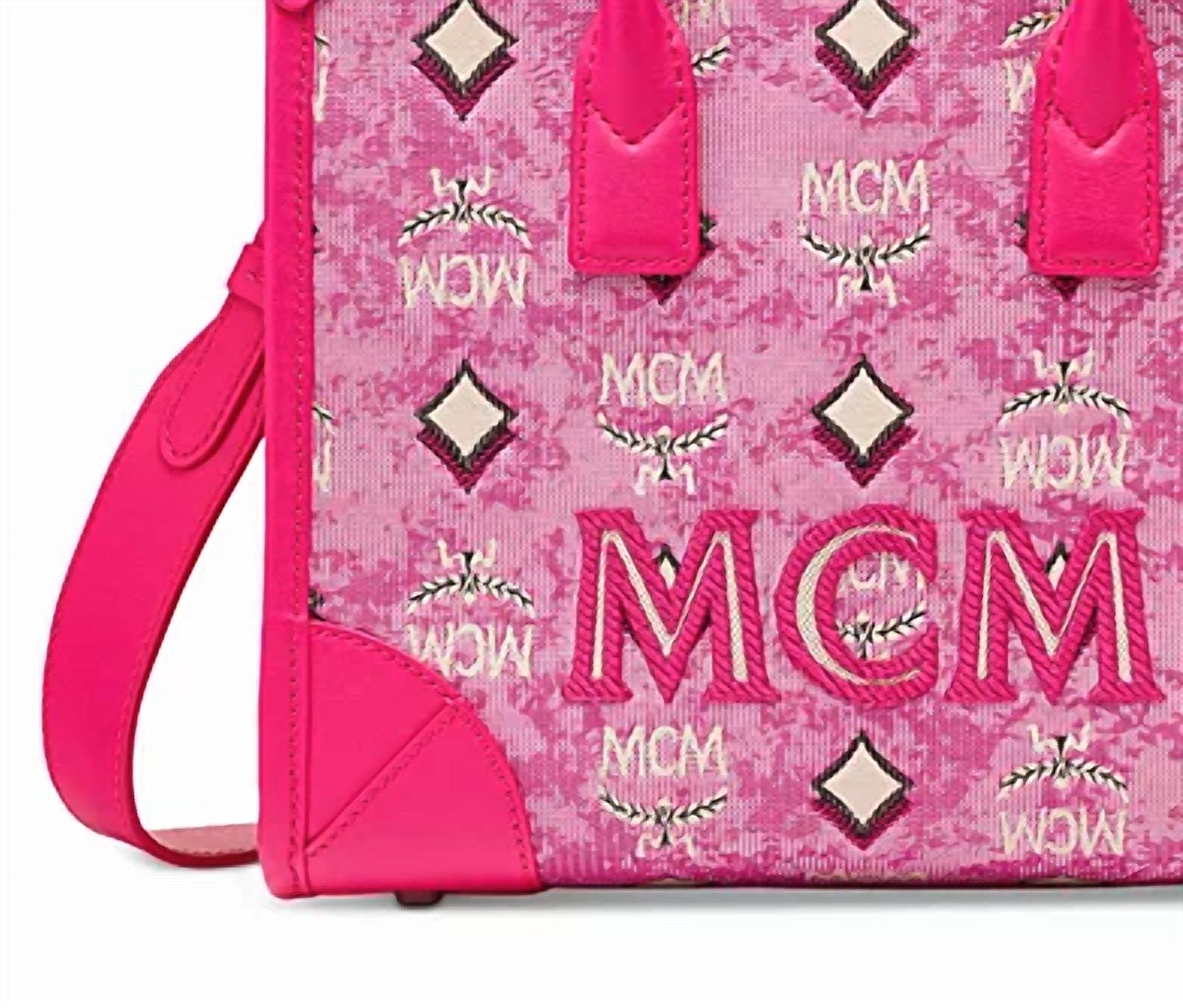Embrace elegance with the Women's München Tote Bag by MCM Worldwide, a tribute to the brand's roots in Munich. Crafted from sophisticated pink Vintage Monogram Jacquard leather, this tote boasts a spacious microfiber suede interior with ample compartments. A standout feature is the removable pouch, perfect for solo travel needs. Carry it with the plush leather handles or attach the strap for a chic hands-free option.