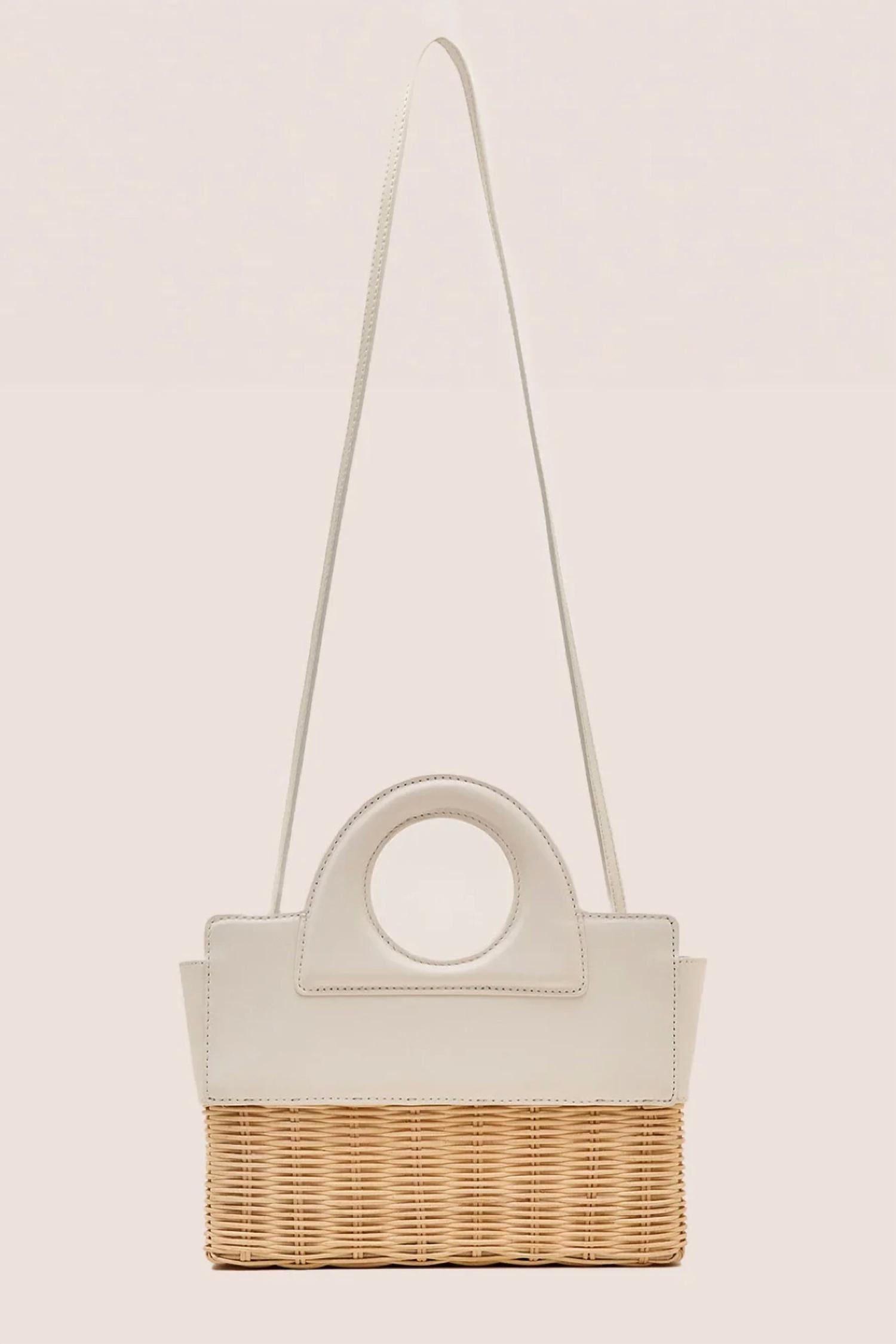 Discover the Petite Rattan Bag by ALEXIS, a timeless accessory perfect for any occasion. Crafted with a blend of leather and handwoven rattan, this structured silhouette exudes elegance in a striking white and natural colorway. It features a detachable crossbody strap and a removable interior leather pouch for versatile styling options. With dimensions of 9" L x 6.5" H x 3.75" D and a 2.5" handle drop, this bag offers ample space while maintaining a sophisticated look.