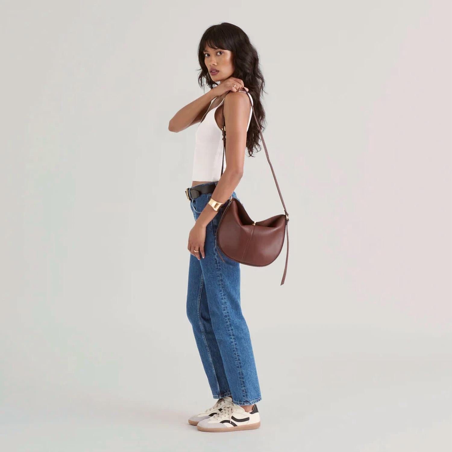 This crossbody bag will be your go-to bag of the season. Meet the Women's Burano Crossbody Handbag by Dolce Vita, a quintessential addition to your fall wardrobe. Crafted from luxurious brown leather with synthetic trim, this handbag is both understated and versatile. Featuring a magnetic snap closure, it measures 9" in height, 12" in width, and 0.5" in depth, providing ample space with an interior slip pocket. With a 24" crossbody strap drop, it offers convenient hands-free wear, perfectly complementing any outfit.