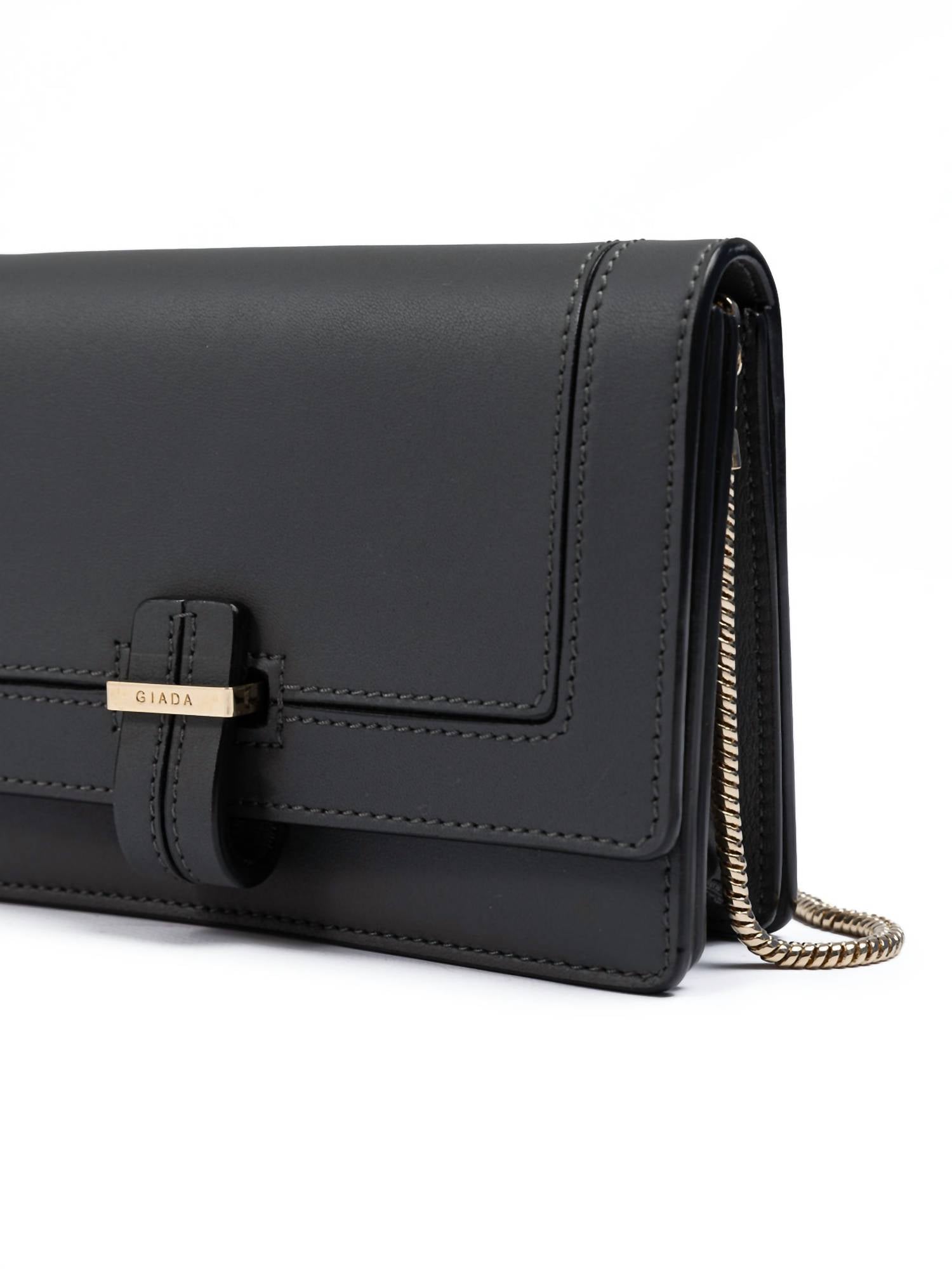 The perfect clutch for an evening out on the town. Introducing the Women's Leather Clutch Bag by Giada, an embodiment of Italian craftsmanship in an exclusive dark grey hue. Crafted from premium leather, this clutch features light-gold logo engraved metal hardware for a touch of elegance. Dimensions are H 12 cm x L 18 cm x D 5.5 cm, offering ample space for your essentials. Made in Italy, this piece combines functionality with refined style, perfect for any occasion.