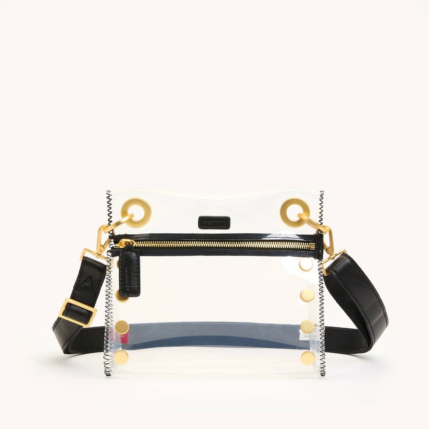 A casual and cute take on everyone's favorite crossbody bag. Introducing the Women's Tony Small Clear Handbag by Hammitt, a chic accessory in a striking Black/Brushed Gold color palette. This handbag, perfect for carrying your must-have essentials, measures 8" L x 2" W x 7.5" H. It features an adjustable strap that's 1" wide and extends to 52" in length, offering customizable wear. Crafted with care and functionality, it seamlessly blends style and convenience.