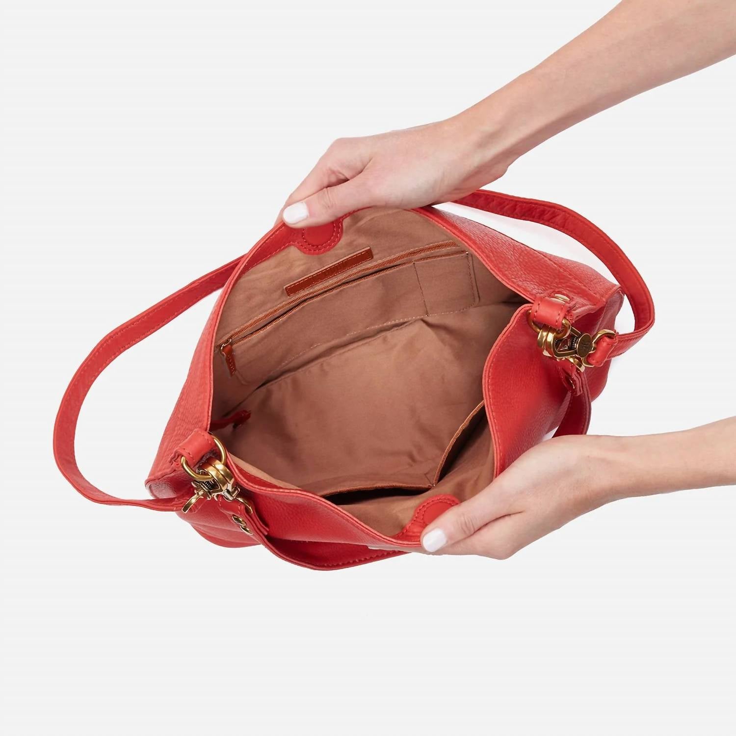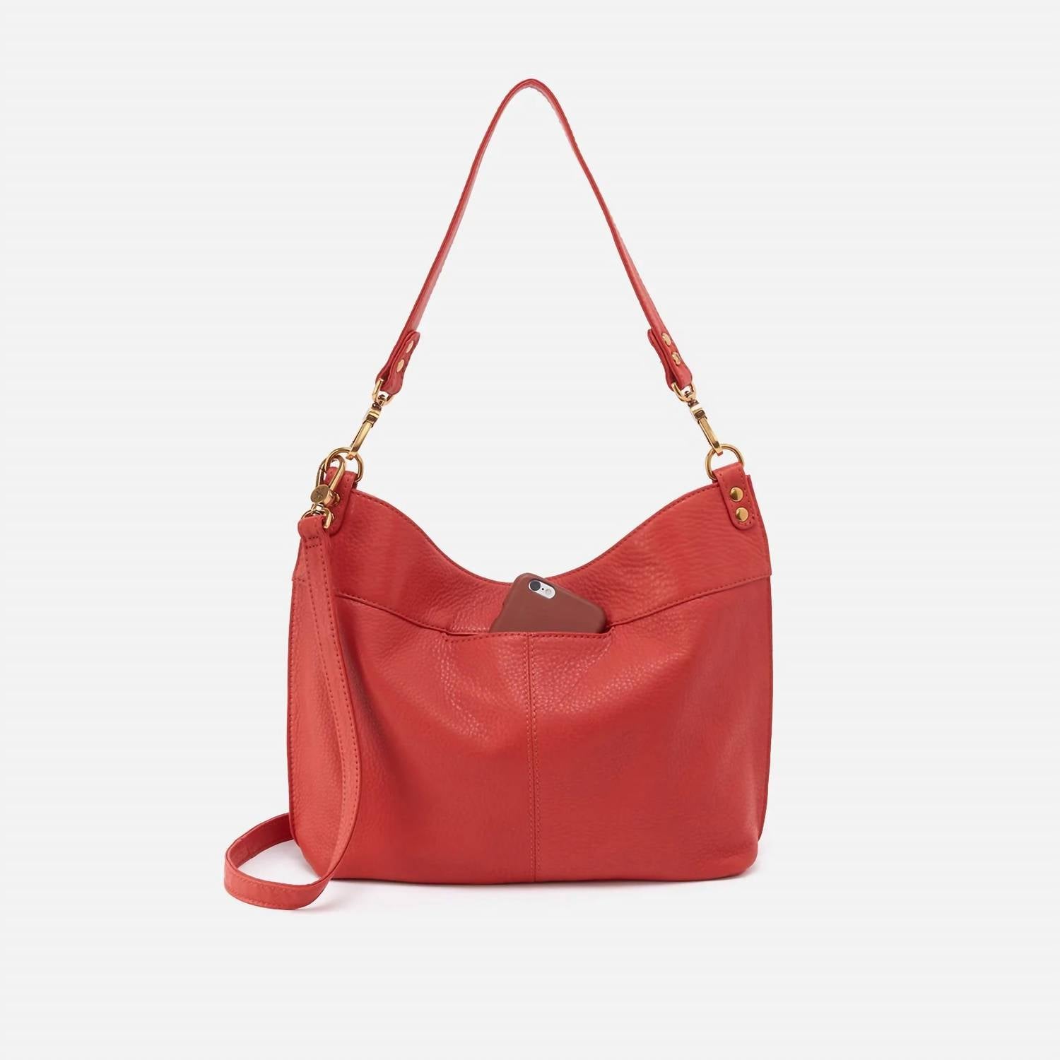 A convertible shoulder bag + crossbody with two removable straps. Pier has a soft structured shape, hidden magnet closure and spacious interior, plus two strap options for easily changing up your look. DETAILSOld English Brass Hardware. Hidden Magnet Closure. Exterior Back: Signature phone pocket. Interior Front: 2 slip pockets; Interior Back: Zip pocket, slip pocket & pen pocket. Fits your phone and most tablets. Wear as a crossbody or a shoulder bag by adjusting the convertible and removable straps. Sandlewood Lining. Sold leather double straps. 11" Short Strap Drop; 20" Long Strap Drop. 12.5" W x 10" H x 4" D. SO-82303KOI