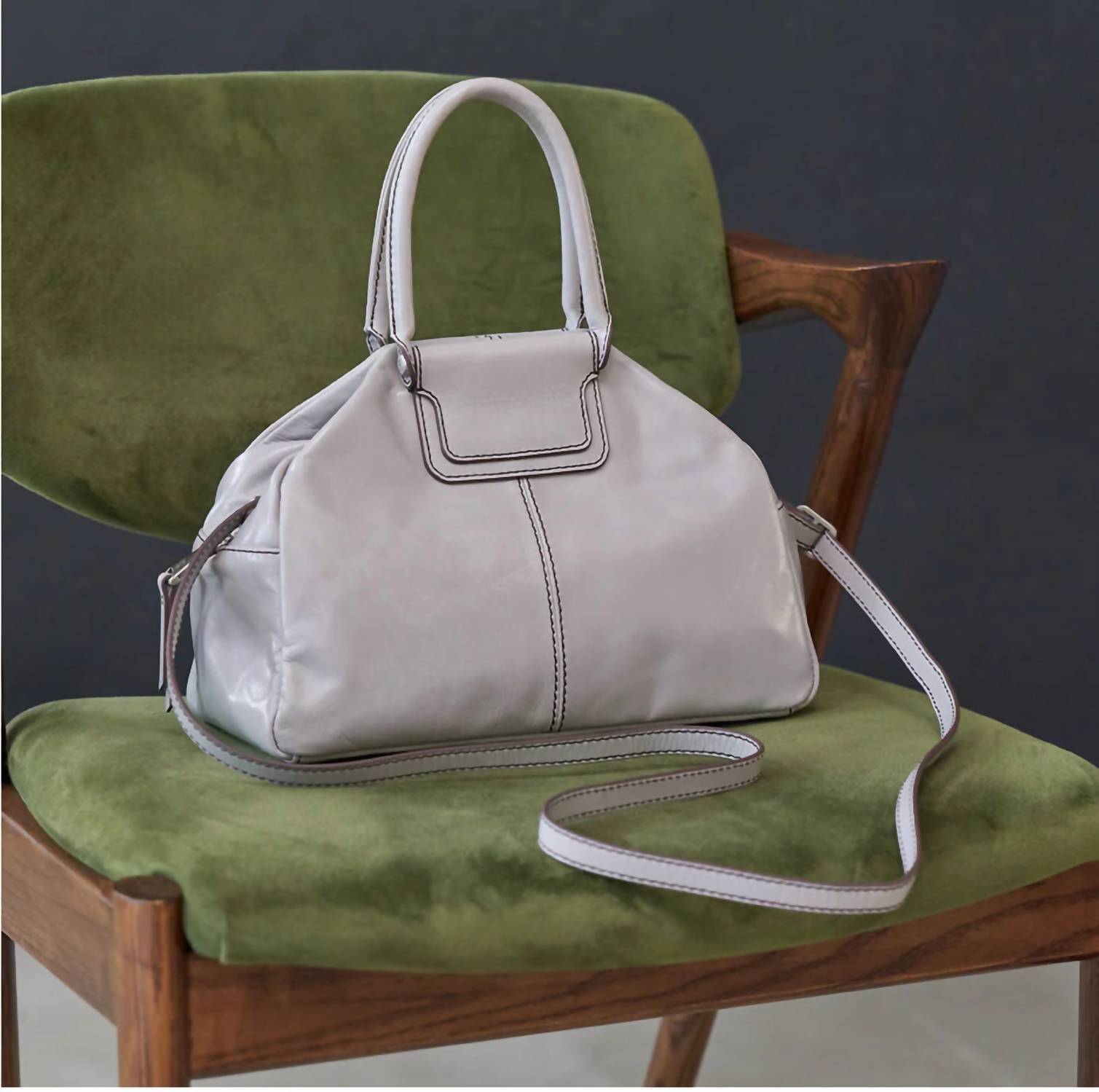 The carry-all satchel of the season. Experience the exquisite craftsmanship of the Women's Sheila Drop Handle Satchel Bag by HOBO in a sophisticated Light Grey hue. This stylish satchel, made from premium leather, features brushed antique brass hardware and a practical top zip with magnetic closure. Designed with versatility in mind, it includes a solid leather single strap with a 23.5" drop that can be removed for top-handle carry. Measuring 11" W x 8" H x 5" D, it boasts a sandlewood lining, fitting your phone comfortably while offering ample interior pockets for easy organization.