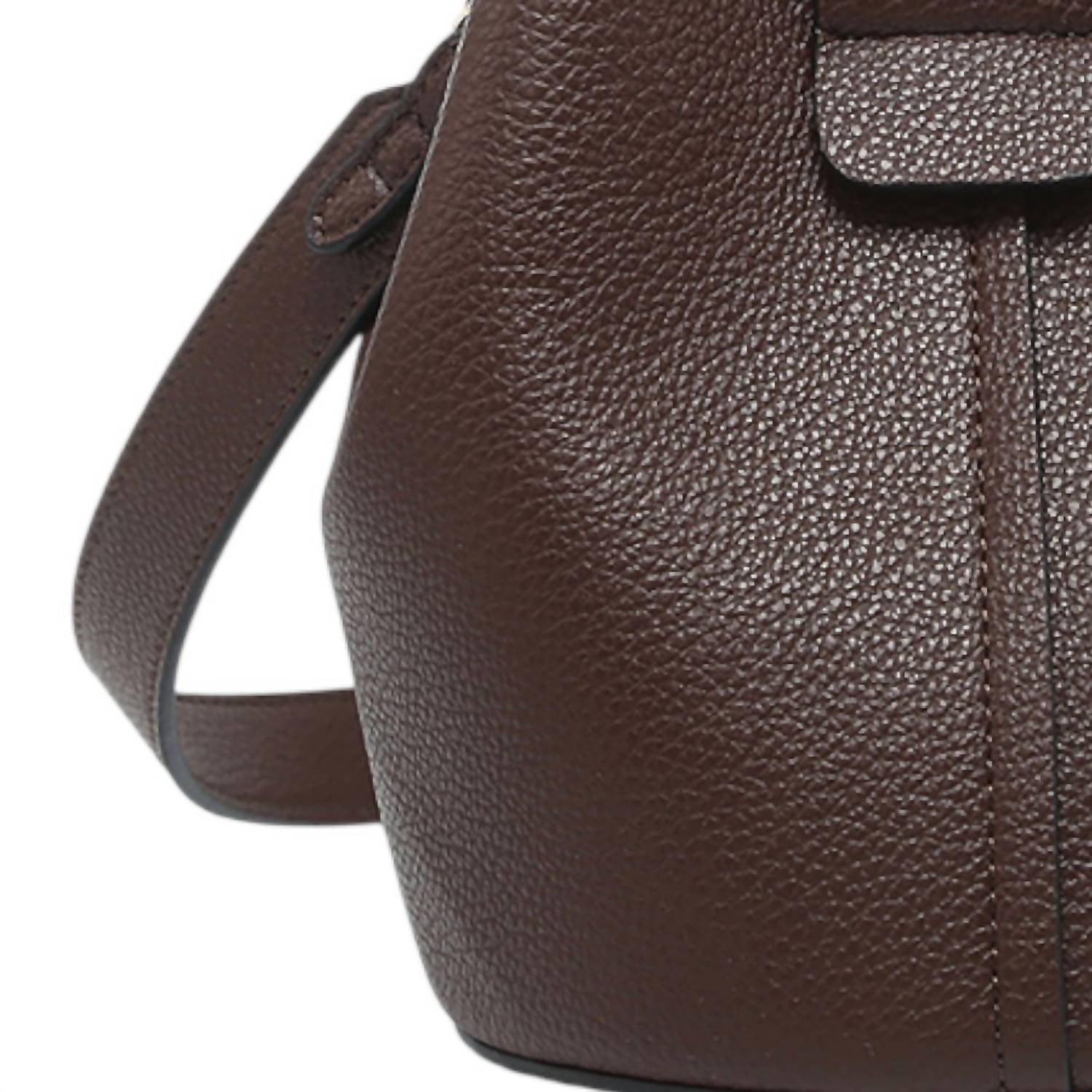 Introducing the Women's Farrah Bucket Bag by Jen & Co. in a rich Espresso hue, designed to blend fashion with function. This shoulder bag features a classic bucket design with a top handle and removable strap for versatile wear. The snap closures ensure your belongings are secure, while a small inner bag offers additional storage. Dimensions are 10 inches in length, 7.5 inches in height, and 6.5 inches in depth.