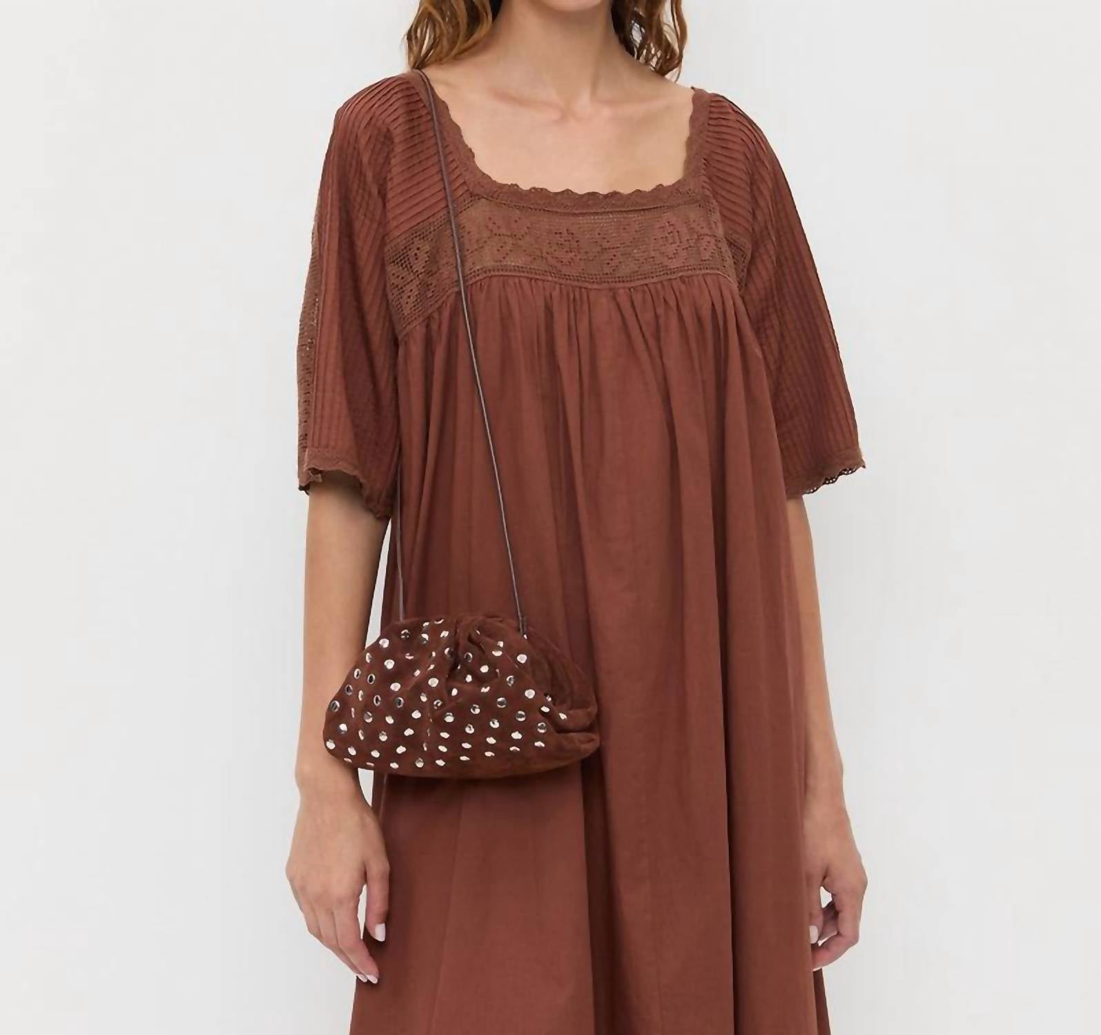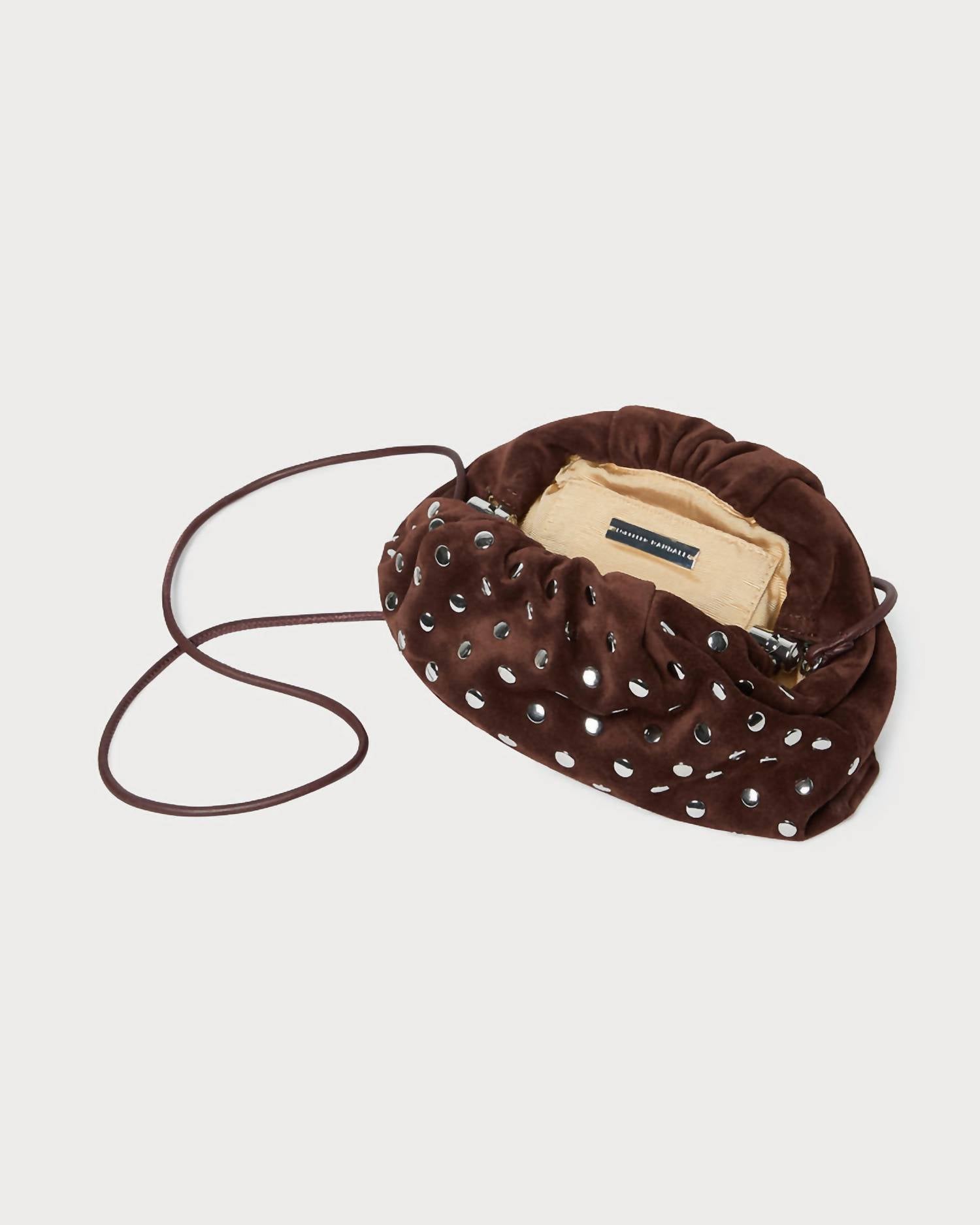 The perfect clutch for an evening out on the town. Elevate your style with the Women's Bailey Dome Clutch by Loeffler Randall, crafted in rich espresso brown Italian suede accented with silver-stud embellishments. This elegant pouch features a dome-shaped frame and tonal leather strap, making it perfect for modern sophistication. With a secure frame closure and a fully lined interior featuring a built-in card slot, it combines luxury with practical design. Material: 100% Bovine Leather. Dimensions: 9" W x 3" D x 5" H, with a 17" removable strap. Care: Suede is delicate; store in a dust bag and avoid water to maintain its plush texture.