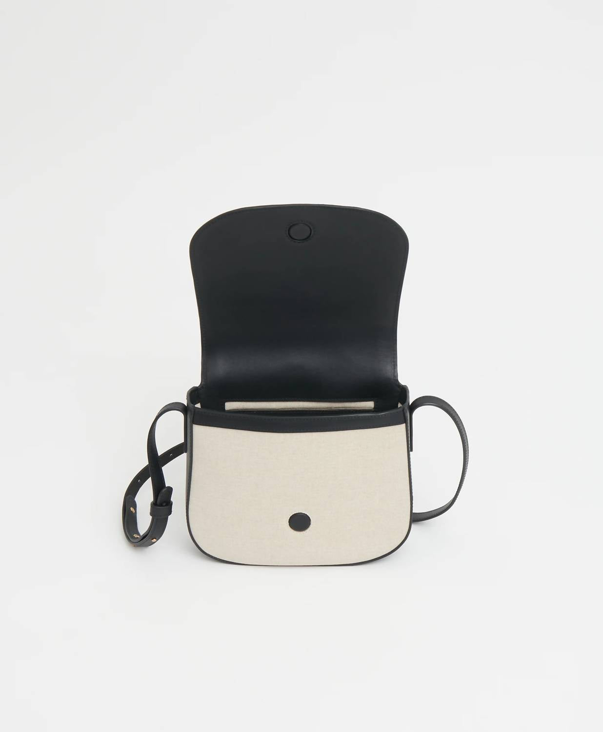 This crossbody bag will be your go-to bag of the season. Introducing the Women's Classic Crossbody by Mansur Gavriel, crafted in an elegant Natural/black hue. This bag is made from a lightweight blend of 59% Linen and 41% Cotton, accented with premium Italian vegetable tanned leather trim. It features a sleek, slim design with an adjustable strap and a magnetic closure, perfect for effortless everyday wear. Dimensions are 8.5 inches in width, 7.5 inches in height, and 1.9 inches in depth, with a crossbody drop ranging from 17.3 inches to 22.4 inches for optimal comfort. Made in Italy, it weighs just 15 ounces for lightweight convenience.