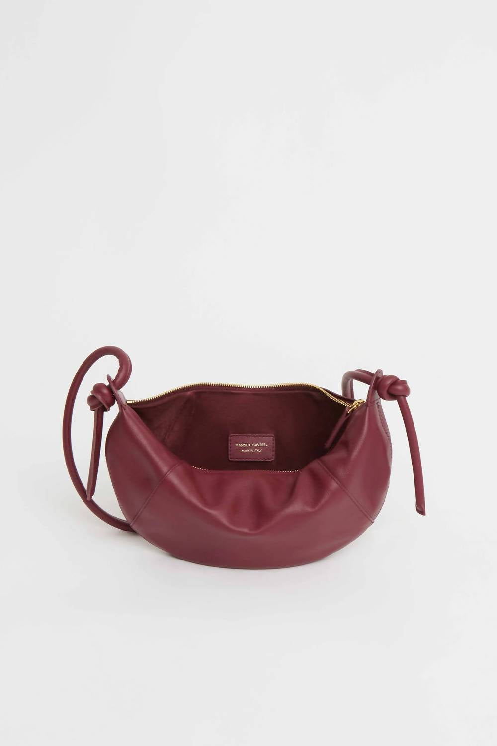 The crossbody bag is a trend that is here to stay and we especially love this style. The Women's Mini Fortuna Crossbody Bag by Mansur Gavriel is a stylish accessory crafted from 100% oxblood Italian leather, offering a sophisticated and slouchy crescent shape that drapes effortlessly. Featuring a zip top closure and an elegant leather shoulder strap with a knot detail, this crossbody bag seamlessly blends functionality with chic design. Proudly made in Italy, the compact dimensions of 6.69" in height and 5.12" in width make it an ideal yet fashionable choice for carrying essentials.