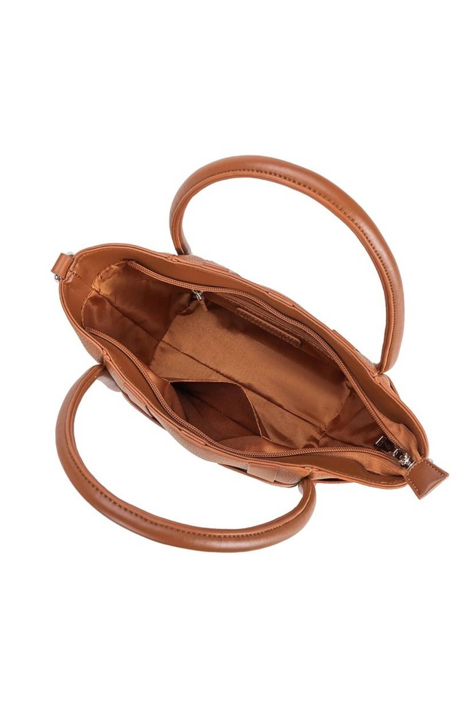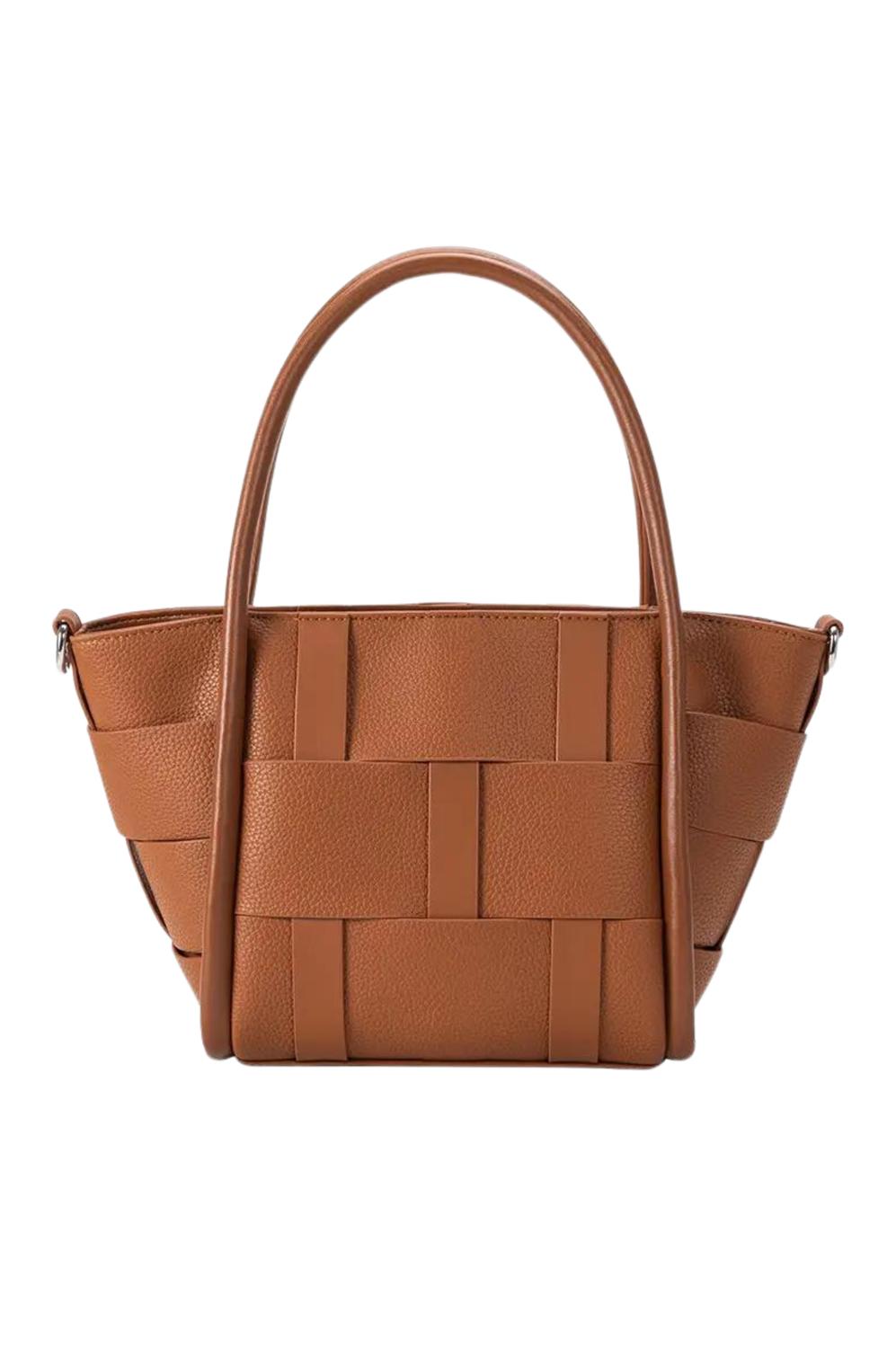 This crossbody bag will be your go-to bag of the season. Introducing the Women's Lanie Saddle Recycled Vegan Crossbody Bag by Melie Bianco, a timeless accessory with a refined touch in saddle color. Crafted with recycled vegan leather in a classic silhouette, this elegant bag measures 12"W x 7"H x 4.5"D, and features a convenient zipper closure. It showcases wide woven strips, a handle drop of 6", and a strap length adjustable between 45"-51". Enhanced with silver hardware and an OEKO-TEX certified lining, it accommodates items like the iPhone 14 Pro, offering both luxury and sustainability.