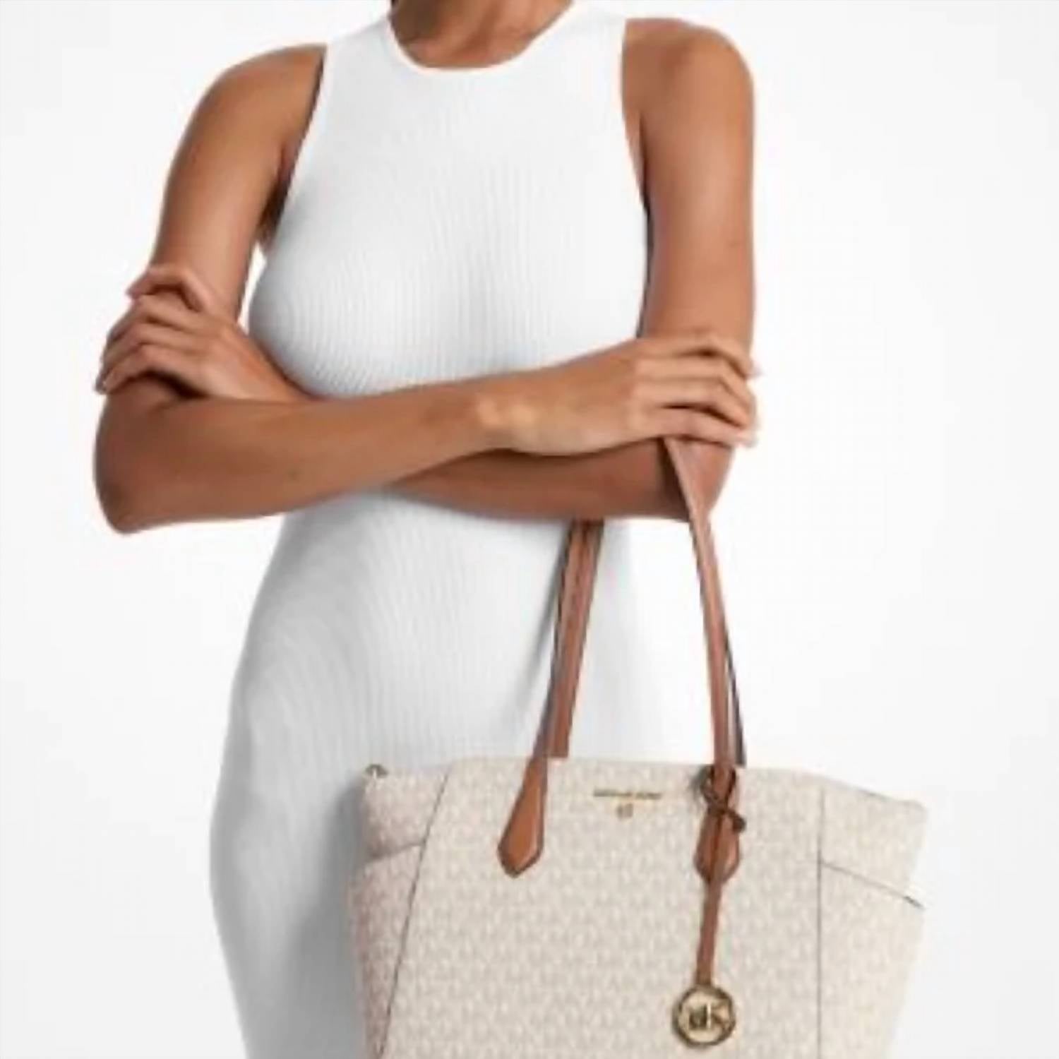 The carry-all tote bag of the season. Get in vacation mode with this perfectly sized tote bag that is the perfect accessory for beach days, pool parties, or sunset dinners. Our Marilyn carryall is the ultimate tote bag for everyday wear. The brand’s iconic “MK” initials leave a memorable mark, while the structured silhouette unzips to reveal a spacious interior with dedicated pockets for your daily essentials. We love how the slender leather straps easily slip over your shoulder to ensure on-the-go ease. Tote bag • Logo-print canvas • 89.4% coated canvas/9.6% polyester/1% polyurethane • Gold-tone hardware • 15”W X 10”H X 4.75”D • Handle drop: 9.5” • Exterior details: 2 side slip pockets • Interior details: back zip pocket, 2 front slip pockets • Lining: 100% polyester • Zip fastening • Imported •Dust bag not included • Style # 30S2G6AT2B