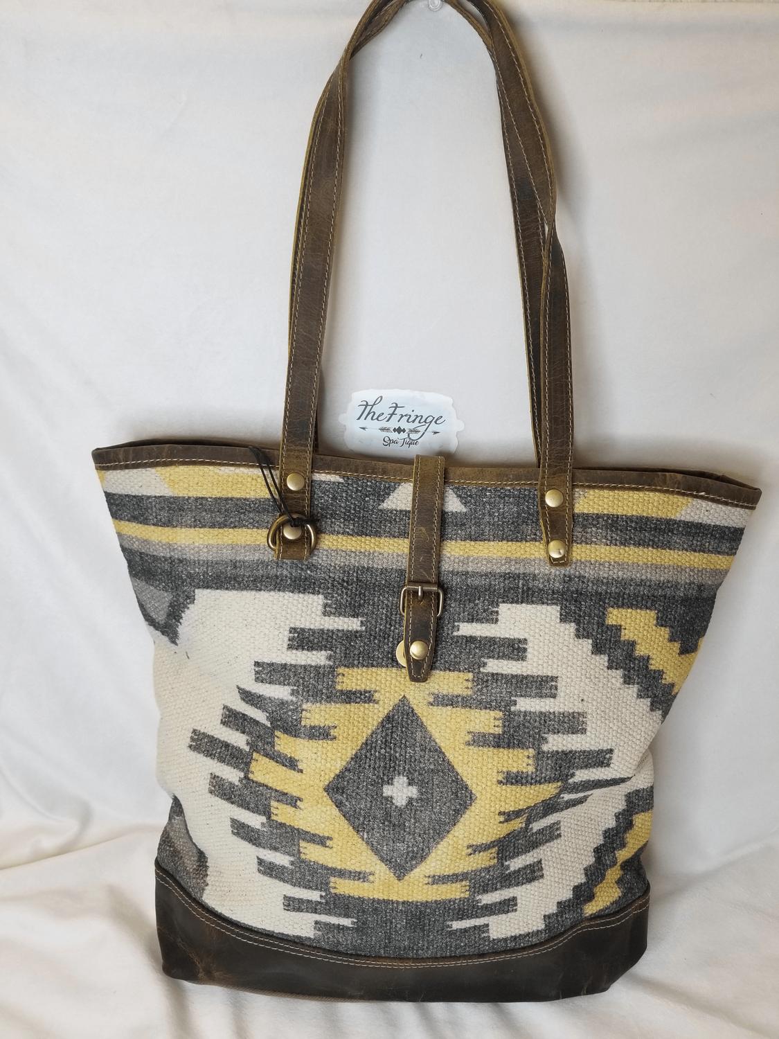 The carry-all tote bag of the season. Get in vacation mode with this perfectly sized tote bag that is the perfect accessory for beach days, pool parties, or sunset dinners. Discover the Women's Patchy Tote Bag by Myra Bags, a chic accessory with a distinctive handwoven rug design. This tote features a practical back zip and interior card slots, ensuring your essentials are organized and within easy reach. Available in a vibrant yellow hue, it offers both style and function for your everyday needs. Note: Country of origin is not specified.