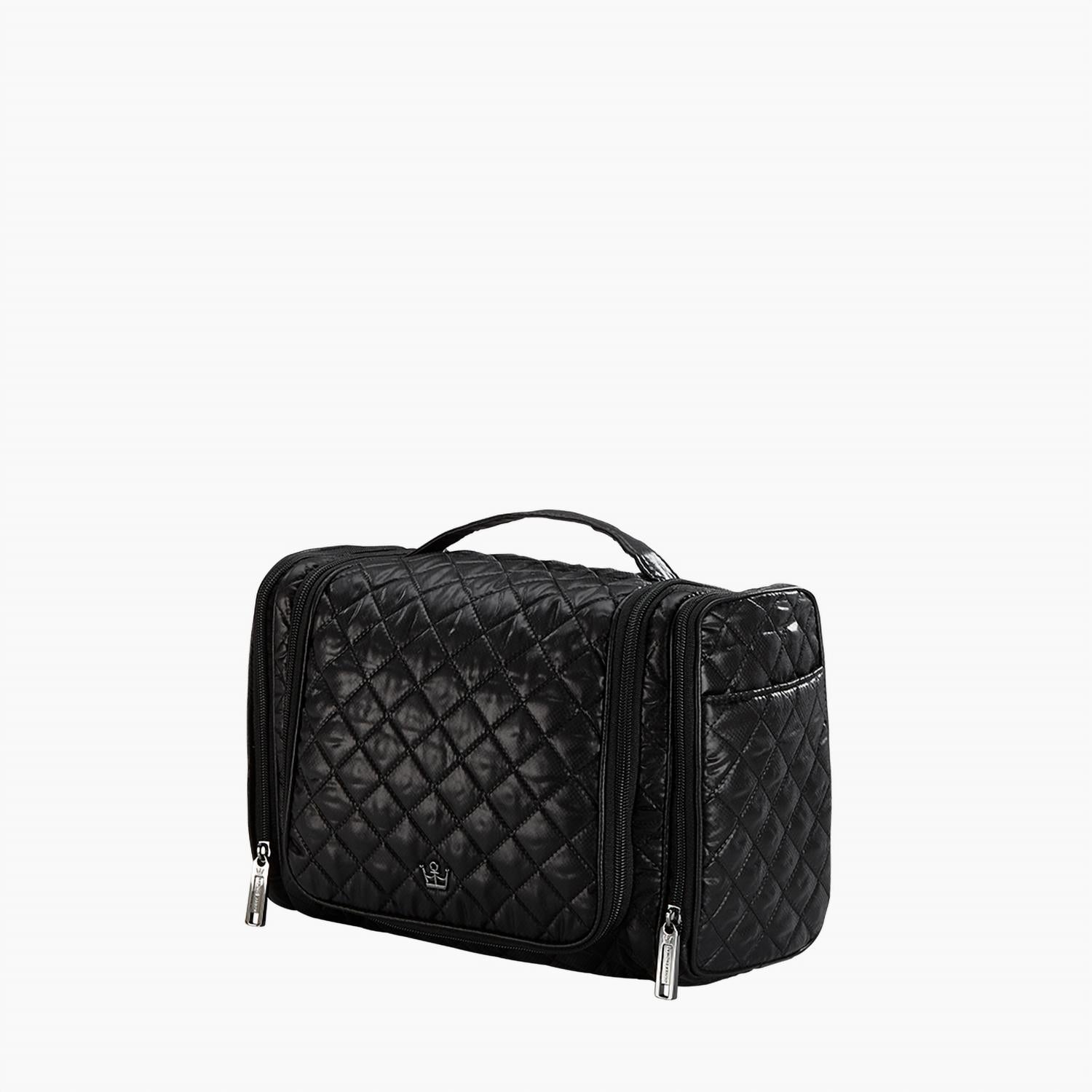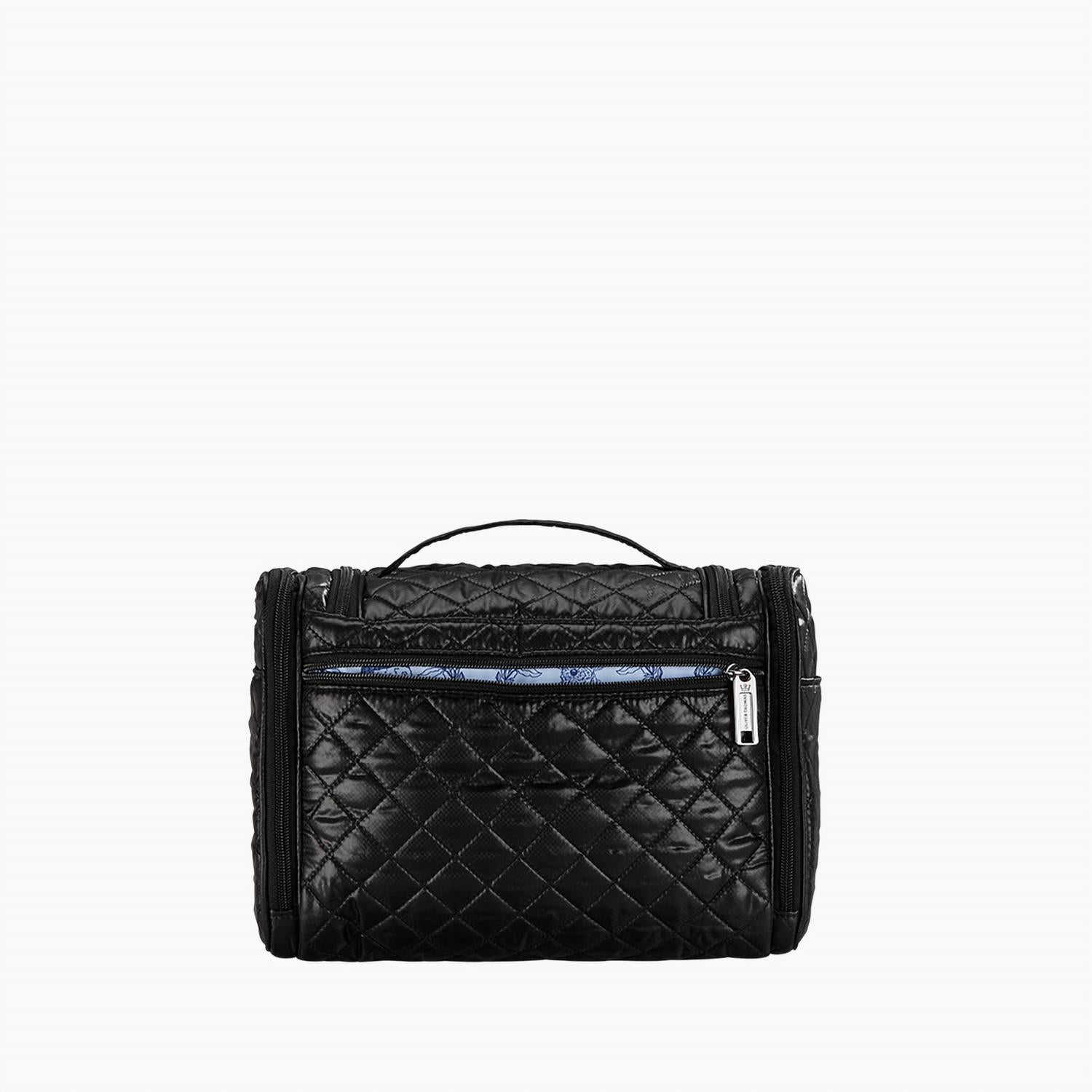 A stylish bag to use for makeup, skincare, or anything else you might want to travel with in style. Introducing the Women's Hanging Travel Organizer by Oliver Thomas, your ultimate travel companion in sleek black. This handy organizer is made from 100% down-like quilted coated jacquard polyester, ensuring durability and style. With a U shape zipper opening, top carry handle, and a range of pockets including two side slip pockets and a large zipper back pocket, this bag is designed to keep all your beauty essentials secure and organized. Internally, it features a secure hanging travel hook, two large mesh pockets, and eight separate mesh slip pockets, perfectly accommodating all your needs. Dimensions: 11.5" Length x 5" Width x 8.5" Height.