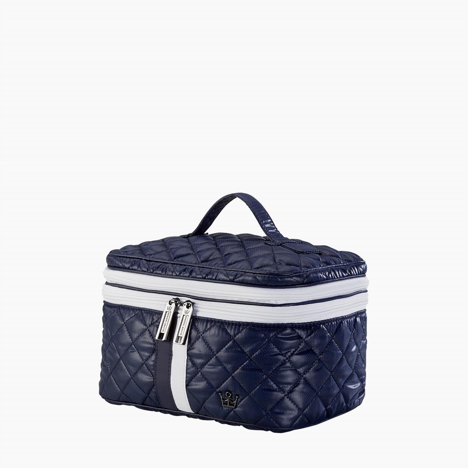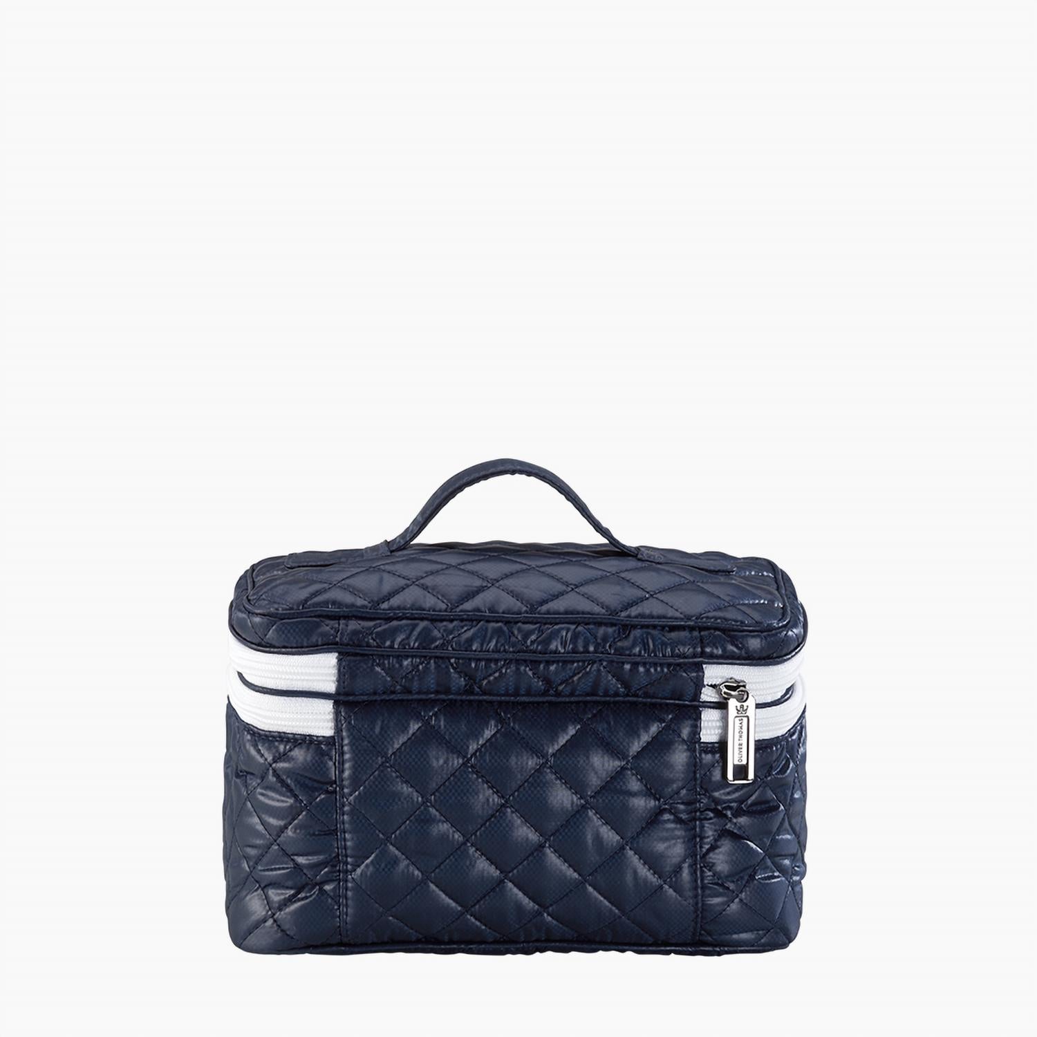 The coolest makeup bag that fits everything you need. Meet the Women's Kst Trainwreck Case by Oliver Thomas, a chic and versatile addition to your accessory collection. Crafted from down-like quilted jacquard polyester, it offers a plush yet durable design in a sophisticated dark navy and white stripe. Measuring 6 inches in width and 5 inches in height, this cosmetic case is perfect for organizing your essentials with a touch of elegance. Whether at home or on the go, it's a stylish solution for all your beauty needs.