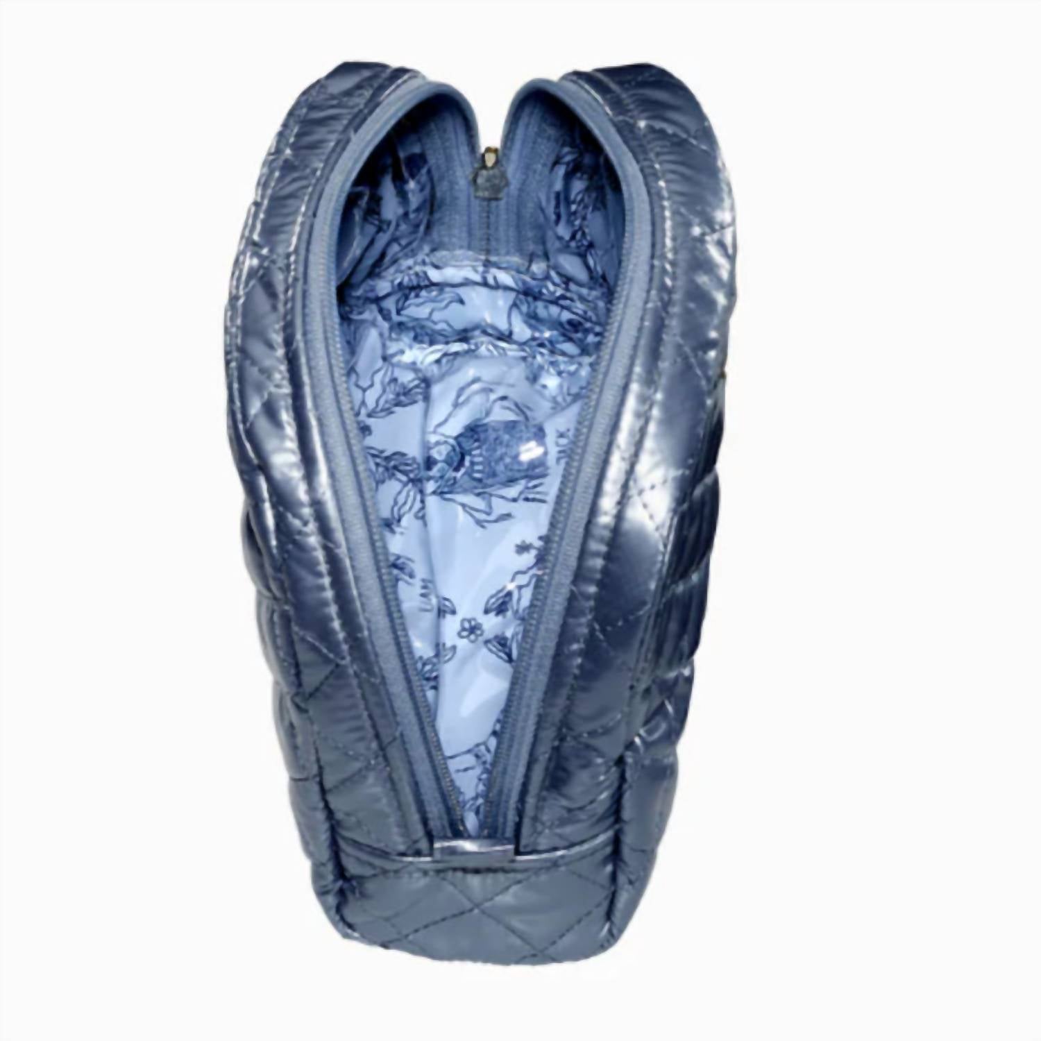 The perfect makeup bag for all your essentials. Experience ultimate organization with the Women's Kst Xl Cosmetic Case by Oliver Thomas in Ice Queen. Crafted from 100% down-like quilted coated jacquard polyester, this case combines style and function with its two separate zipper compartments for organizing liquids and powders. Measuring 10.5" in length, 4.5" in width, and 7" in height, it offers ample space for all your beauty essentials. Designed with metal hardware, this chic accessory ensures you'll always have your essentials at hand, while being easy to clean thanks to its wipeable interior.