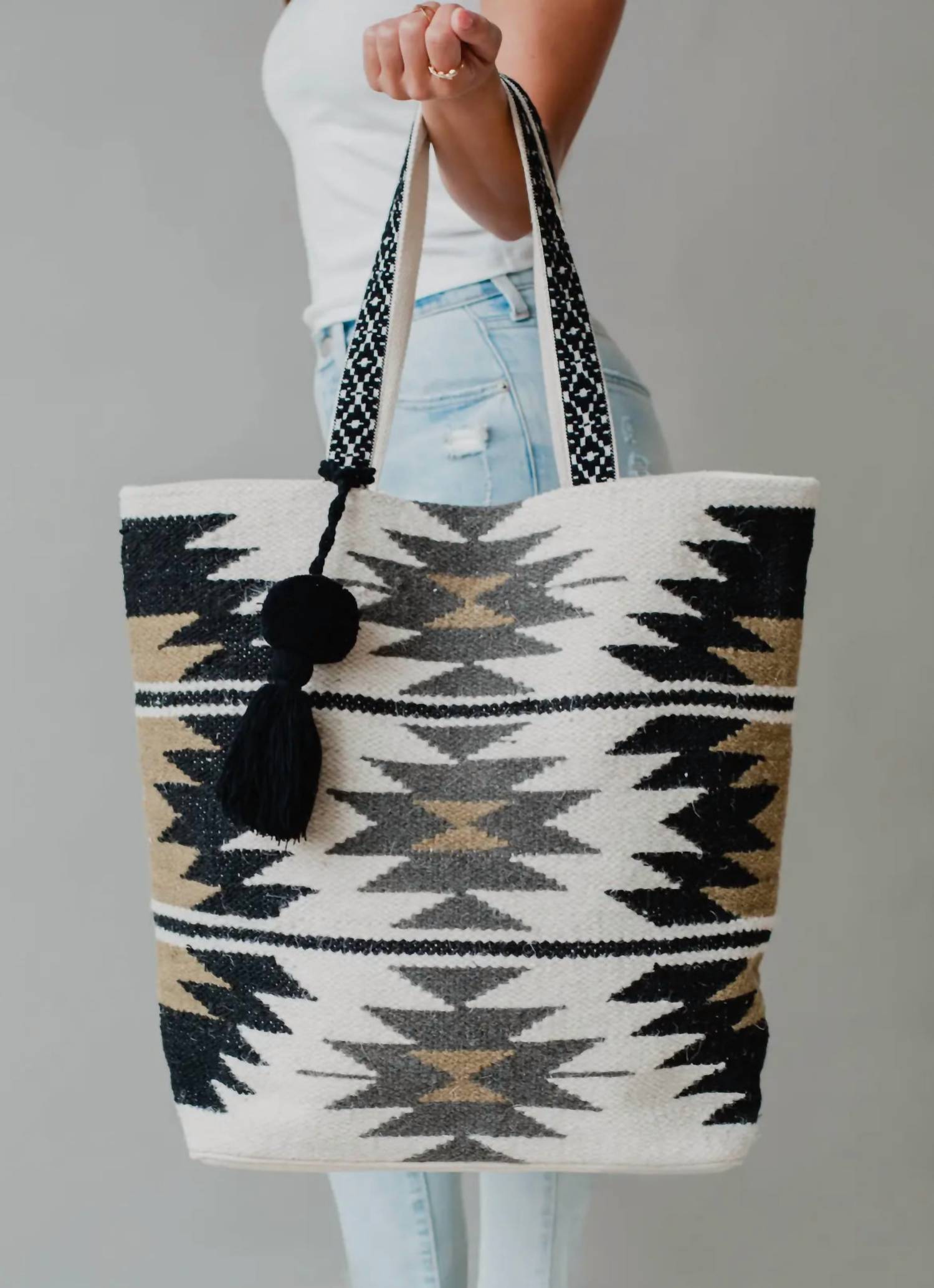 The carry-all tote bag of the season. Get in vacation mode with this perfectly sized tote bag that is the perfect accessory for beach days, pool parties, or sunset dinners. Meet the Aztec Tote Bag by Panache Apparel, a stylish addition to your accessory collection. Crafted from 100% cotton in light brown and cream Aztec patterns, this tote offers a chic look with its leather straps and a removable burnt orange pom tassel detail. Measuring 16" x 6" x 16", it is both spacious and practical for daily use. Elevate your ensemble with this fashionable and functional tote.