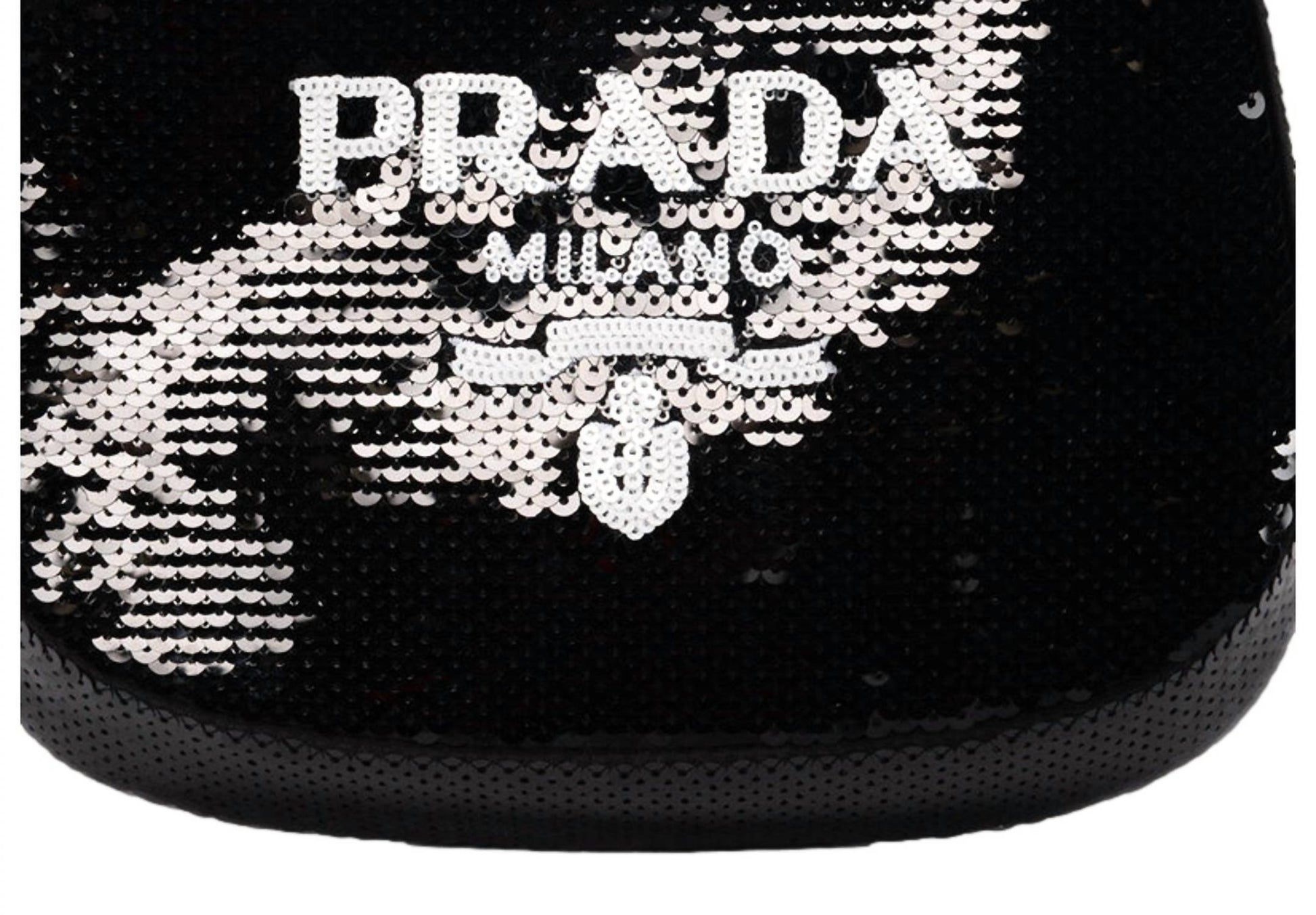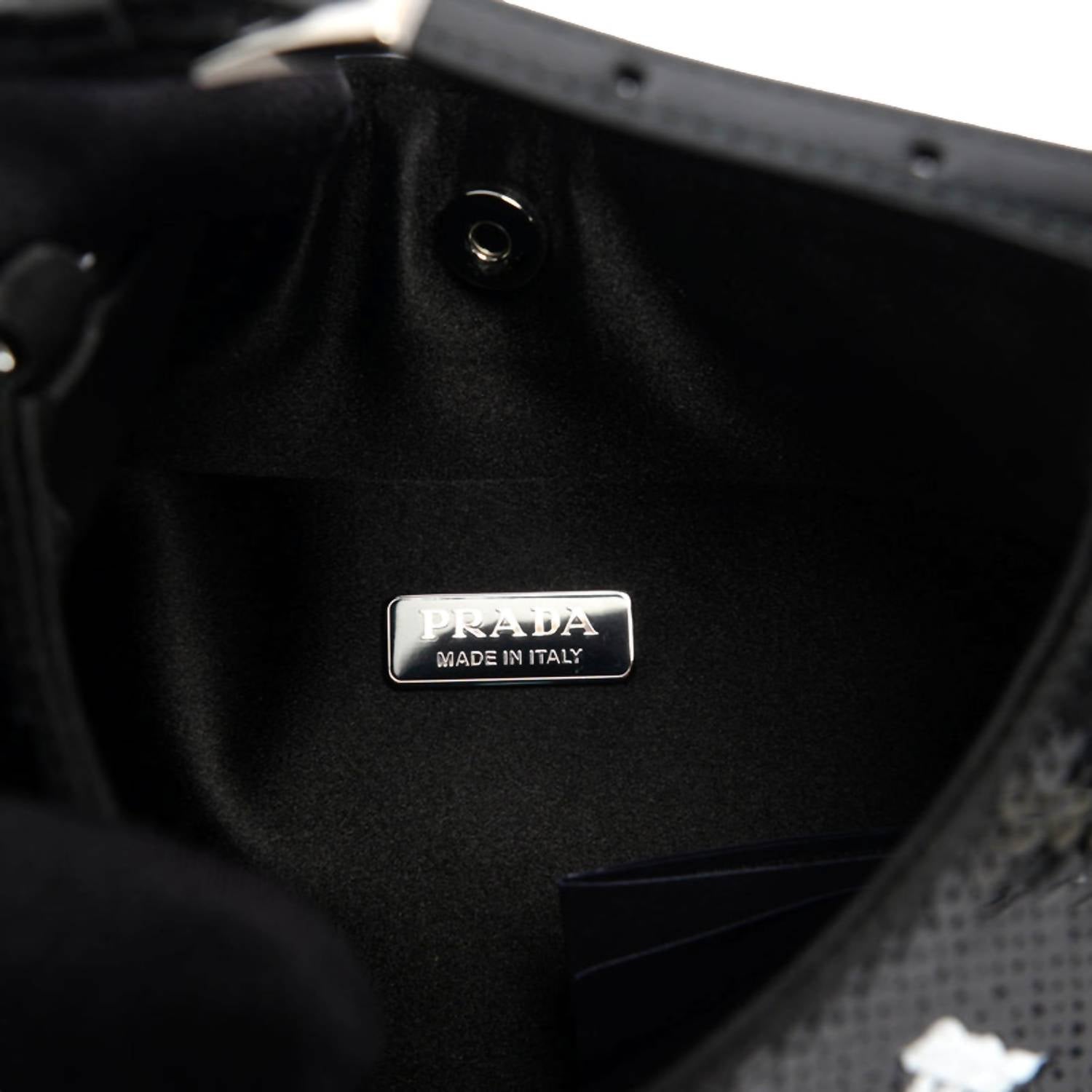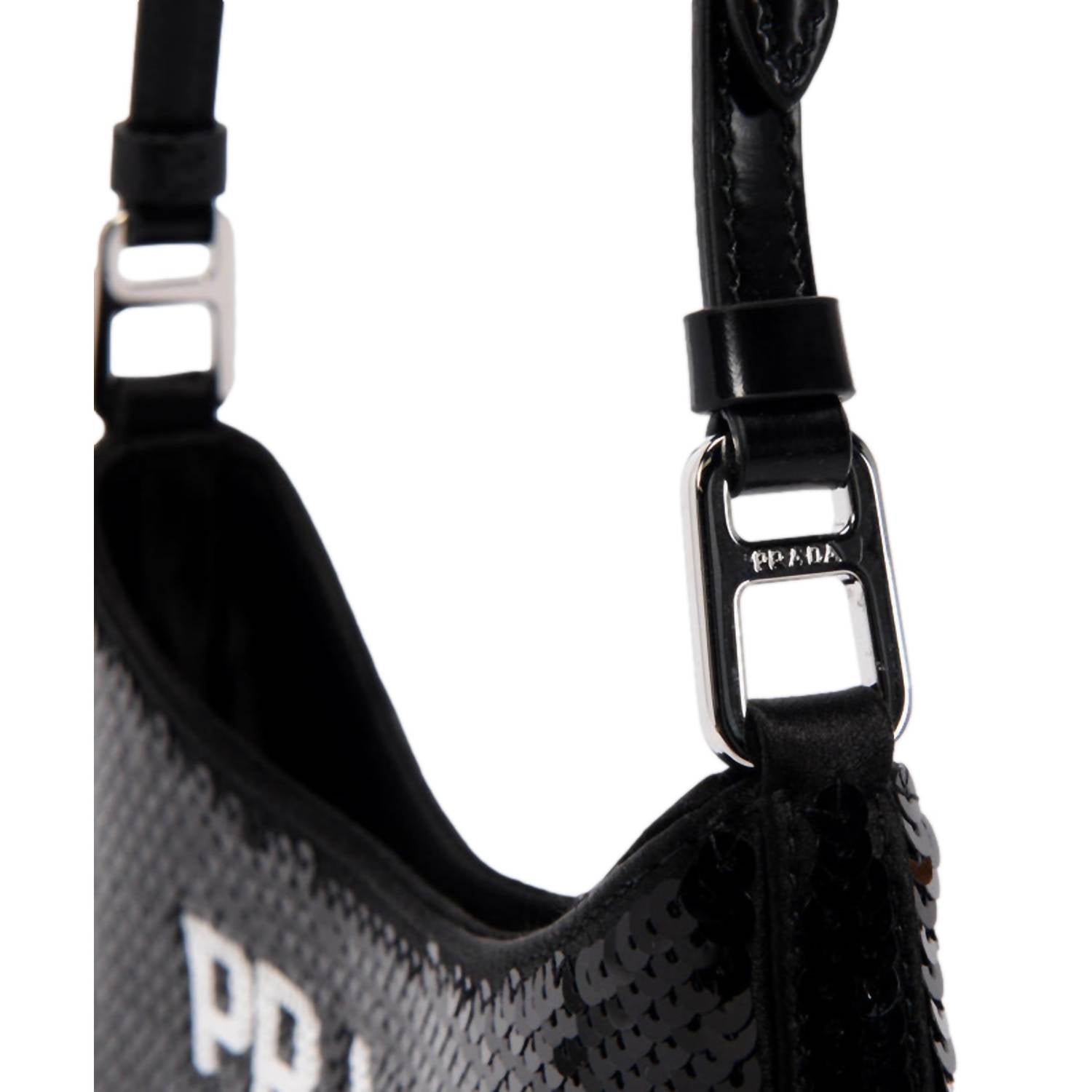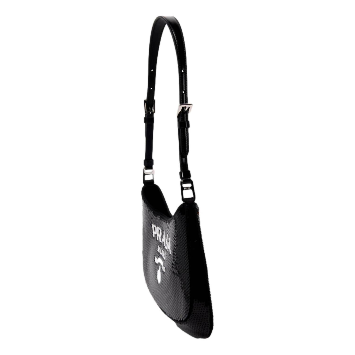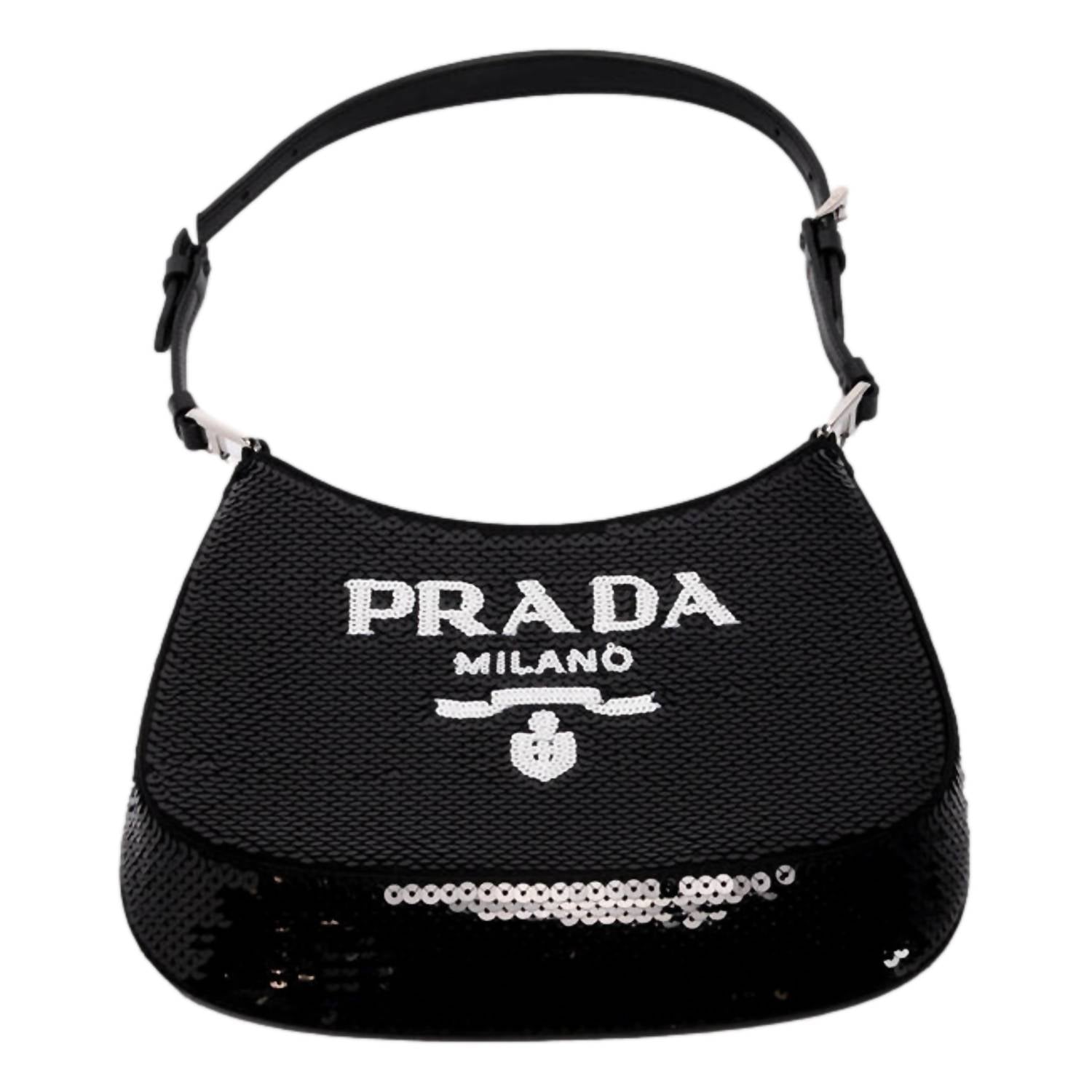 Make a bold statement with Prada's Cleo Sequin Milano Logo Mini Leather Shoulder Bag, the epitome of Y2K glam blended with modern luxury. This shoulder bag is crafted with a sleek leather strap and adorned with striking black and white sequins. It features a snap closure, adding a touch of convenience and security to your essentials. The interior boasts black satin lining with a single slip pocket, perfect for evenings out or making a street style statement. Made in Italy, it includes a Prada dust bag, adjustable strap, and authenticity card. Dimensions are 9" x 1" x 6" with a handle drop of 9" and a strap drop of 16" max.